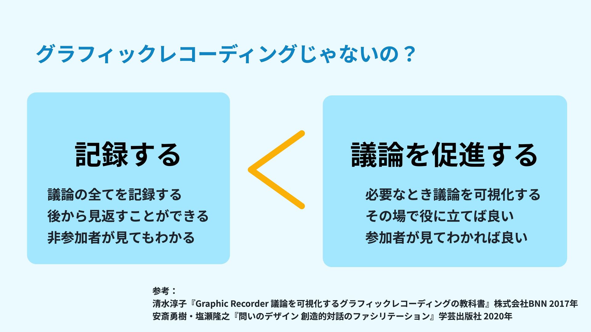 2. グラフィックレコーディングじゃないの? 議論を促進する 記録する 議論の全てを記録する 後から見返すことができる 非参加者が見てもわかる 必要なとき議論を可視化する その場で役に立てば良い 参加者が見てわかれば良い 参考: