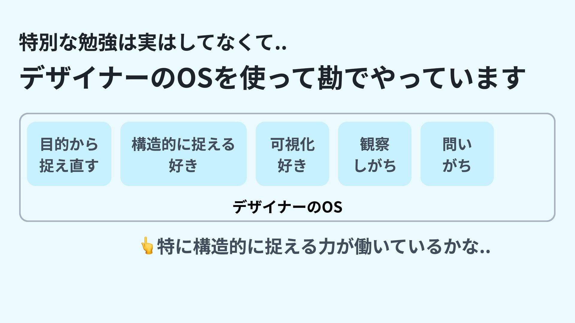 4. こういう場づくりは正直いつも四苦八苦..! でもやっぱりデザイナーのOSを使っている 目的から 捉え直す 構造的に捉える 好き 可視化 好き 観察 しがち