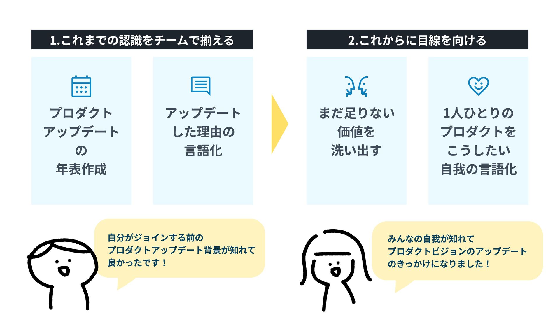 3. プロダクト アップデート の 年表作成 1.これまでの認識をチームで揃える 2.これからに目線を向ける アップデート した理由の 言語化 まだ足りない