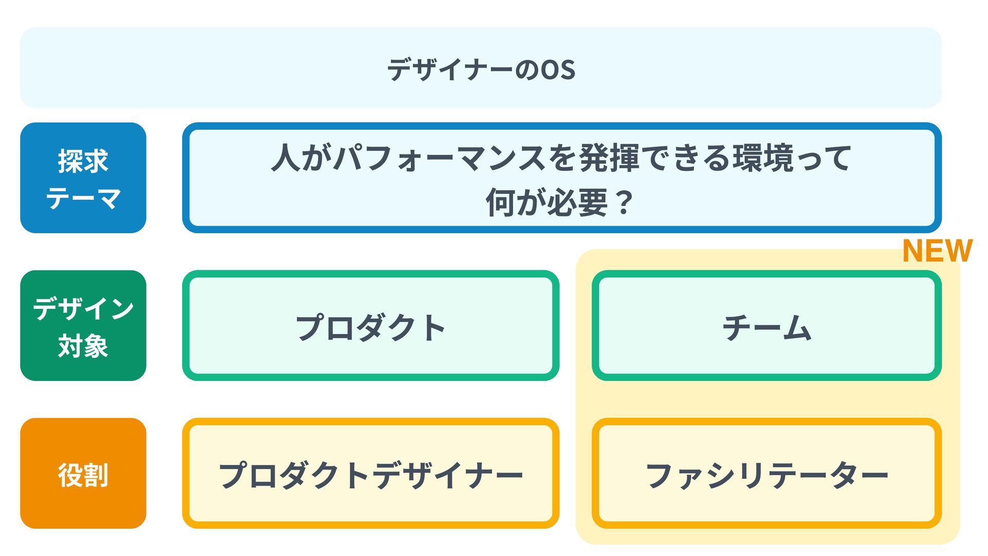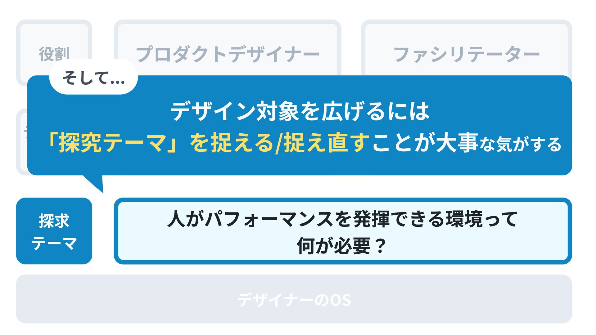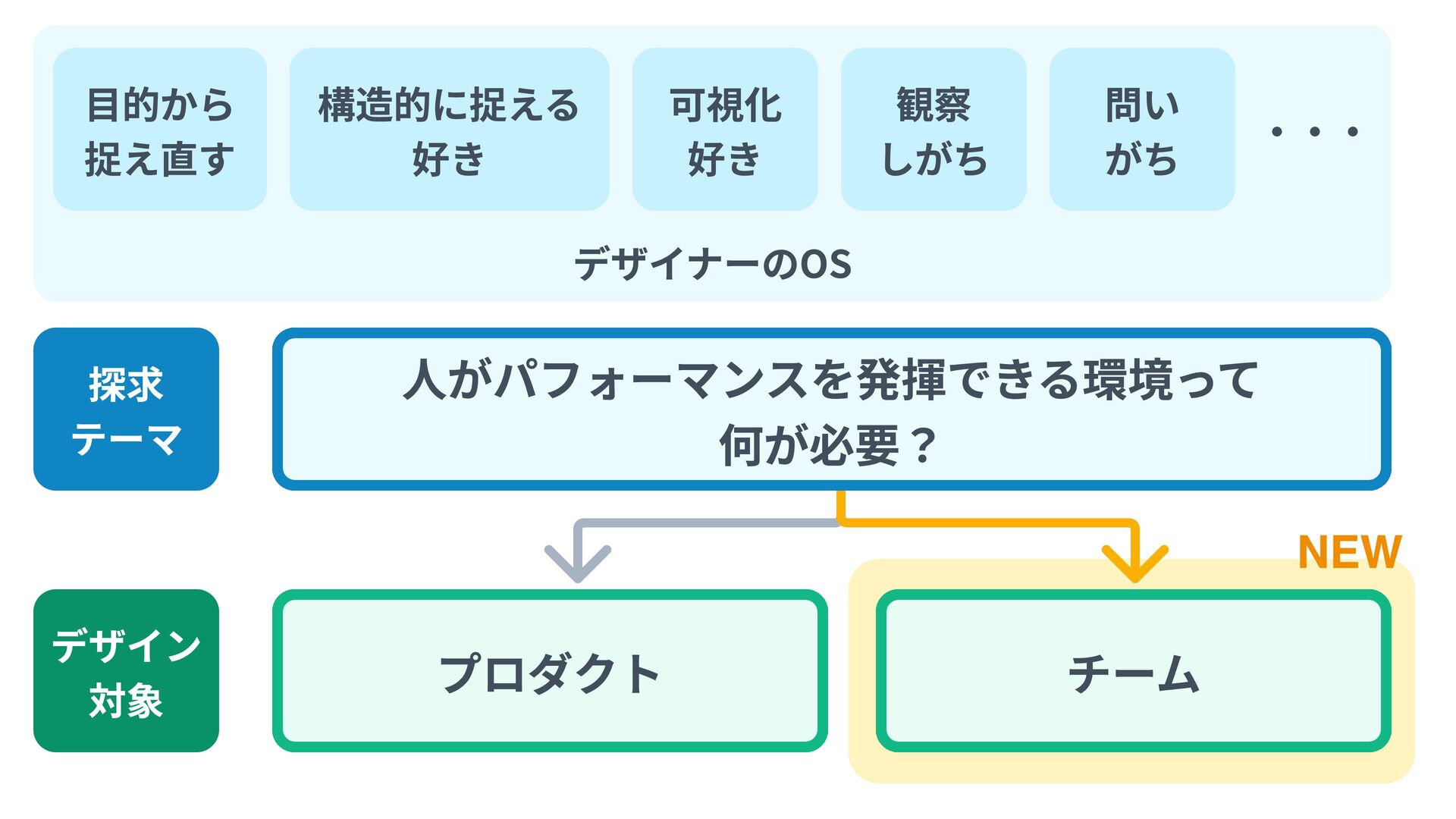 5. 人がパフォーマンスを発揮できる環境って 何が必要? 探求 テーマ デザイナーのOS デザイン 対象 役割 プロダクト プロダクトデザイナー