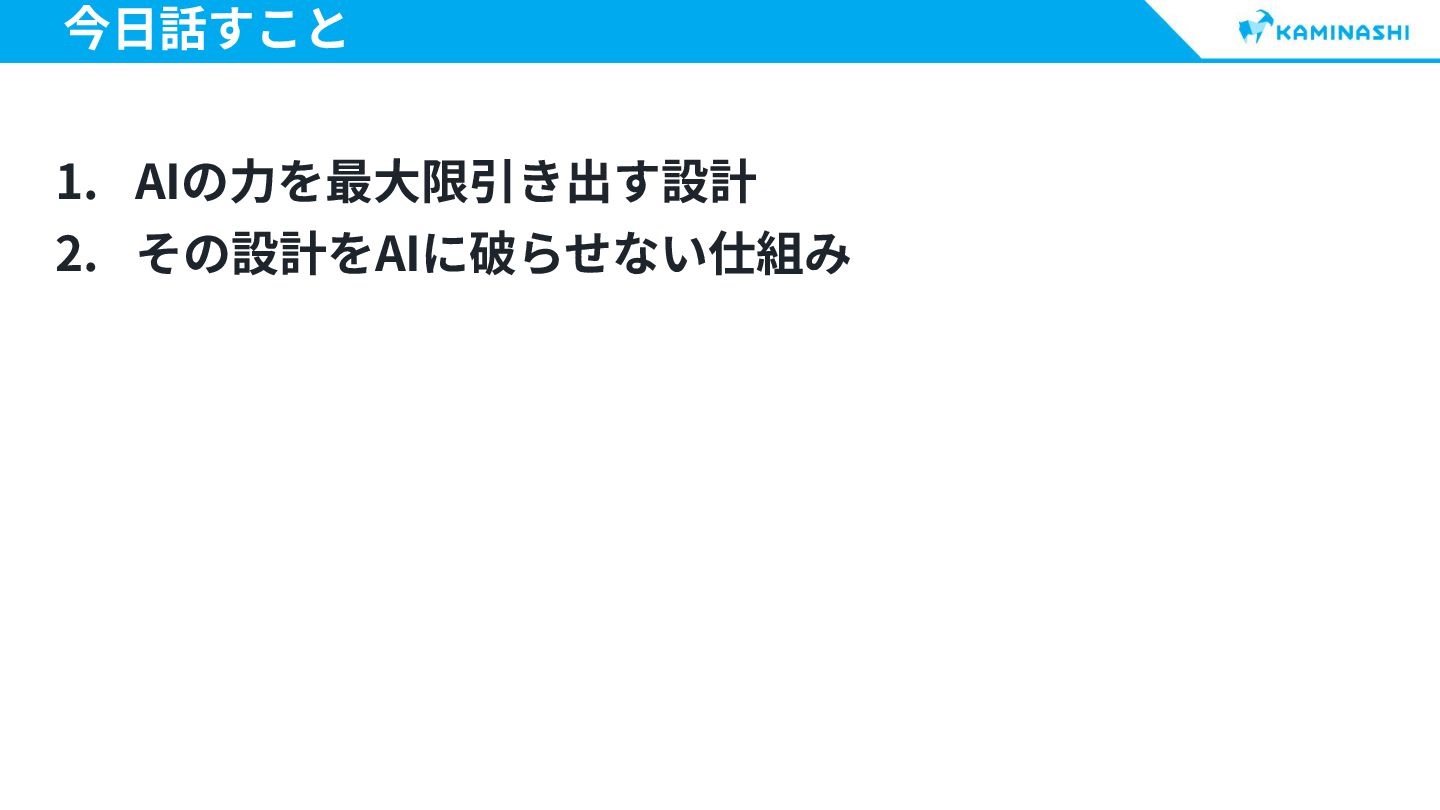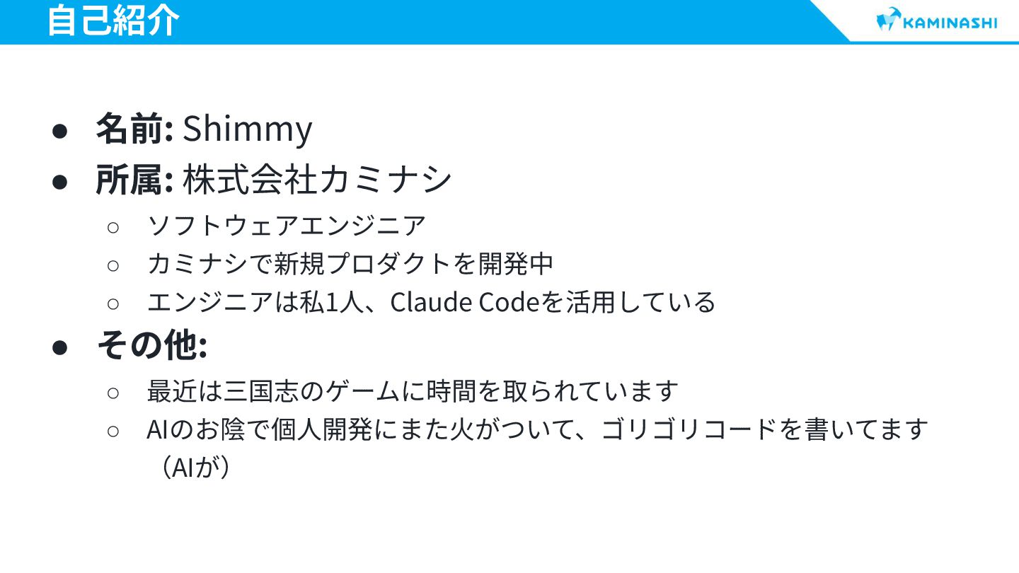 カミナシで新規プロダクトを開発中 ◦ エンジニアは私1⼈、Claude Codeを活⽤している • その他: ◦ 最近は三国志のゲームに時間を取られています ◦ AIのお陰で個⼈開発にまた⽕がついて、ゴリゴリコードを書いてます (AIが)