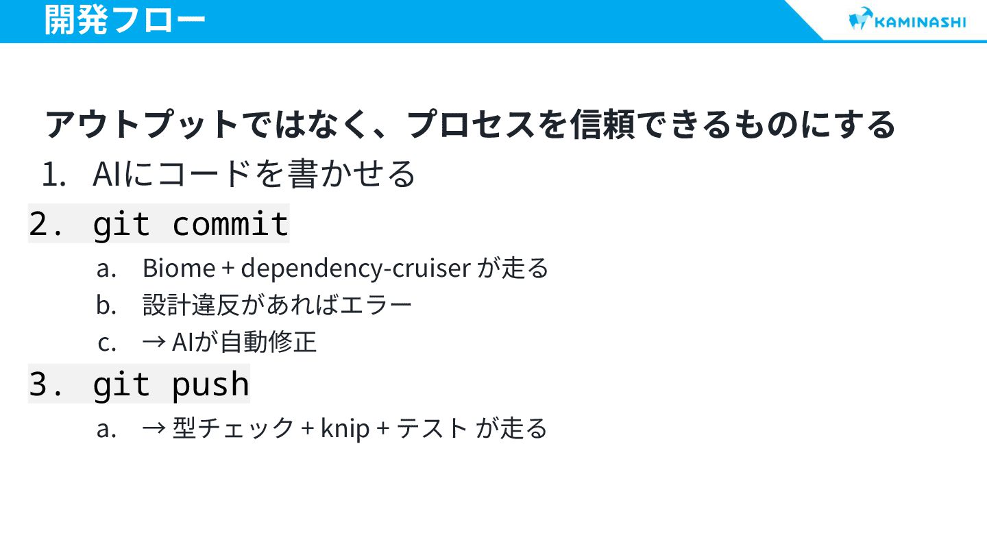 2. 開発フロー アウトプットではなく、プロセスを信頼できるものにする 1. AIにコードを書かせる 2. git commit