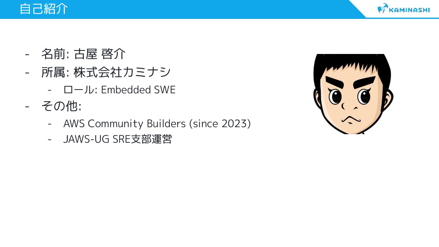 1. 自己紹介 - 名前: 古屋 啓介 - 所属: 株式会社カミナシ - ロール:
