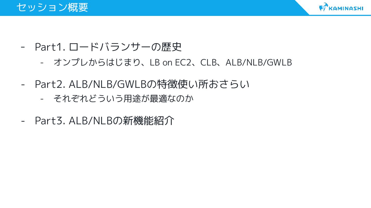3. セッション概要 - Part1. ロードバランサーの歴史 - オンプレからはじまり、LB on EC2、CLB、ALB/NLB/GWLB - Part2.