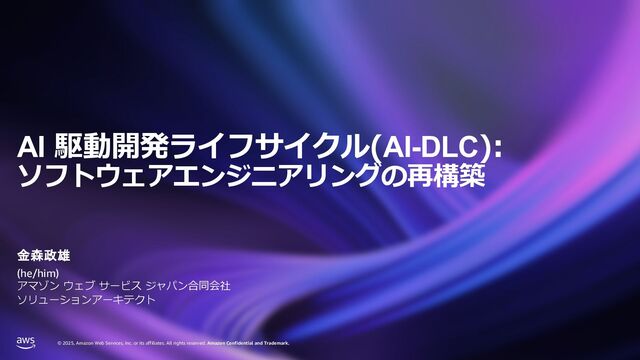 rights reserved. Amazon Confidential and Trademark. AI-Driven Development Lifecycle (AI-DLC) (AI 駆動開発ライフサイクル) ⼤規模で複雑なシステム構築において、 ツール・役割・プロセスが最適に整合するように 設計されたAIネイティブな開発⽅法論