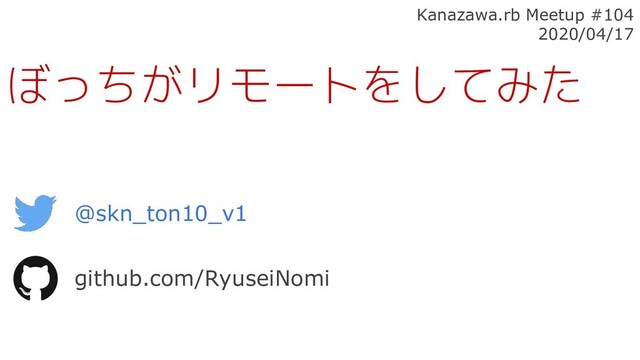 @skn_ton10_v1 github.com/RyuseiNomi ぼっちがリモートをしてみた Kanazawa.rb Meetup #104 2020/04/17