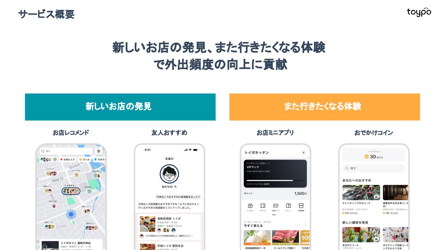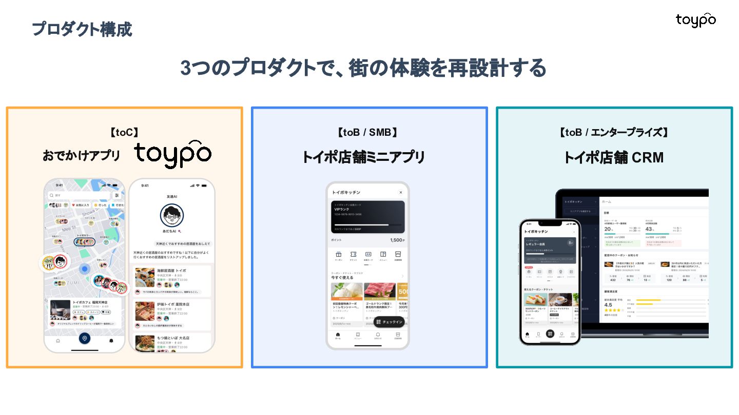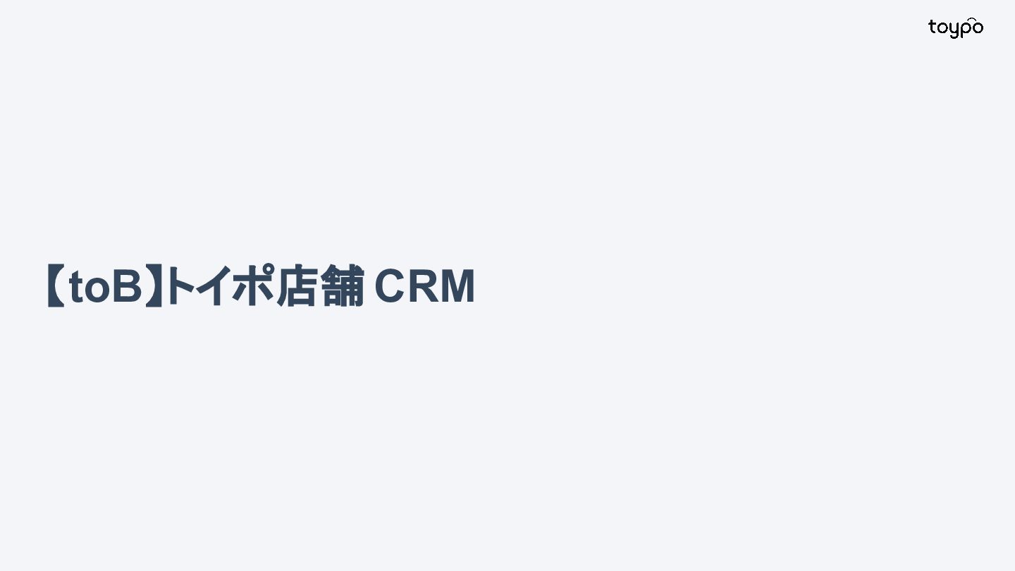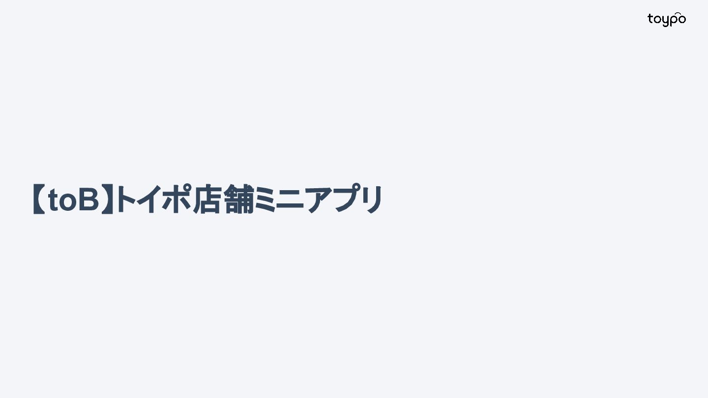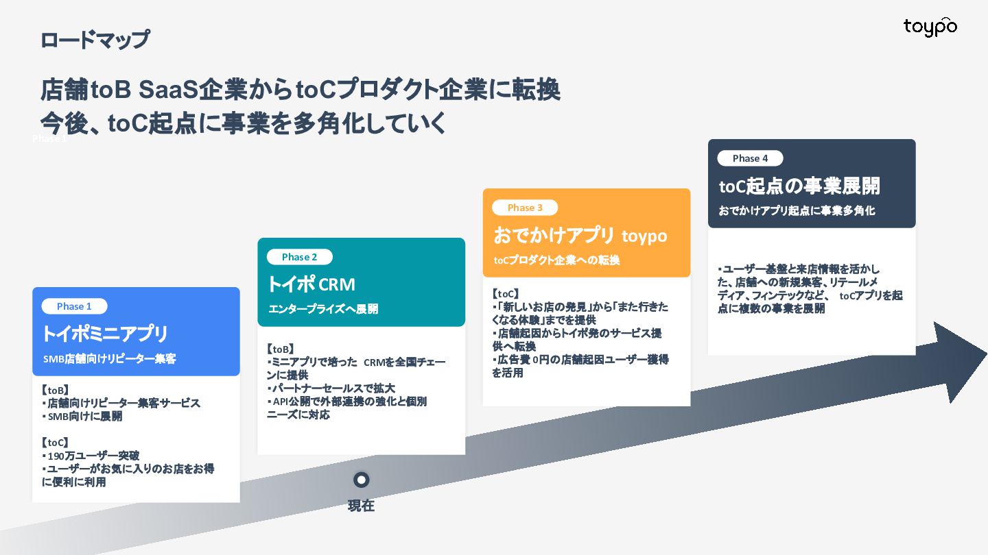 【toB】 ・ミニアプリで培った CRMを全国チェー ンに提供 ・パートナーセールスで拡大 ・API公開で外部連携の強化と個別 ニーズに対応 【toC】 ・「新しいお店の発見」から「また行きた くなる体験」までを提供 ・店舗起因からトイポ発のサービス提 供へ転換 ・広告費 0円の店舗起因ユーザー獲得 を活用 現在 ・ユーザー基盤と来店情報を活かし た、店舗への新規集客、リテールメ ディア、フィンテックなど、 toCアプリを起 点に複数の事業を展開 toC起点の事業展開 おでかけアプリ起点に事業多角化 Phase 4 おでかけアプリ toypo toCプロダクト企業への転換 Phase 3 トイポCRM エンタープライズへ展開 Phase 2 トイポミニアプリ SMB店舗向けリピーター集客 Phase 1 店舗toB SaaS企業からtoCプロダクト企業に転換 今後、toC起点に事業を多角化していく ロードマップ
