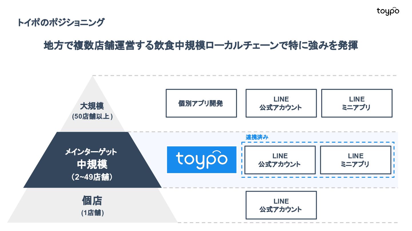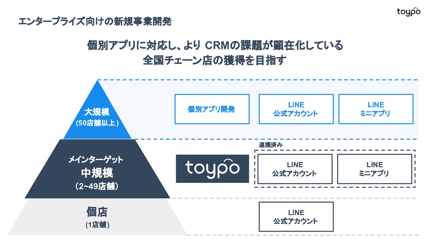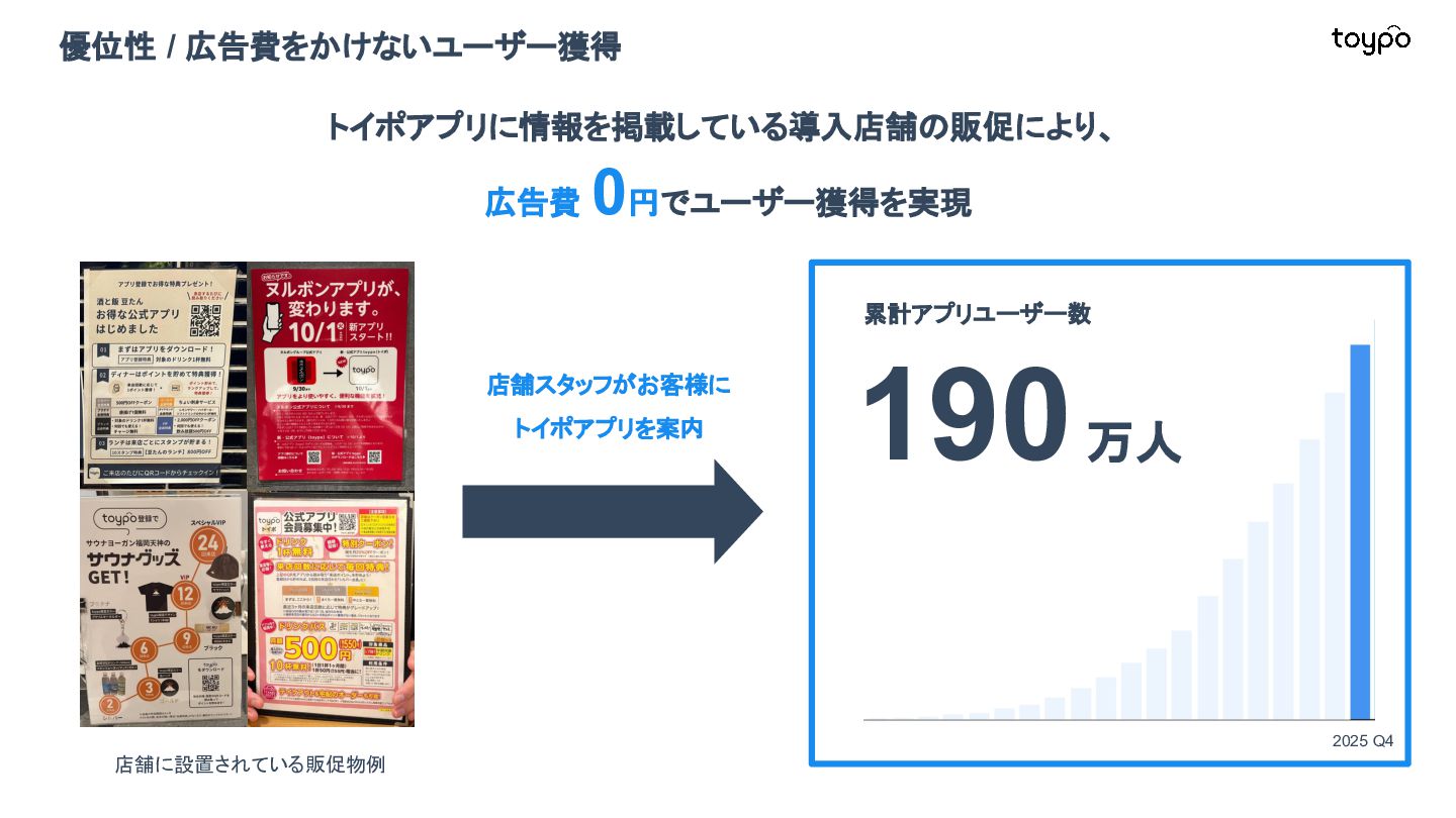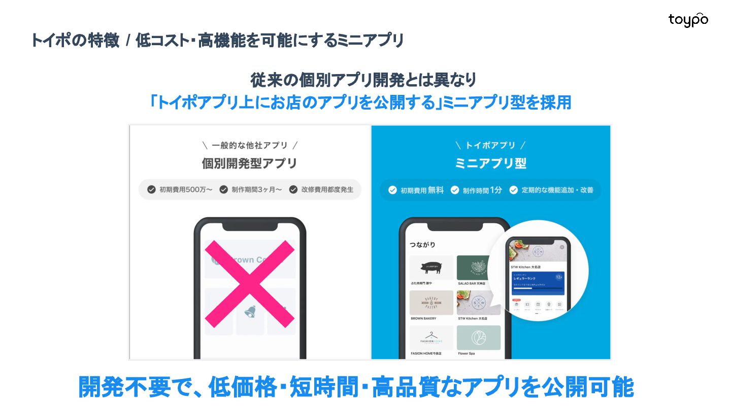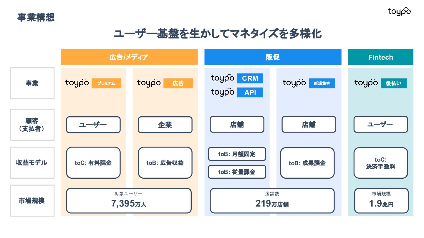 【toB】 ・ミニアプリで培った CRMを全国チェー ンに提供 ・パートナーセールスで拡大 ・API公開で外部連携の強化と個別 ニーズに対応 【toC】 ・「新しいお店の発見」から「また行きた くなる体験」までを提供 ・店舗起因からトイポ発のサービス提 供へ転換 ・広告費 0円の店舗起因ユーザー獲得 を活用 現在 ・ユーザー基盤と来店情報を活かし た、店舗への新規集客、リテールメ ディア、フィンテックなど、 toCアプリを起 点に複数の事業を展開 toC起点の事業展開 おでかけアプリ起点に事業多角化 Phase 4 おでかけアプリ toypo toCプロダクト企業への転換 Phase 3 トイポCRM エンタープライズへ展開 Phase 2 トイポミニアプリ SMB店舗向けリピーター集客 Phase 1 店舗toB SaaS企業からtoCプロダクト企業に転換 今後、toC起点に事業を多角化していく ロードマップ
