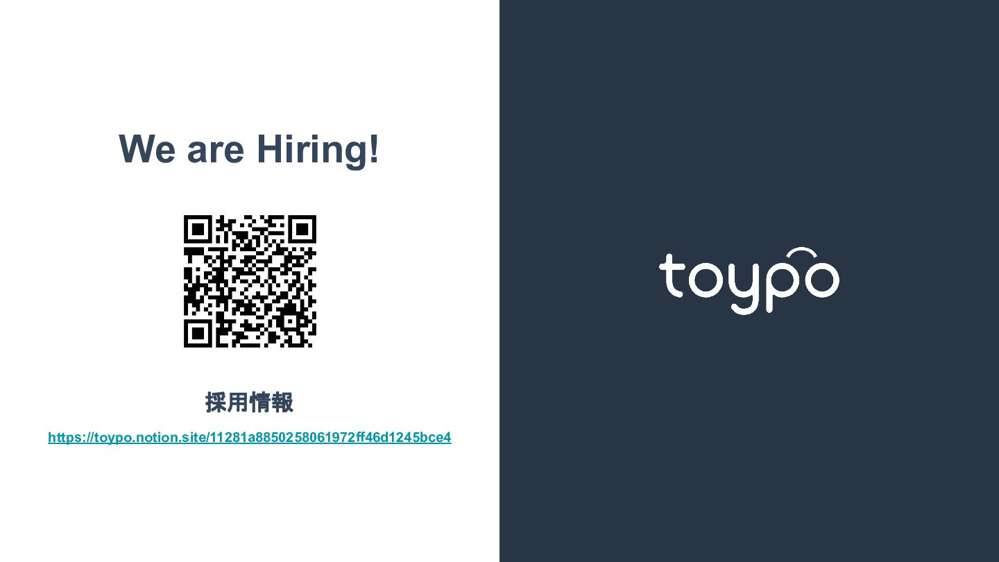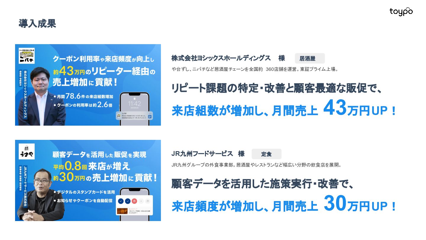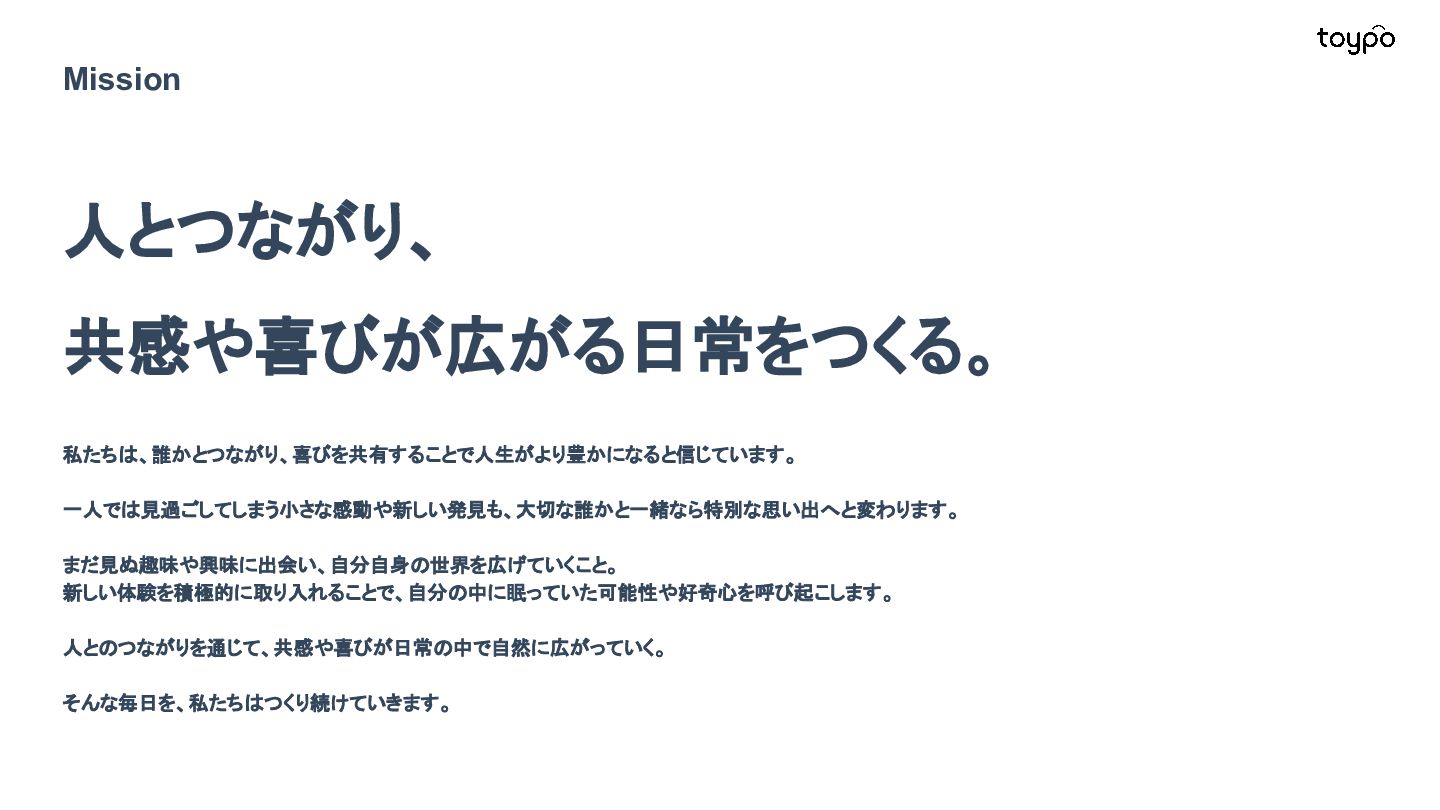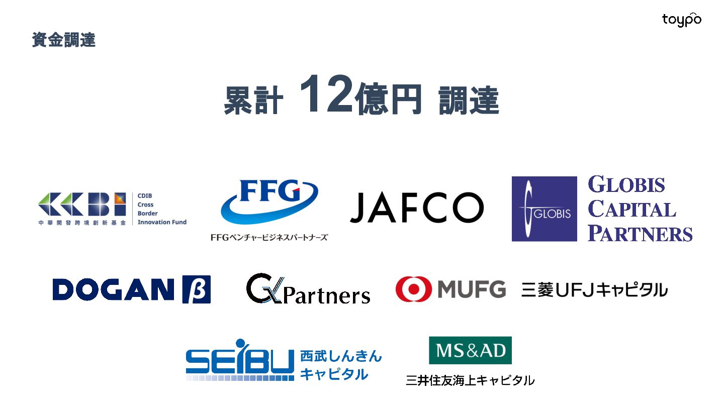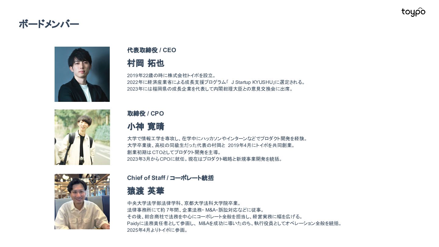 【toB】 ・ミニアプリで培った CRMを全国チェー ンに提供 ・パートナーセールスで拡大 ・API公開で外部連携の強化と個別 ニーズに対応 【toC】 ・「新しいお店の発見」から「また行きた くなる体験」までを提供 ・店舗起因からトイポ発のサービス提 供へ転換 ・広告費 0円の店舗起因ユーザー獲得 を活用 現在 ・ユーザー基盤と来店情報を活かし た、店舗への新規集客、リテールメ ディア、フィンテックなど、 toCアプリを起 点に複数の事業を展開 toC起点の事業展開 おでかけアプリ起点に事業多角化 Phase 4 おでかけアプリ toypo toCプロダクト企業への転換 Phase 3 トイポCRM エンタープライズへ展開 Phase 2 トイポミニアプリ SMB店舗向けリピーター集客 Phase 1 店舗toB SaaS企業からtoCプロダクト企業に転換 今後、toC起点に事業を多角化していく ロードマップ
