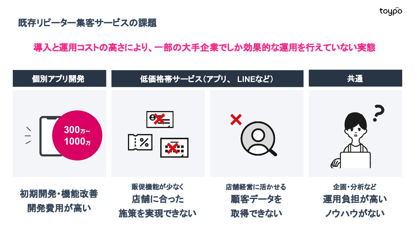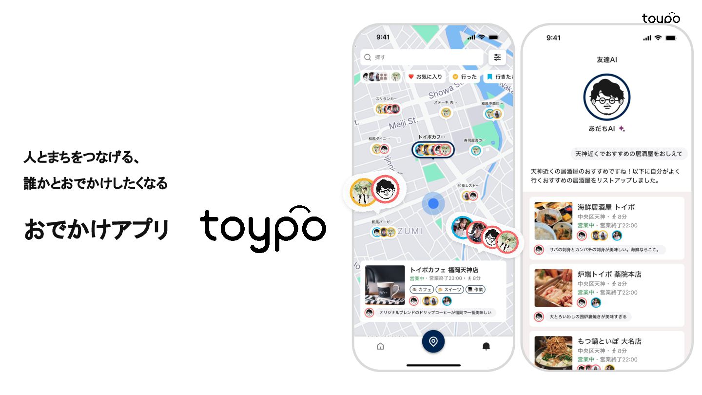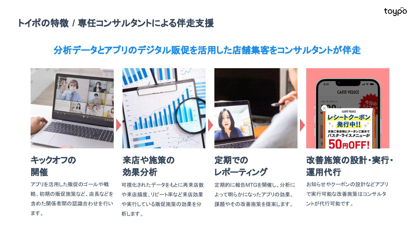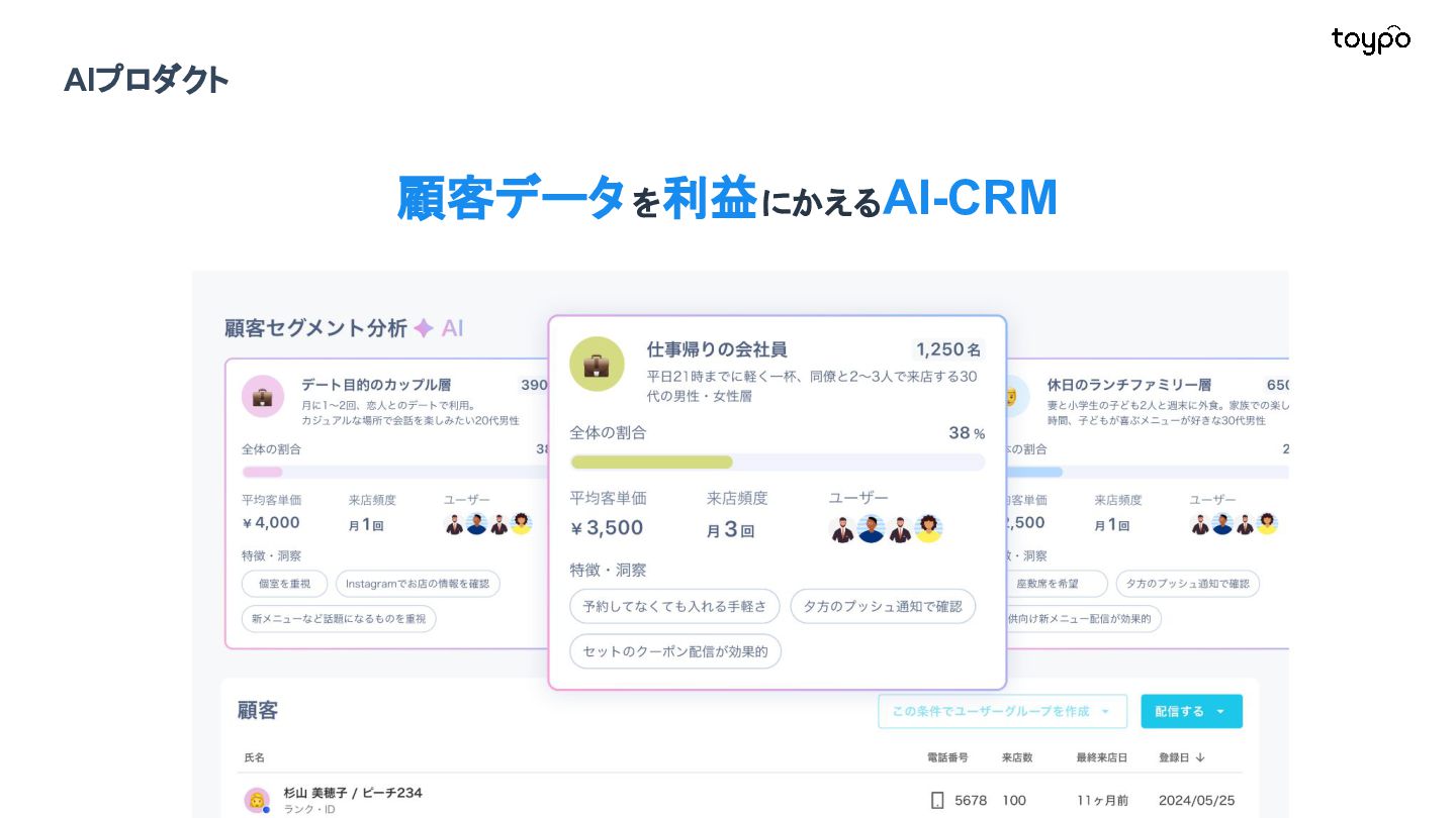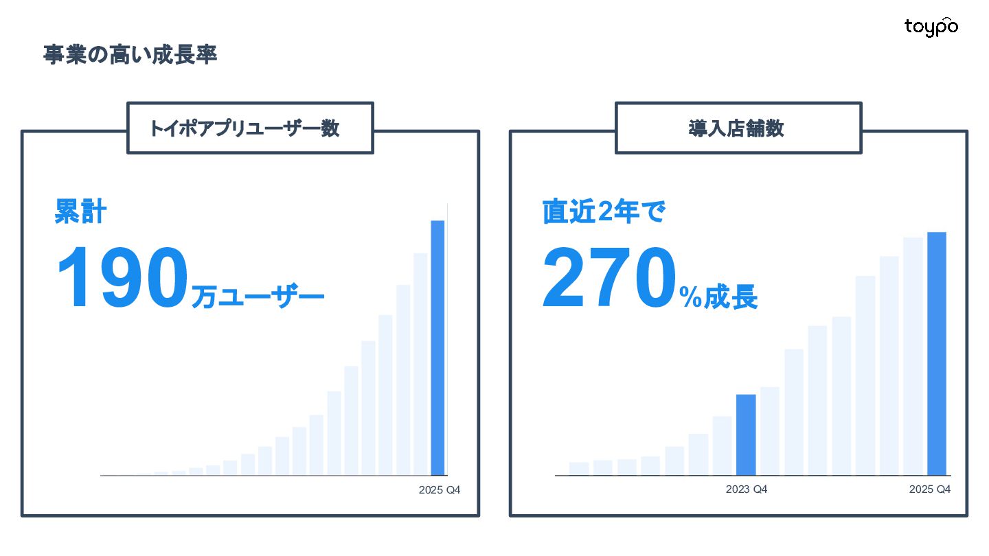 【toB】 ・ミニアプリで培った CRMを全国チェー ンに提供 ・パートナーセールスで拡大 ・API公開で外部連携の強化と個別 ニーズに対応 【toC】 ・「新しいお店の発見」から「また行きた くなる体験」までを提供 ・店舗起因からトイポ発のサービス提 供へ転換 ・広告費 0円の店舗起因ユーザー獲得 を活用 現在 ・ユーザー基盤と来店情報を活かし た、店舗への新規集客、リテールメ ディア、フィンテックなど、 toCアプリを起 点に複数の事業を展開 toC起点の事業展開 おでかけアプリ起点に事業多角化 Phase 4 おでかけアプリ toypo toCプロダクト企業への転換 Phase 3 トイポCRM エンタープライズへ展開 Phase 2 トイポミニアプリ SMB店舗向けリピーター集客 Phase 1 店舗toB SaaS企業からtoCプロダクト企業に転換 今後、toC起点に事業を多角化していく ロードマップ