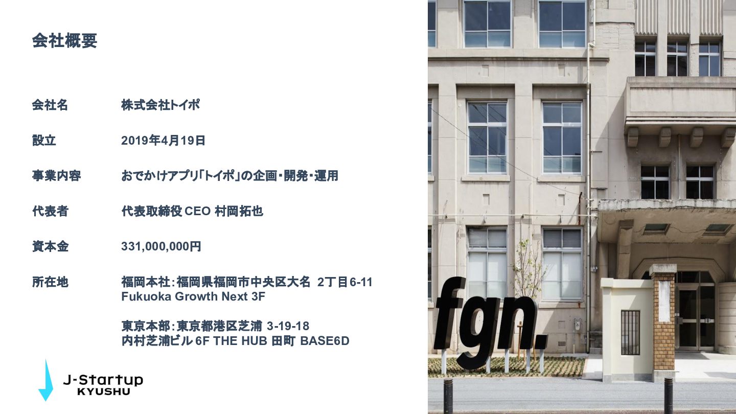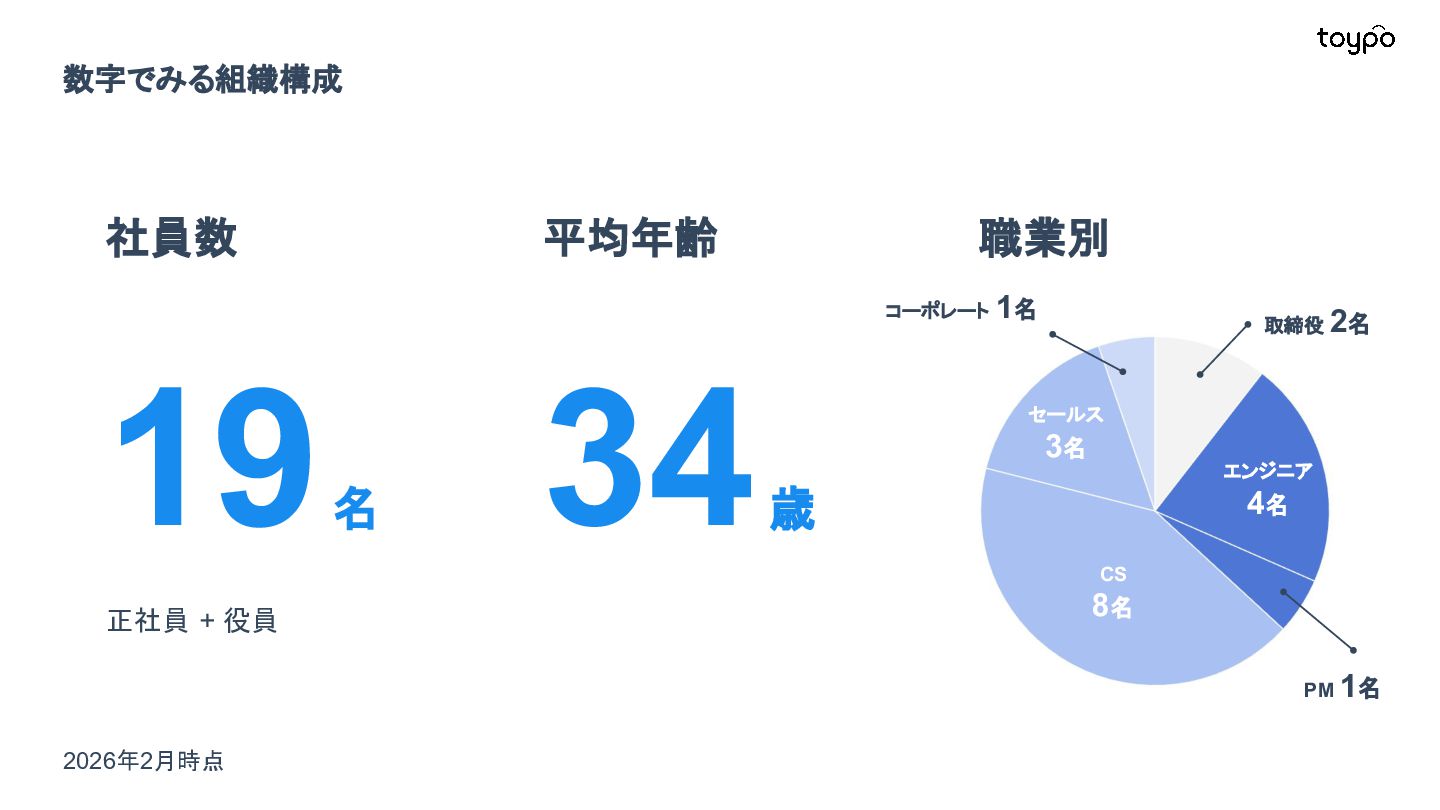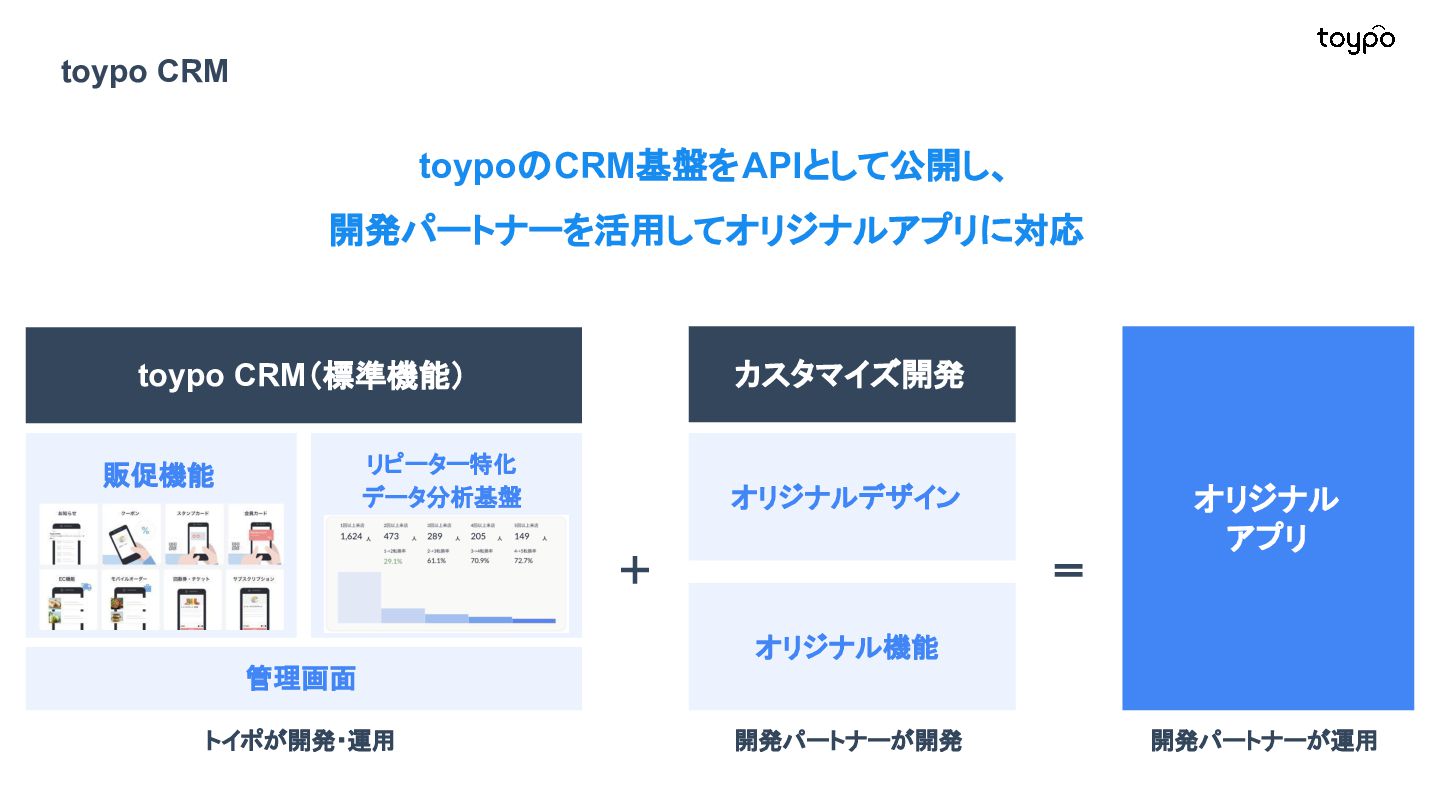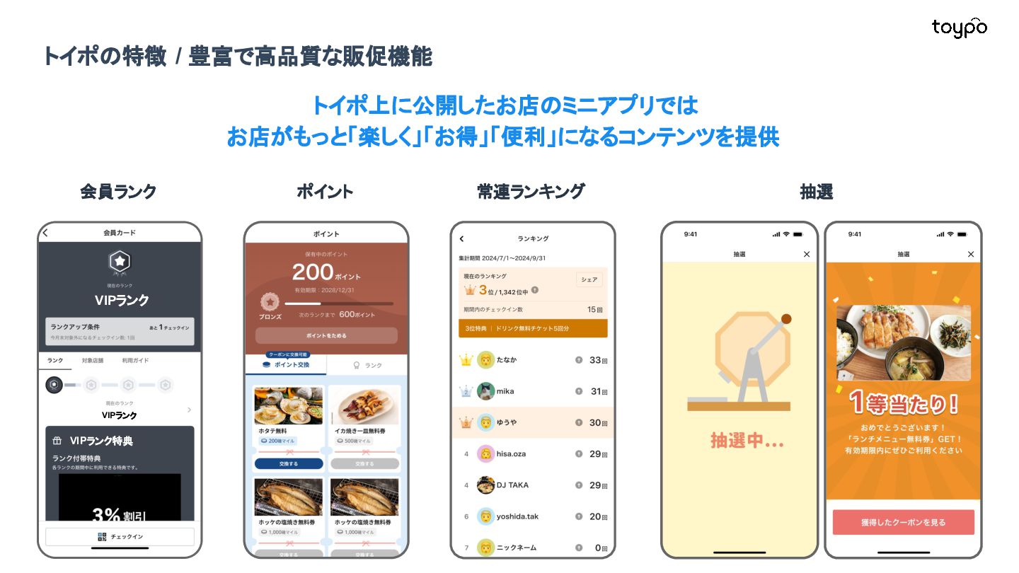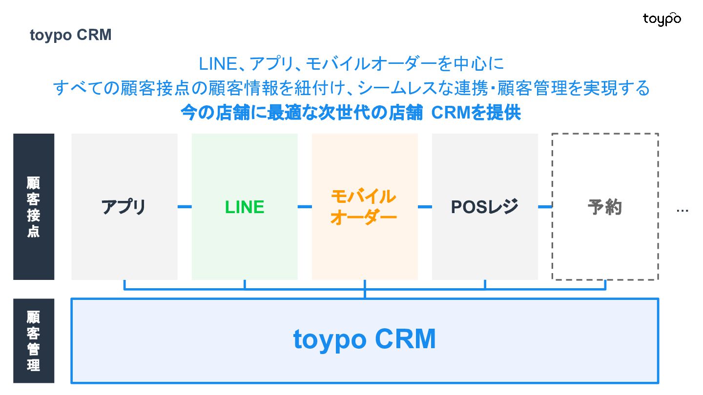 【toB】 ・ミニアプリで培った CRMを全国チェー ンに提供 ・パートナーセールスで拡大 ・API公開で外部連携の強化と個別 ニーズに対応 【toC】 ・「新しいお店の発見」から「また行きた くなる体験」までを提供 ・店舗起因からトイポ発のサービス提 供へ転換 ・広告費 0円の店舗起因ユーザー獲得 を活用 現在 ・ユーザー基盤と来店情報を活かし た、店舗への新規集客、リテールメ ディア、フィンテックなど、 toCアプリを起 点に複数の事業を展開 toC起点の事業展開 おでかけアプリ起点に事業多角化 Phase 4 おでかけアプリ toypo toCプロダクト企業への転換 Phase 3 トイポCRM エンタープライズへ展開 Phase 2 トイポミニアプリ SMB店舗向けリピーター集客 Phase 1 店舗toB SaaS企業からtoCプロダクト企業に転換 今後、toC起点に事業を多角化していく ロードマップ