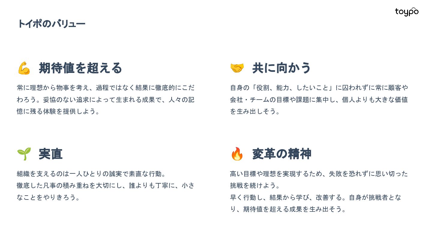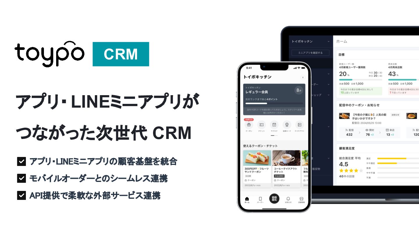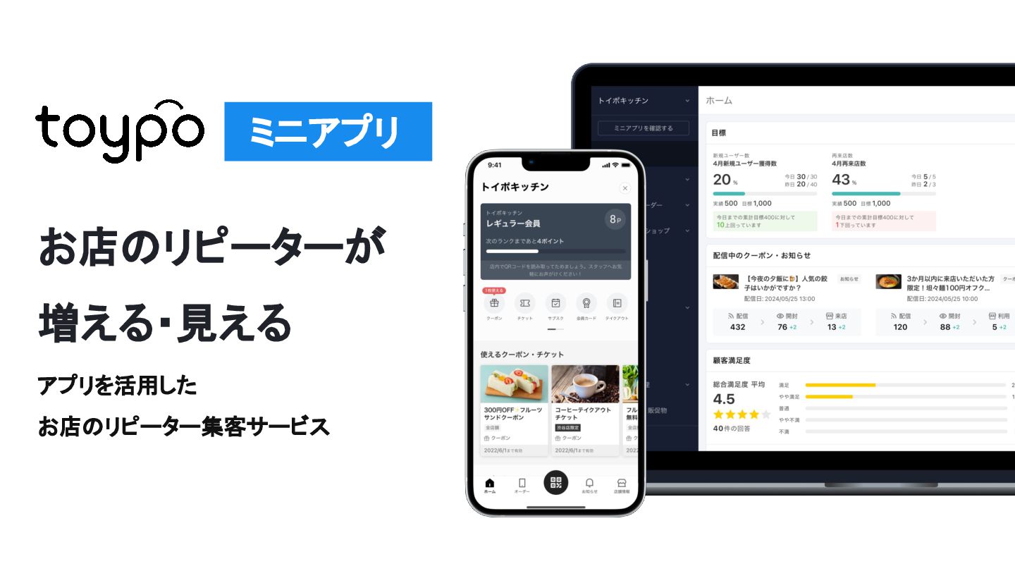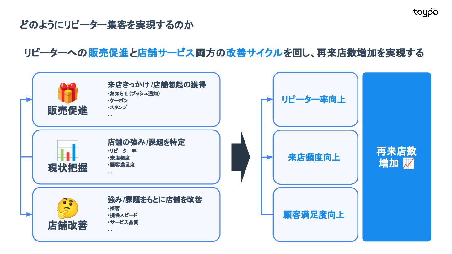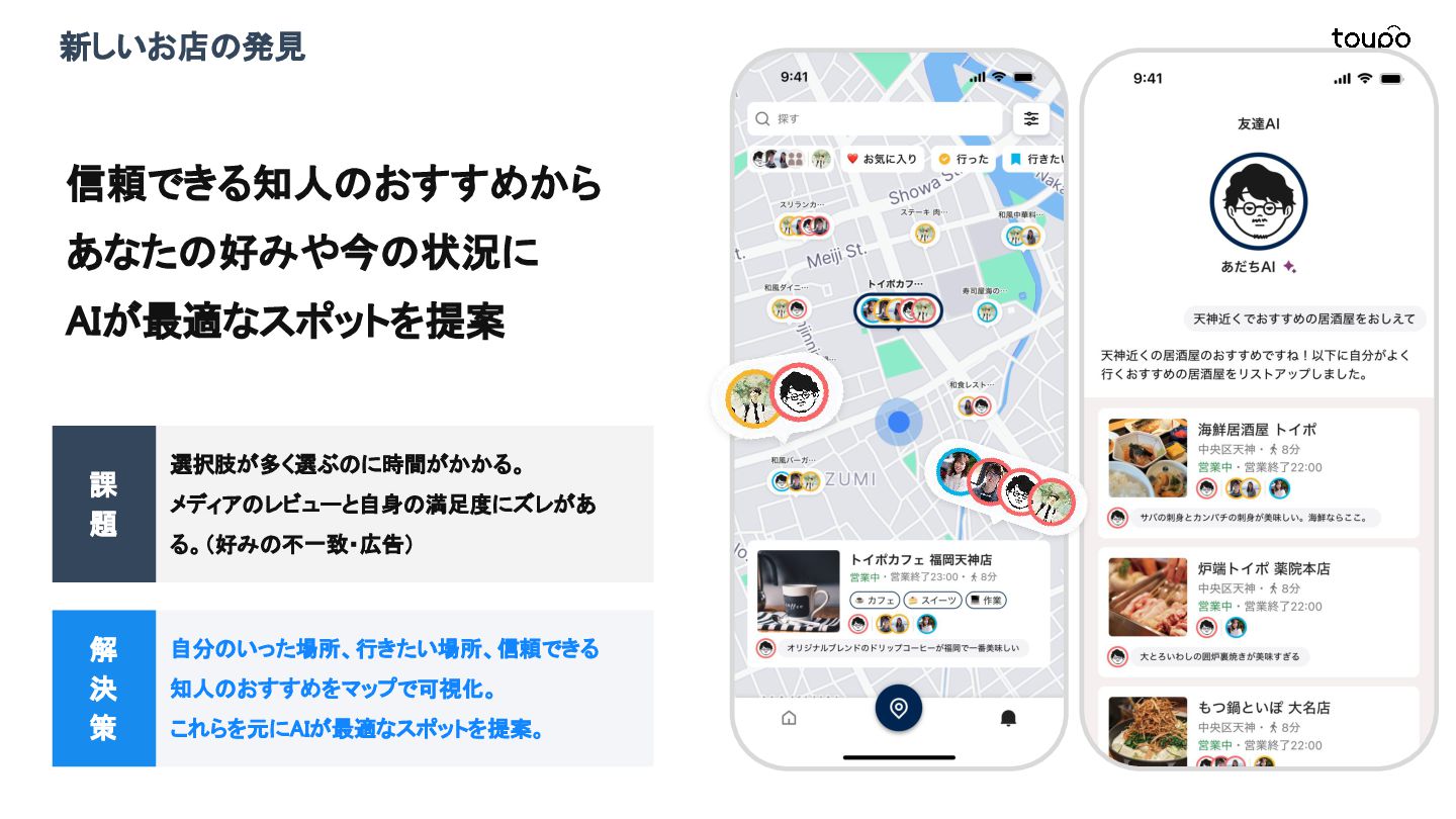 【toB】 ・ミニアプリで培った CRMを全国チェー ンに提供 ・パートナーセールスで拡大 ・API公開で外部連携の強化と個別 ニーズに対応 【toC】 ・「新しいお店の発見」から「また行きた くなる体験」までを提供 ・店舗起因からトイポ発のサービス提 供へ転換 ・広告費 0円の店舗起因ユーザー獲得 を活用 現在 ・ユーザー基盤と来店情報を活かし た、店舗への新規集客、リテールメ ディア、フィンテックなど、 toCアプリを起 点に複数の事業を展開 toC起点の事業展開 おでかけアプリ起点に事業多角化 Phase 4 おでかけアプリ toypo toCプロダクト企業への転換 Phase 3 トイポCRM エンタープライズへ展開 Phase 2 トイポミニアプリ SMB店舗向けリピーター集客 Phase 1 店舗toB SaaS企業からtoCプロダクト企業に転換 今後、toC起点に事業を多角化していく ロードマップ