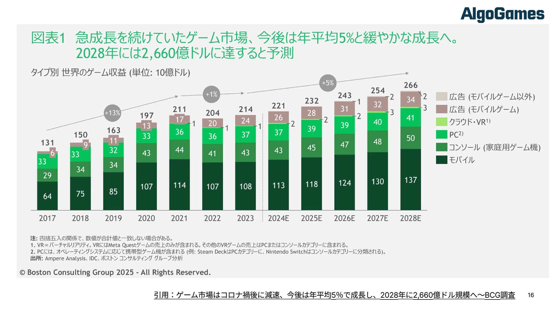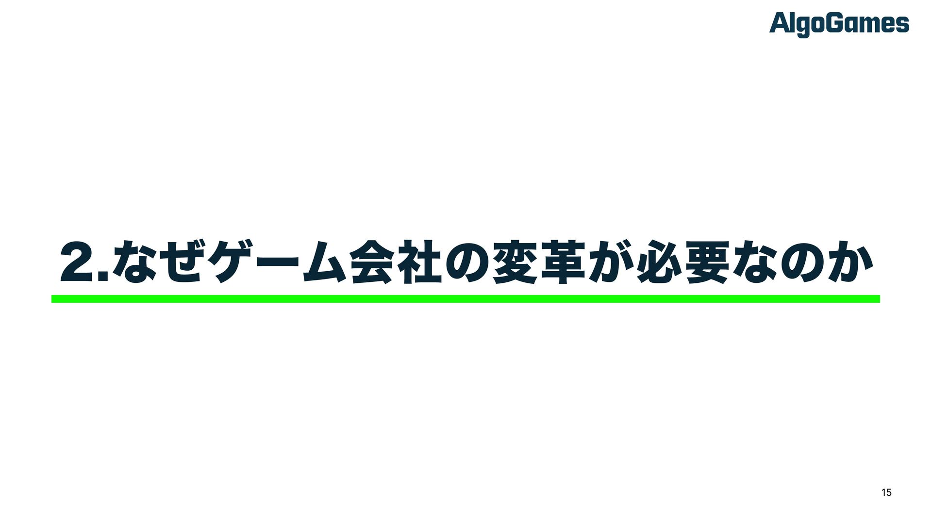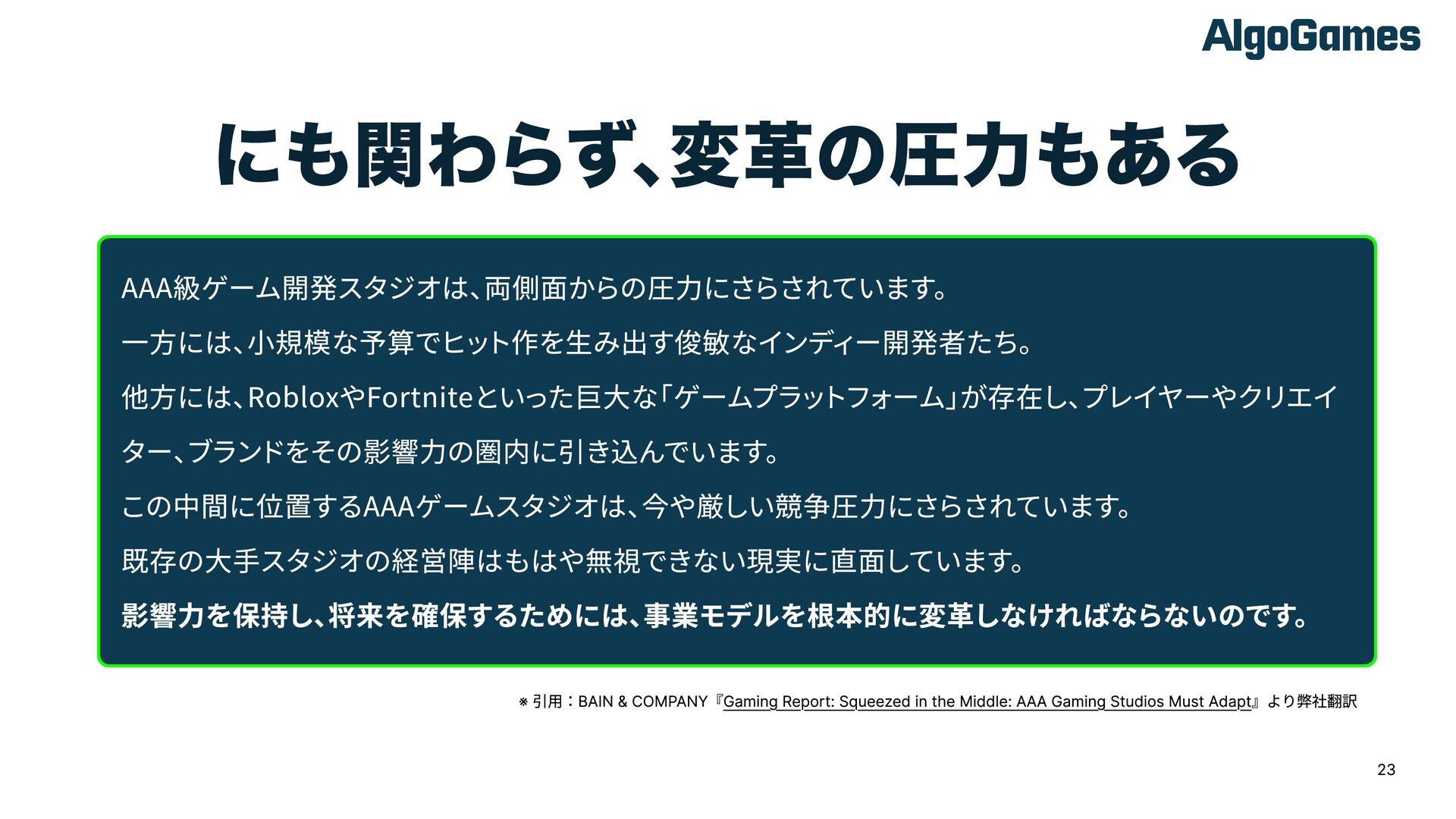 プレイヤーやクリエイ ター、 ブランドをその影響力の圏内に引き込んでいます。   この中間に位置するAAAゲームスタジオは、 今や厳しい競争圧力にさらされています。 既存の大手スタジオの経営陣はもはや無視できない現実に直面しています。 影響力を保持し、 将来を確保するためには、 事業モデルを根本的に変革しなければならないのです。 ※ 引用:BAIN & COMPANY『Gaming Report: Squeezed in the Middle: AAA Gaming Studios Must Adapt』より弊社翻訳 23