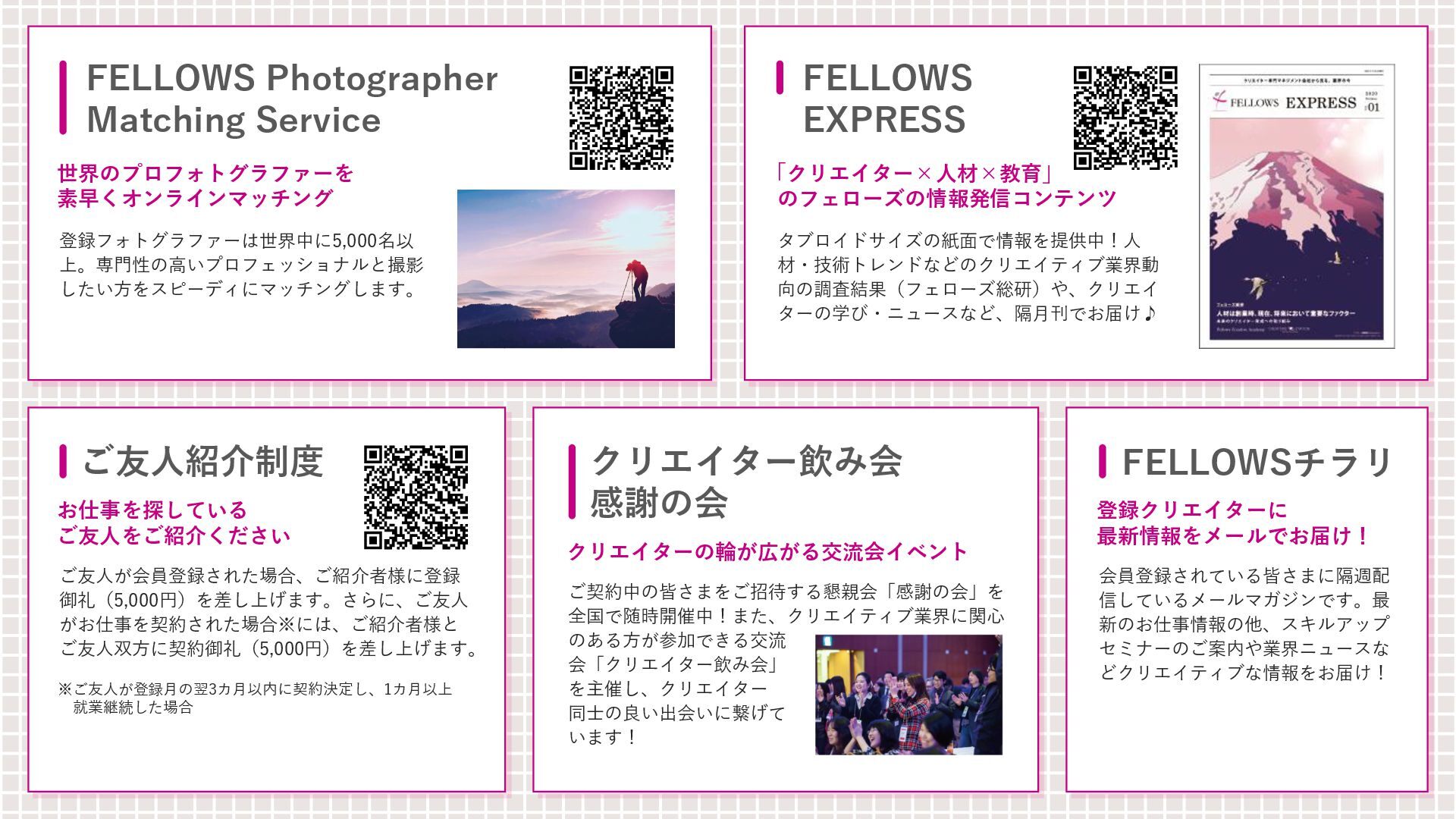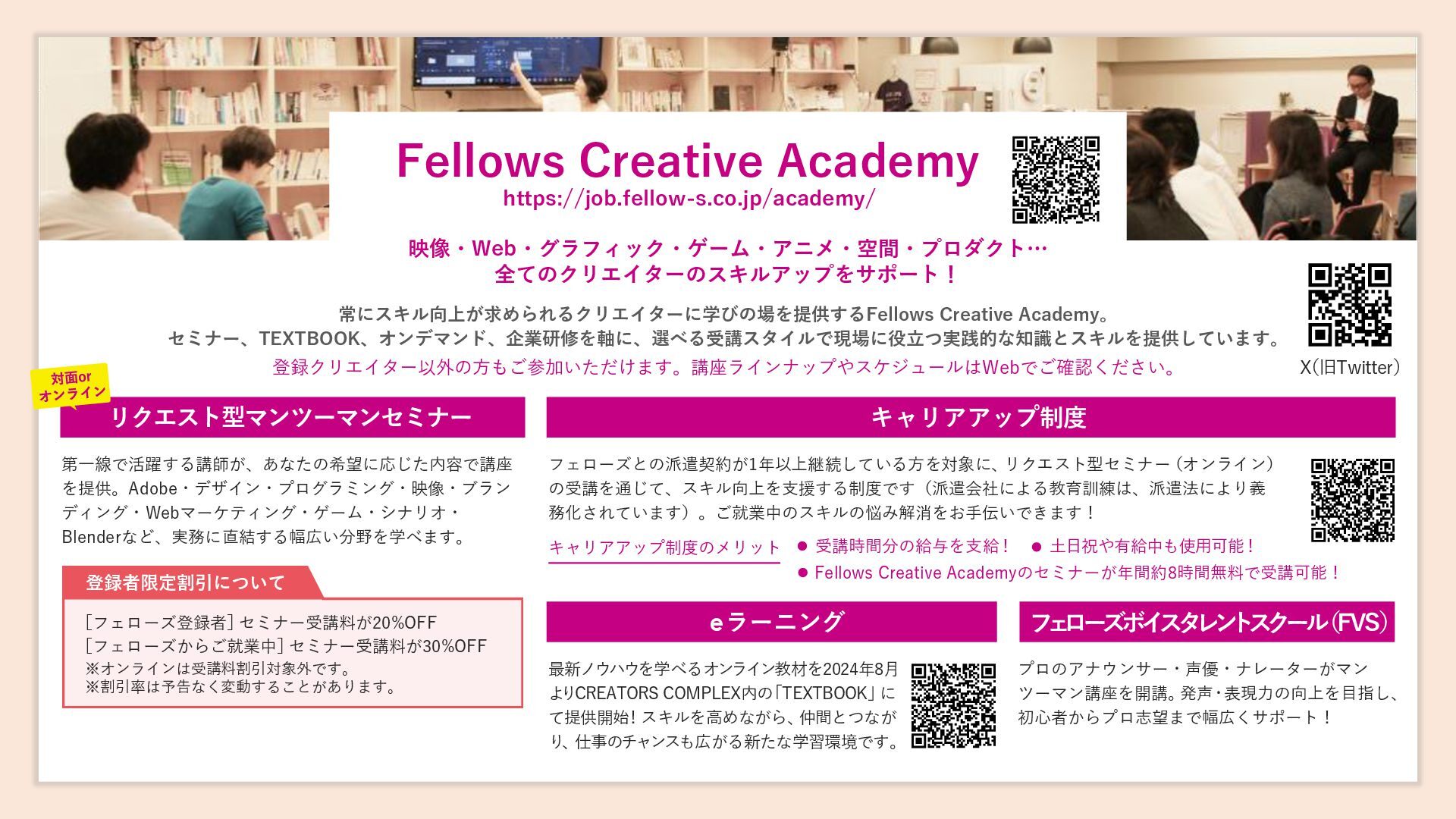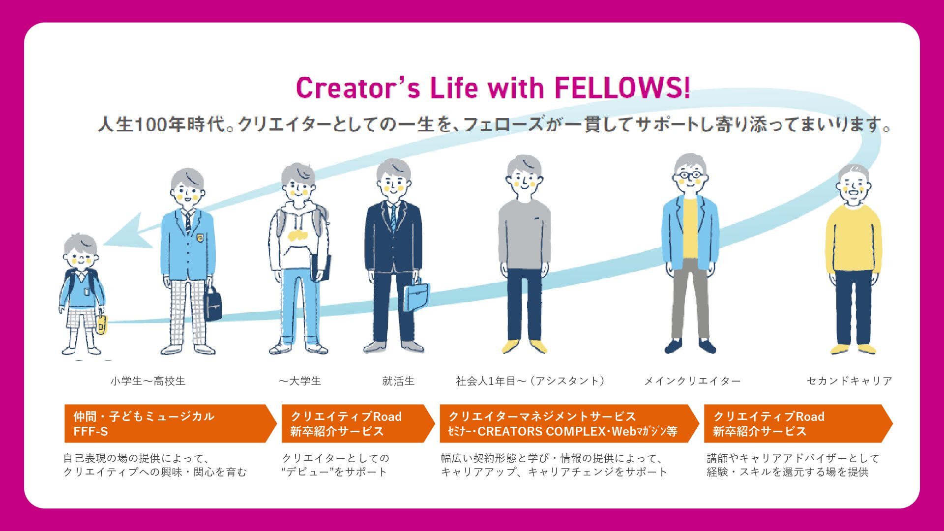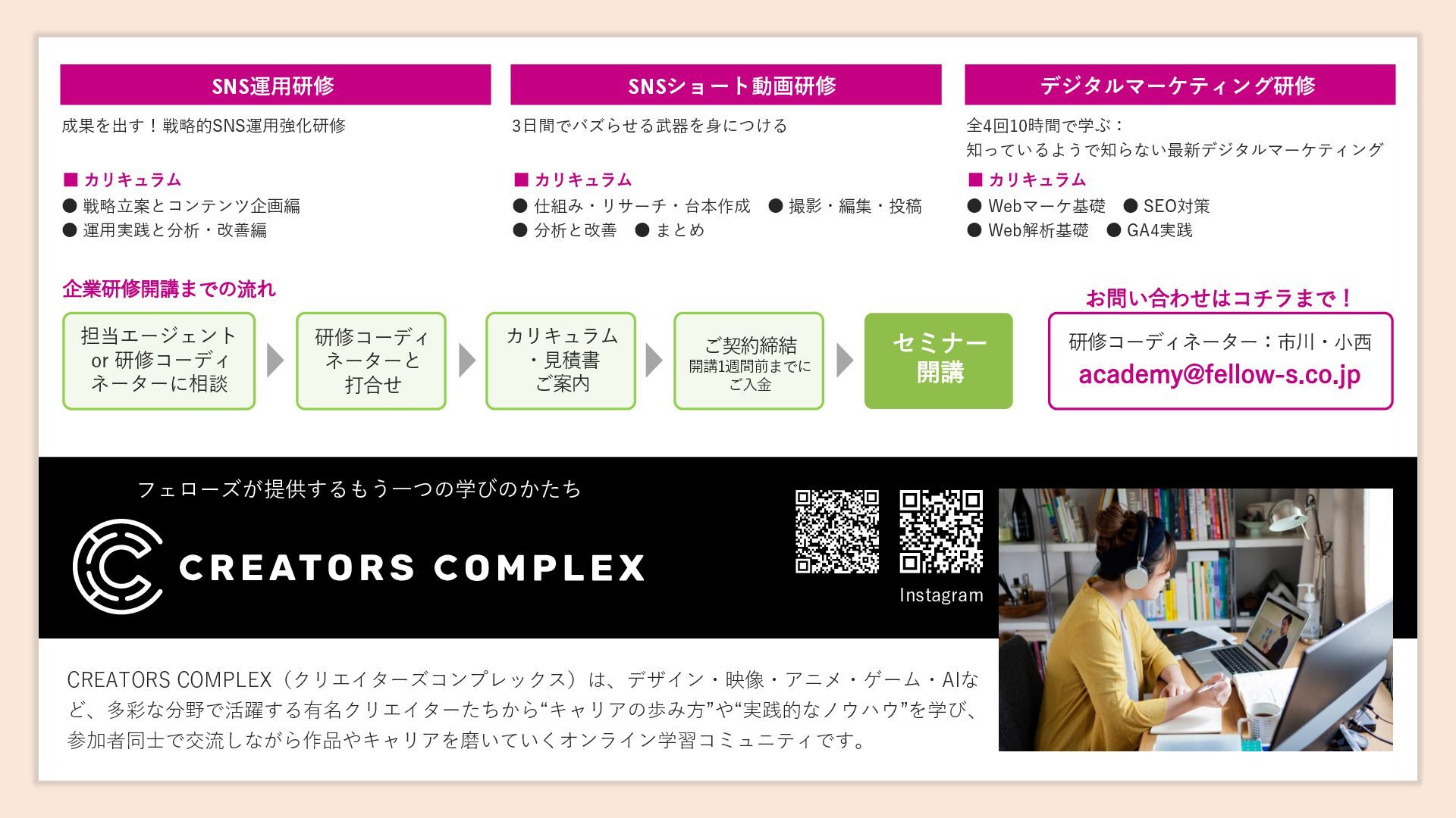 [email protected] お問い合わせはコチラまで! フェローズが提供するもう一つの学びのかたち Instagram CREATORS COMPLEX(クリエイターズコンプレックス)は、デザイン・映像・アニメ・ゲーム・AIな ど、多彩な分野で活躍する有名クリエイターたちから“キャリアの歩み方”や“実践的なノウハウ”を学び、 参加者同士で交流しながら作品やキャリアを磨いていくオンライン学習コミュニティです。