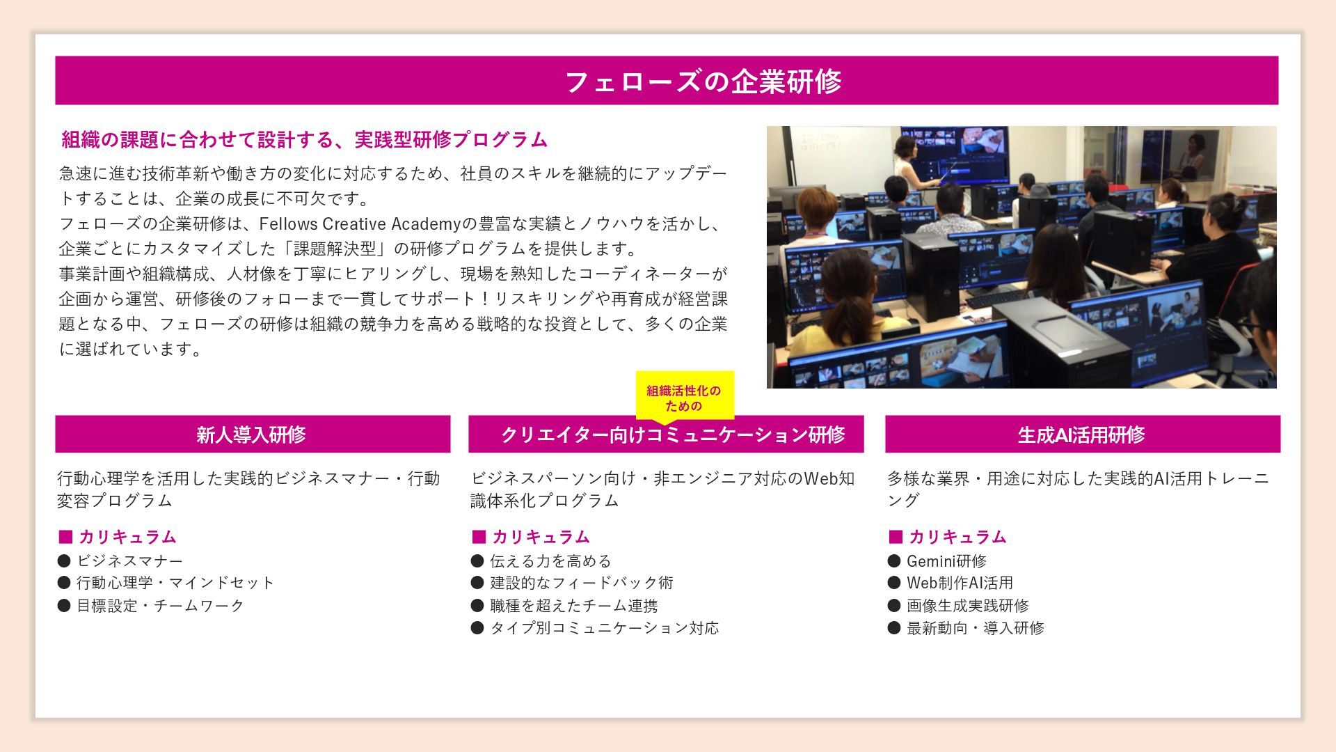 ト ス ク ール (F S) 企業研修開講までの流れ 担当エージェント or 研修コーディ ネーターに相談 SNS運用研修 成果を出す!戦略的SNS運用強化研修 ▪ カリキュラム • 戦略立案とコンテンツ企画編 • 運用実践と分析・改善編 SNSショート動画研修 3日間でバズらせる武器を身につける ▪ カリキュラム • 仕組み・リサーチ・台本作成 • 撮影・編集・投稿 • 分析と改善 • まとめ デジタルマーケティング研修 全4回10時間で学ぶ: 知っているようで知らない最新デジタルマーケティング ▪ カリキュラム • Webマーケ基礎 • SEO対策 • Web解析基礎 • GA4実践 研修コーディ ネーターと 打合せ カリキュラム ・見積書 ご案内 ご契約締結 開講1週間前までに ご入金 セミナー 開講 研修コーディネーター:市川・小西