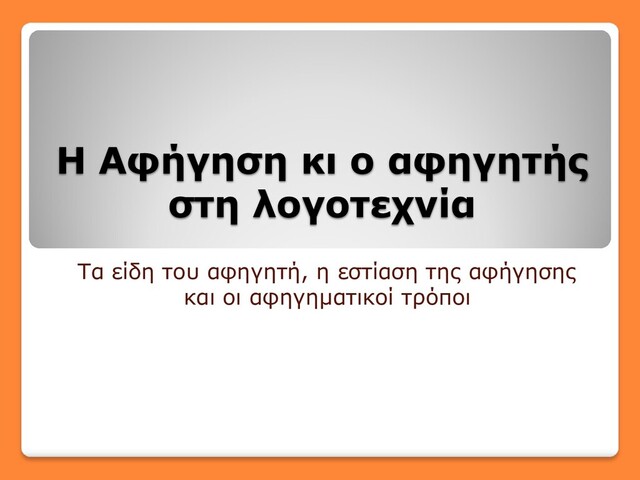 Συνηθίζεται να μιλάμε για διήγηση όταν έχουμε τριτοπρόσωπη αφήγηση και για μίμηση όταν έχουμε πρωτοπρόσωπη αφήγηση. β) Περιγραφή: είναι η στατική αναπαράσταση προσώπων, τόπων, αντικειμένων, φαινομένων. Η περιγραφή δίνει περισσότερες πληροφορίες για τα πρόσωπα και το χώρο δράσης της ιστορίας, επιβραδύνει την αφήγηση κι έτσι προκαλεί μεγαλύτερη προσμονή και αγωνία στον αναγνώστη για την εξέλιξη της ιστορίας. γ) Διάλογος: όταν δύο πρόσωπα συνομιλούν σε α’ πρόσωπο. Ο διάλογος δίνει ζωντάνια και αμεσότητα στην αφήγηση και αναδεικνύει καλύτερα την προσωπικότητα των ηρώων. δ) (Εσωτερικός) μονόλογος: είναι η απόδοση των σκέψεων, των συναισθημάτων, των αναμνήσεων του ήρωα, συνήθως σε α’ ενικό πρόσωπο.