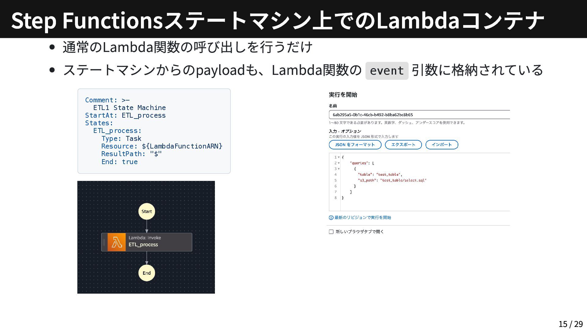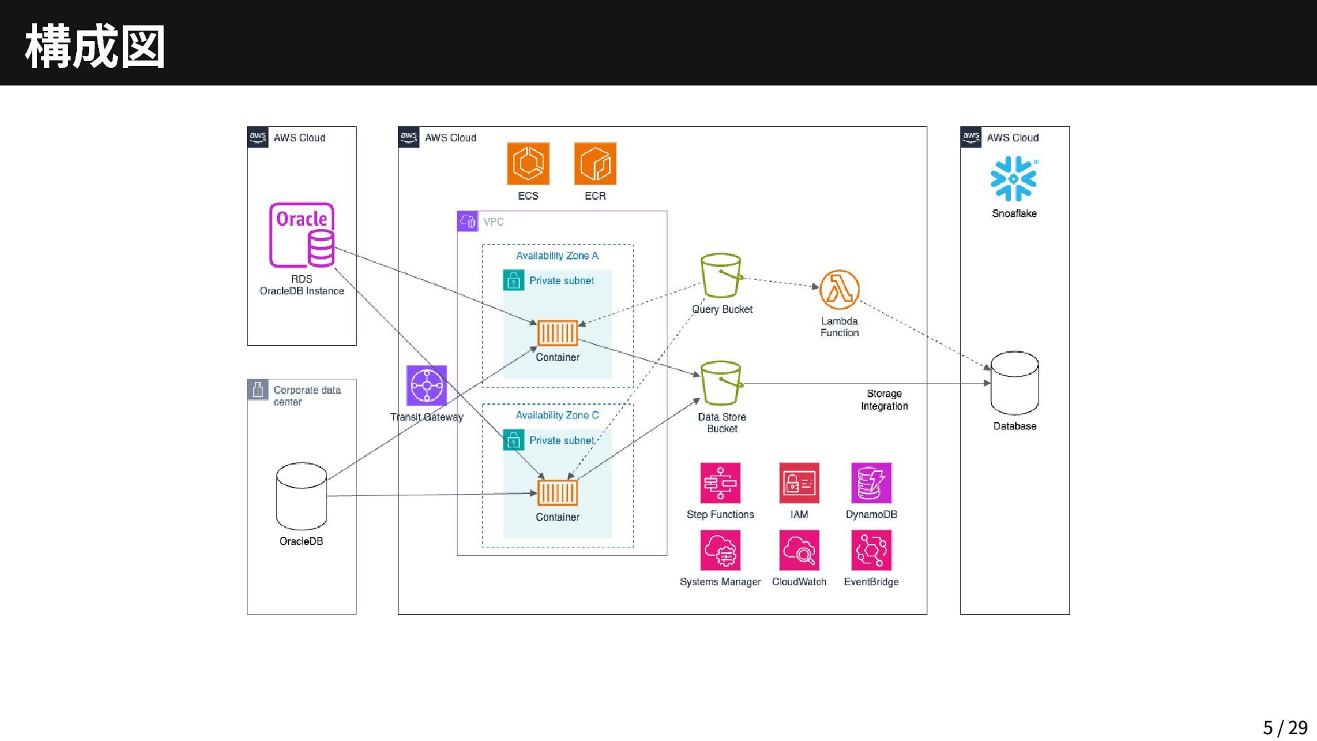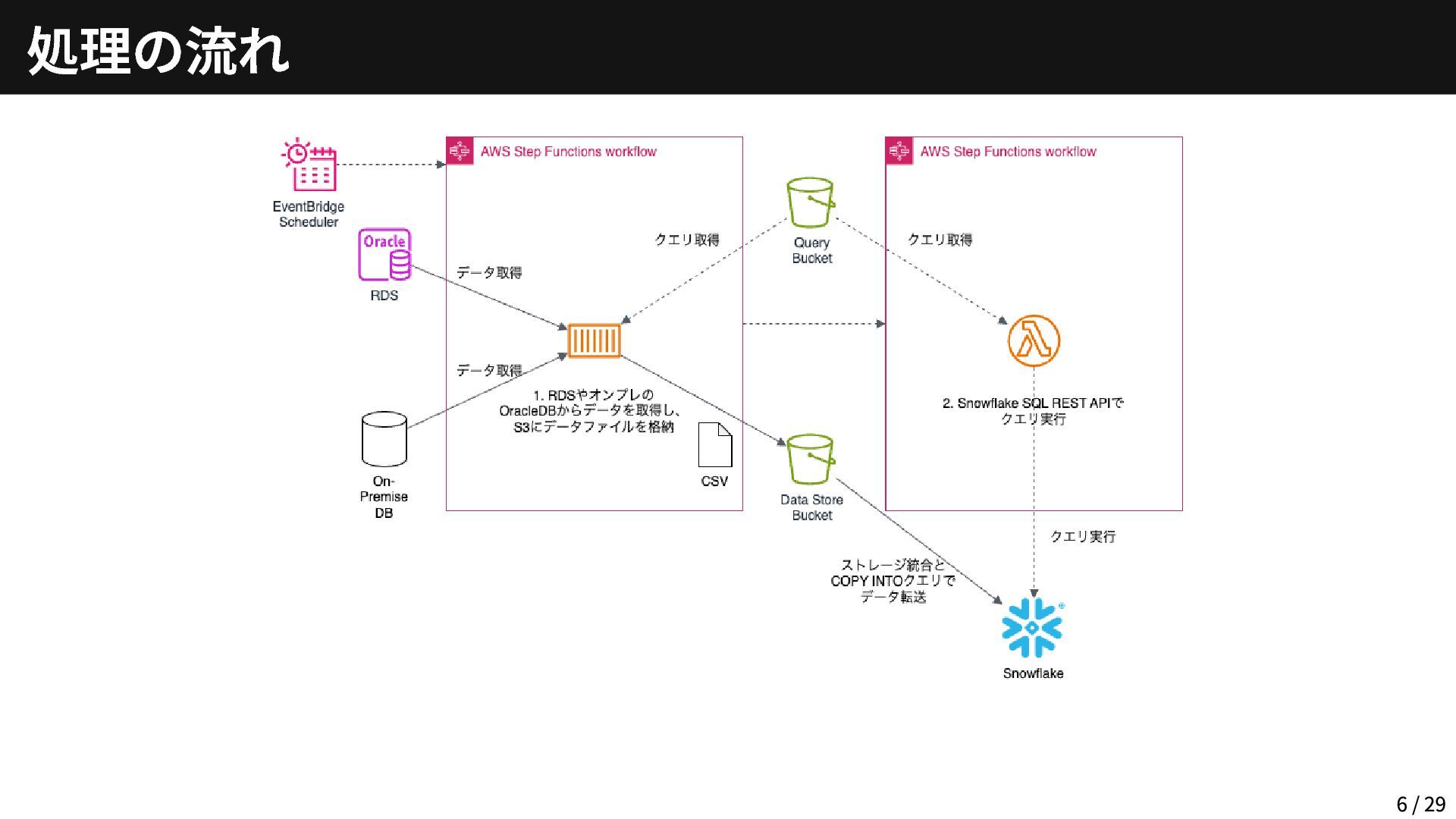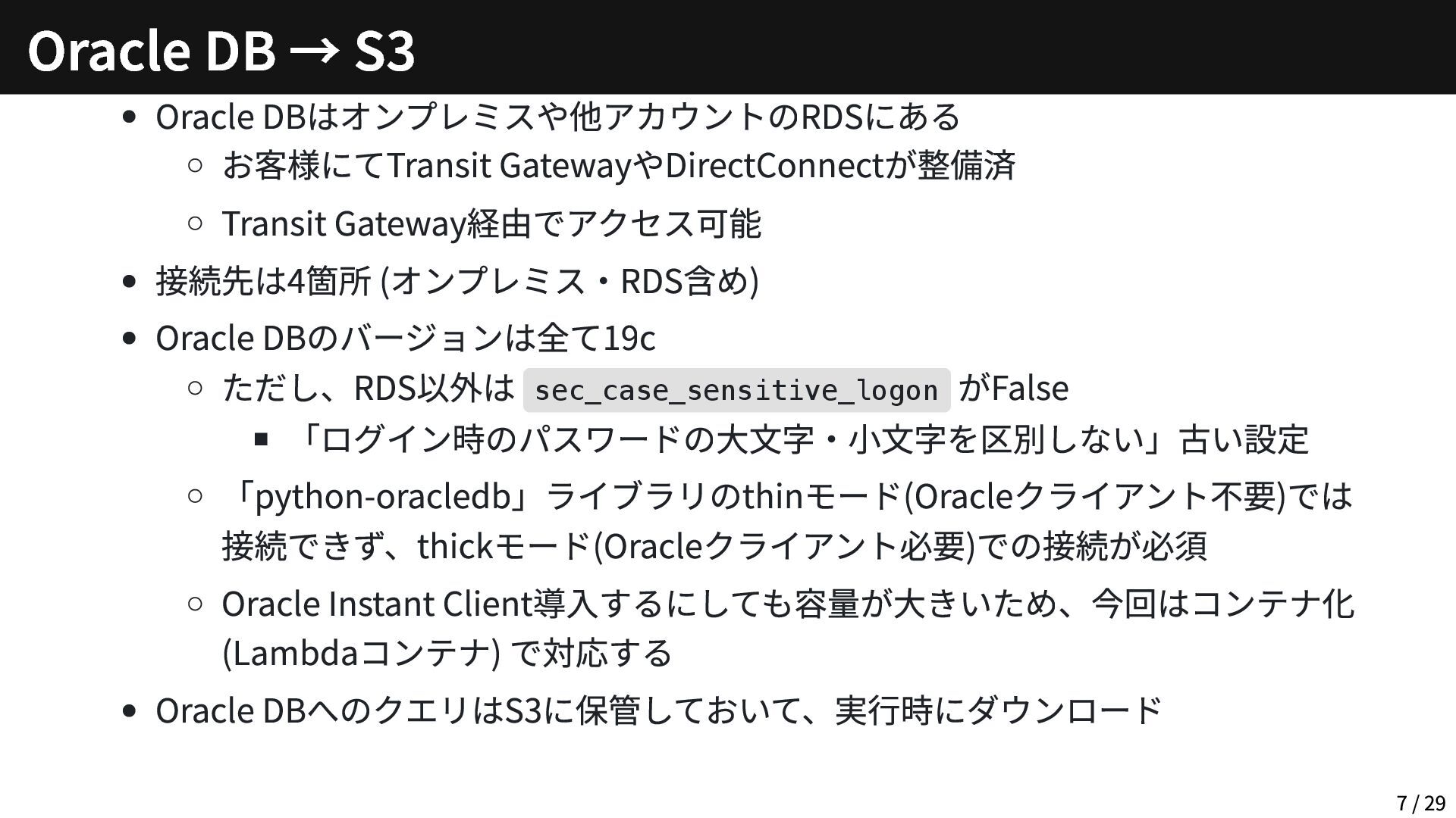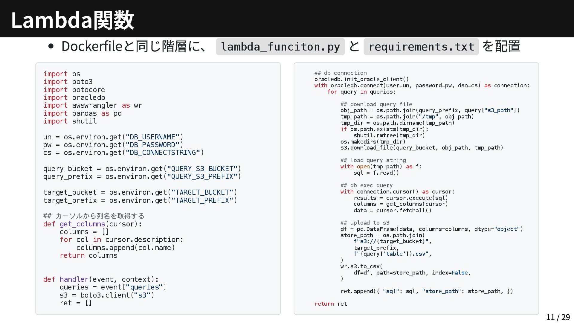 botocore import oracledb import awswrangler as wr import pandas as pd import shutil un = os.environ.get("DB_USERNAME") pw = os.environ.get("DB_PASSWORD") cs = os.environ.get("DB_CONNECTSTRING") query_bucket = os.environ.get("QUERY_S3_BUCKET") query_prefix = os.environ.get("QUERY_S3_PREFIX") target_bucket = os.environ.get("TARGET_BUCKET") target_prefix = os.environ.get("TARGET_PREFIX") ## カーソルから列名を取得する def get_columns(cursor): columns = [] for col in cursor.description: columns.append(col.name) return columns def handler(event, context): queries = event["queries"] s3 = boto3.client("s3") ret = [] ## db connection oracledb.init_oracle_client() with oracledb.connect(user=un, password=pw, dsn=cs) as connection: for query in queries: ## download query file obj_path = os.path.join(query_prefix, query["s3_path"]) tmp_path = os.path.join("/tmp", obj_path) tmp_dir = os.path.dirname(tmp_path) if os.path.exists(tmp_dir): shutil.rmtree(tmp_dir) os.makedirs(tmp_dir) s3.download_file(query_bucket, obj_path, tmp_path) ## load query string with open(tmp_path) as f: sql = f.read() ## db exec query with connection.cursor() as cursor: results = cursor.execute(sql) columns = get_columns(cursor) data = cursor.fetchall() ## upload to s3 df = pd.DataFrame(data, columns=columns, dtype="object") store_path = os.path.join( f"s3://{target_bucket}", target_prefix, f"{query['table']}.csv", ) wr.s3.to_csv( df=df, path=store_path, index=False, ) ret.append({ "sql": sql, "store_path": store_path, }) return ret Lambda関数 11 / 29