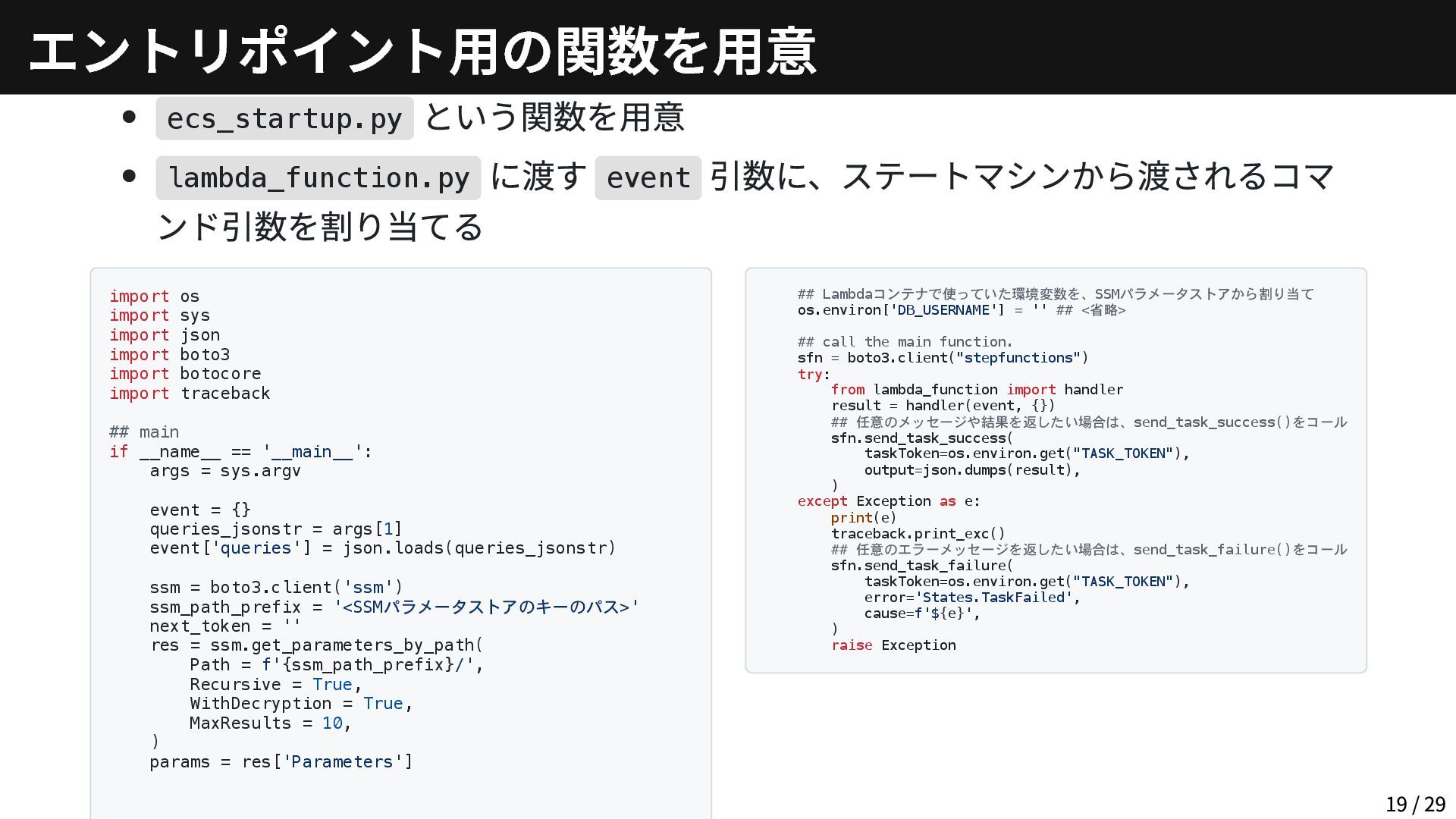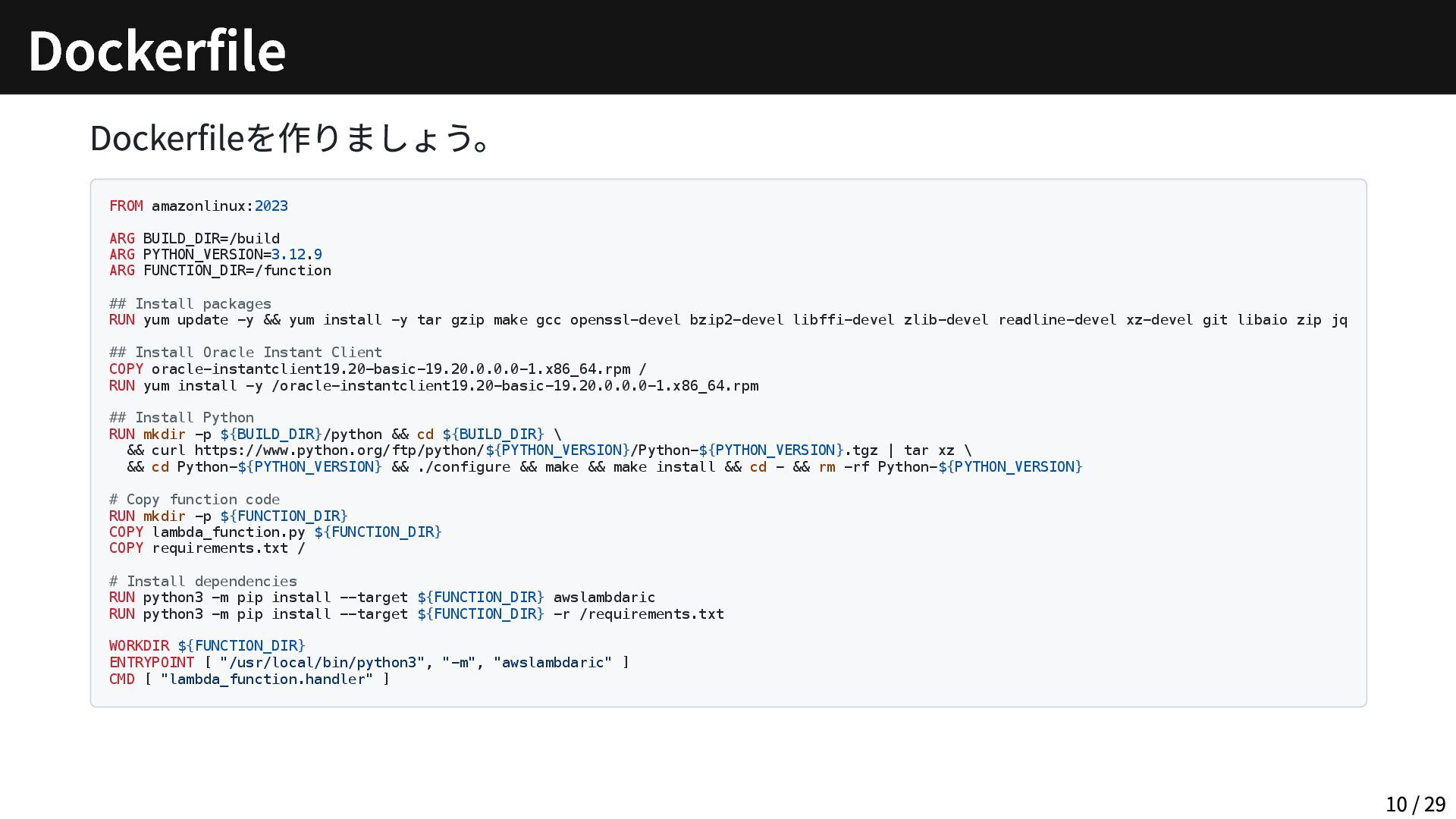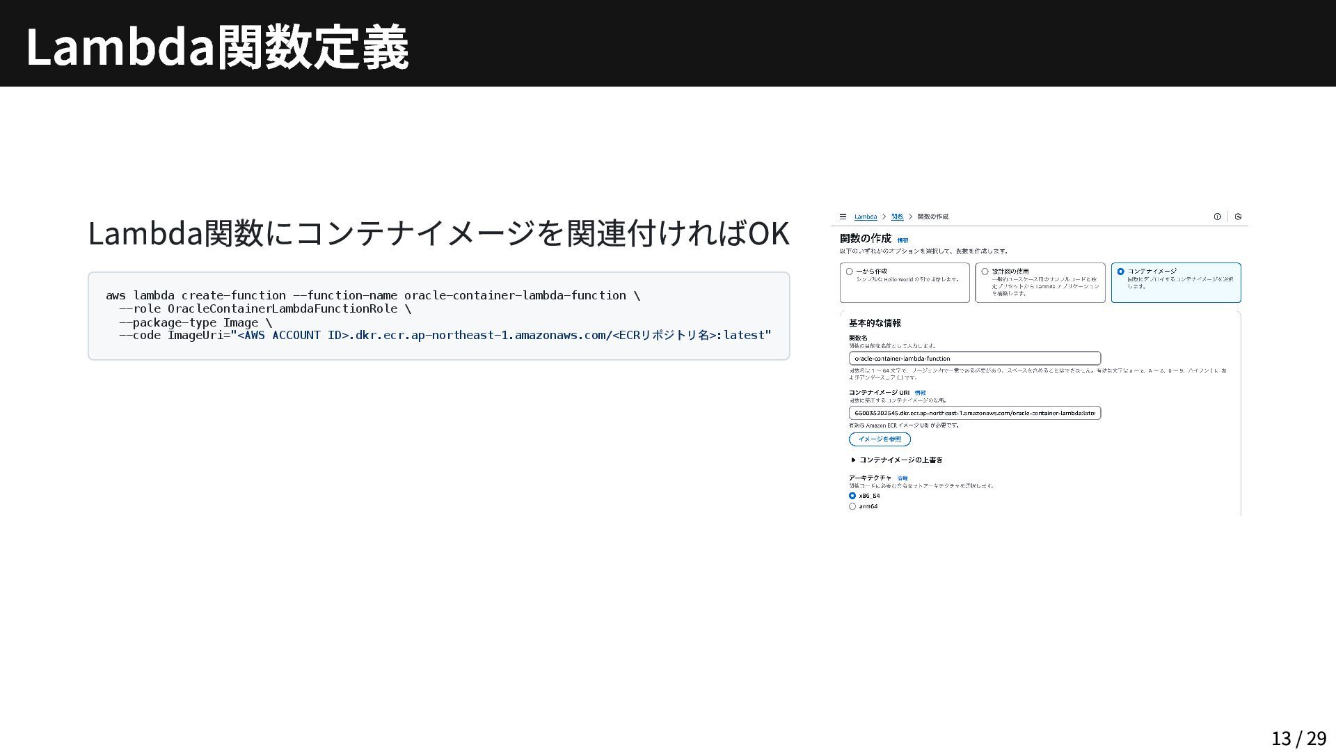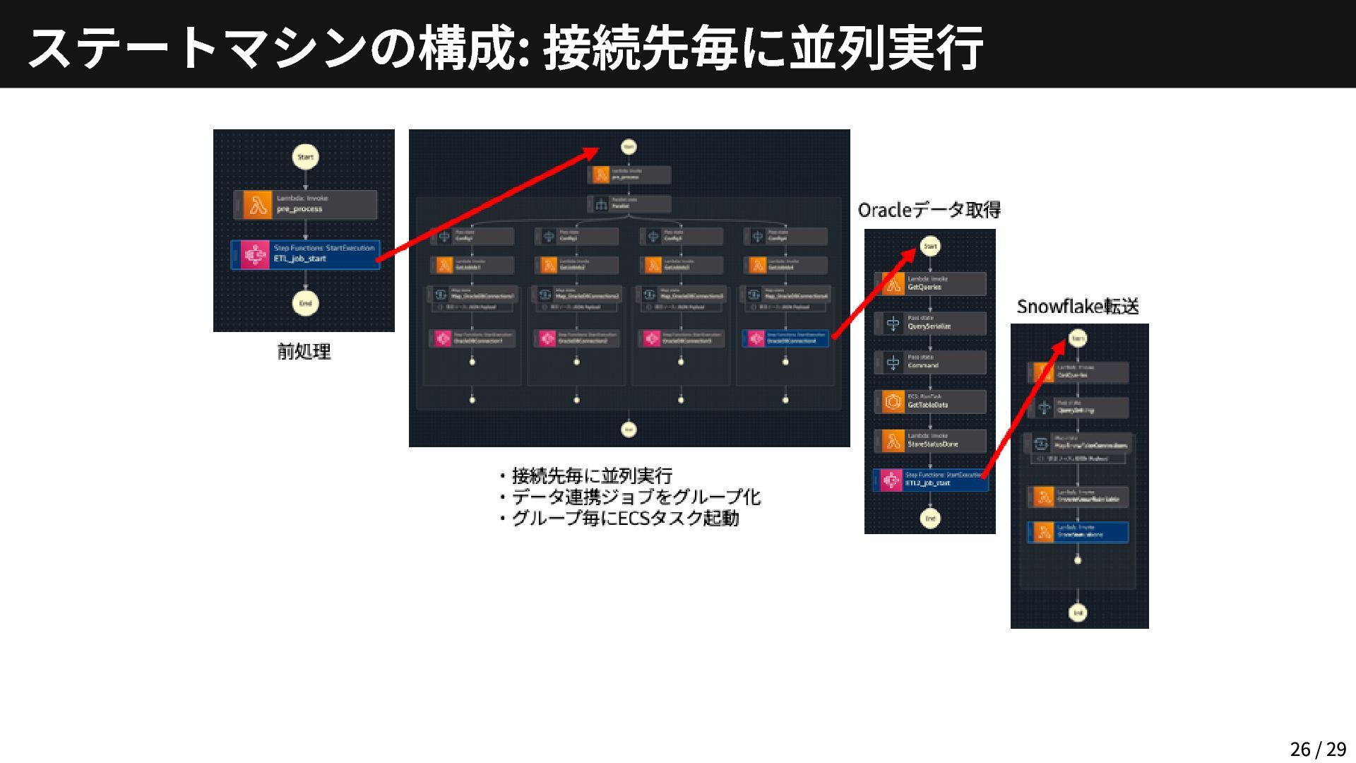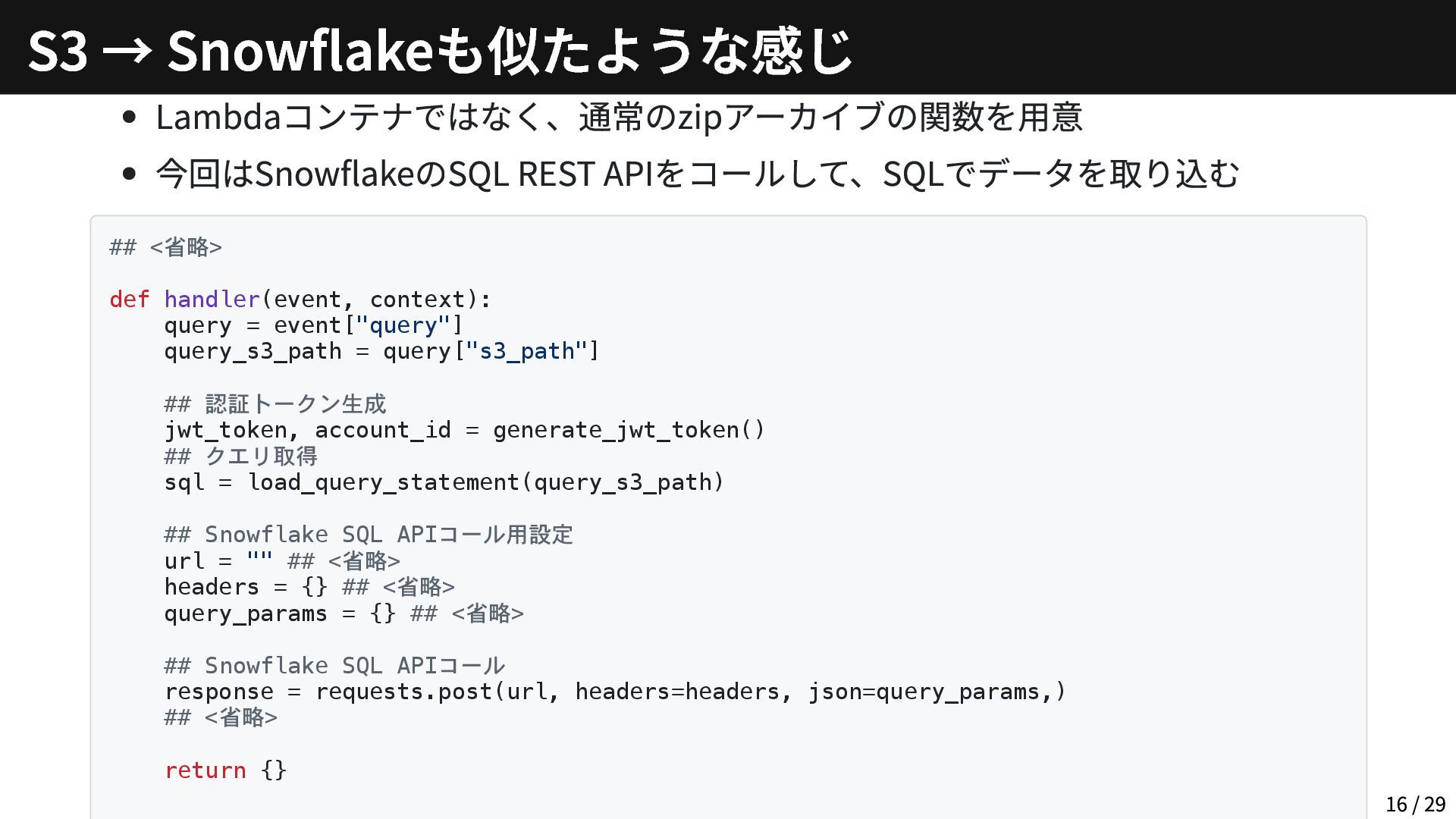botocore import oracledb import awswrangler as wr import pandas as pd import shutil un = os.environ.get("DB_USERNAME") pw = os.environ.get("DB_PASSWORD") cs = os.environ.get("DB_CONNECTSTRING") query_bucket = os.environ.get("QUERY_S3_BUCKET") query_prefix = os.environ.get("QUERY_S3_PREFIX") target_bucket = os.environ.get("TARGET_BUCKET") target_prefix = os.environ.get("TARGET_PREFIX") ## カーソルから列名を取得する def get_columns(cursor): columns = [] for col in cursor.description: columns.append(col.name) return columns def handler(event, context): queries = event["queries"] s3 = boto3.client("s3") ret = [] ## db connection oracledb.init_oracle_client() with oracledb.connect(user=un, password=pw, dsn=cs) as connection: for query in queries: ## download query file obj_path = os.path.join(query_prefix, query["s3_path"]) tmp_path = os.path.join("/tmp", obj_path) tmp_dir = os.path.dirname(tmp_path) if os.path.exists(tmp_dir): shutil.rmtree(tmp_dir) os.makedirs(tmp_dir) s3.download_file(query_bucket, obj_path, tmp_path) ## load query string with open(tmp_path) as f: sql = f.read() ## db exec query with connection.cursor() as cursor: results = cursor.execute(sql) columns = get_columns(cursor) data = cursor.fetchall() ## upload to s3 df = pd.DataFrame(data, columns=columns, dtype="object") store_path = os.path.join( f"s3://{target_bucket}", target_prefix, f"{query['table']}.csv", ) wr.s3.to_csv( df=df, path=store_path, index=False, ) ret.append({ "sql": sql, "store_path": store_path, }) return ret Lambda関数 11 / 29
