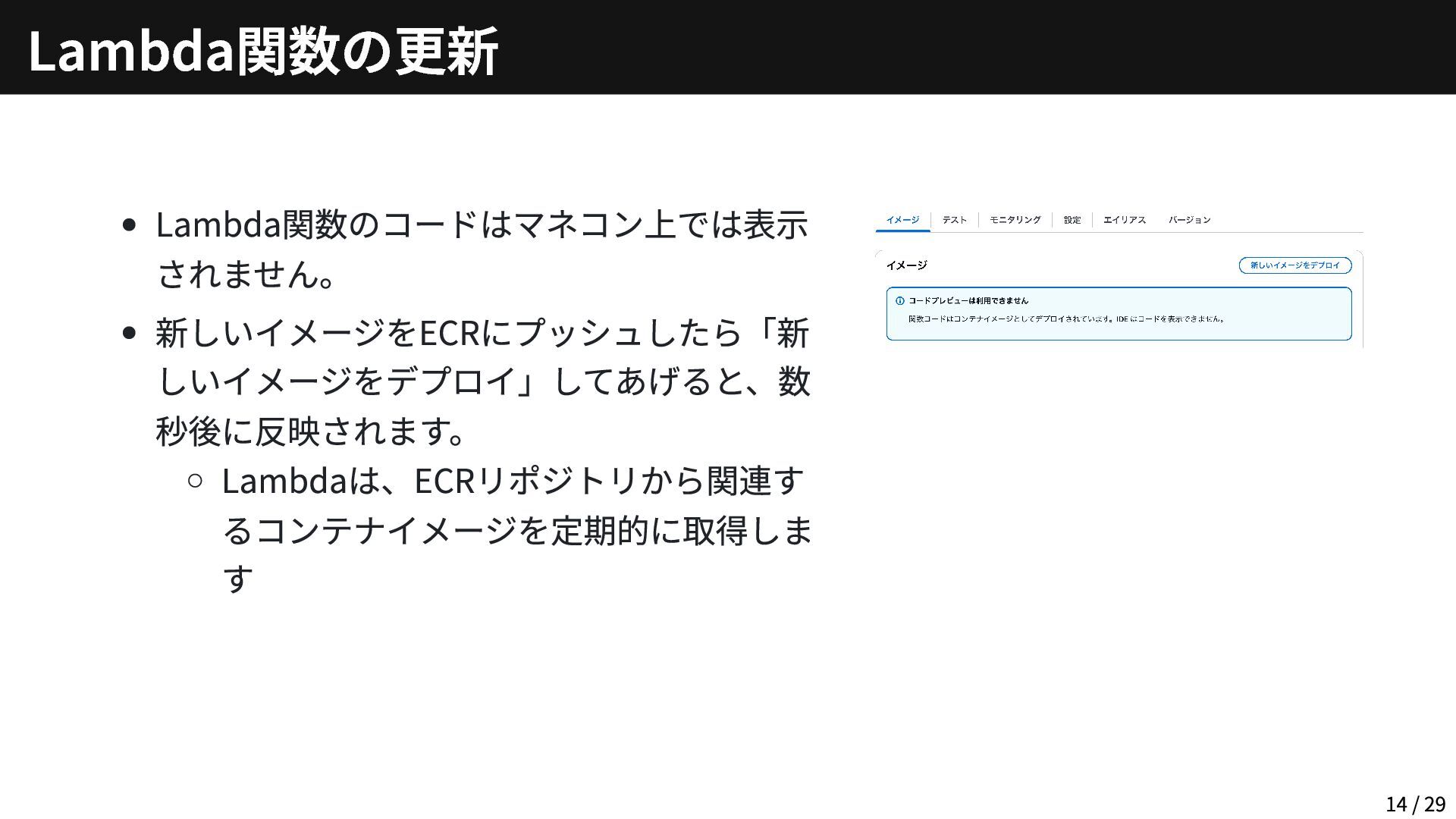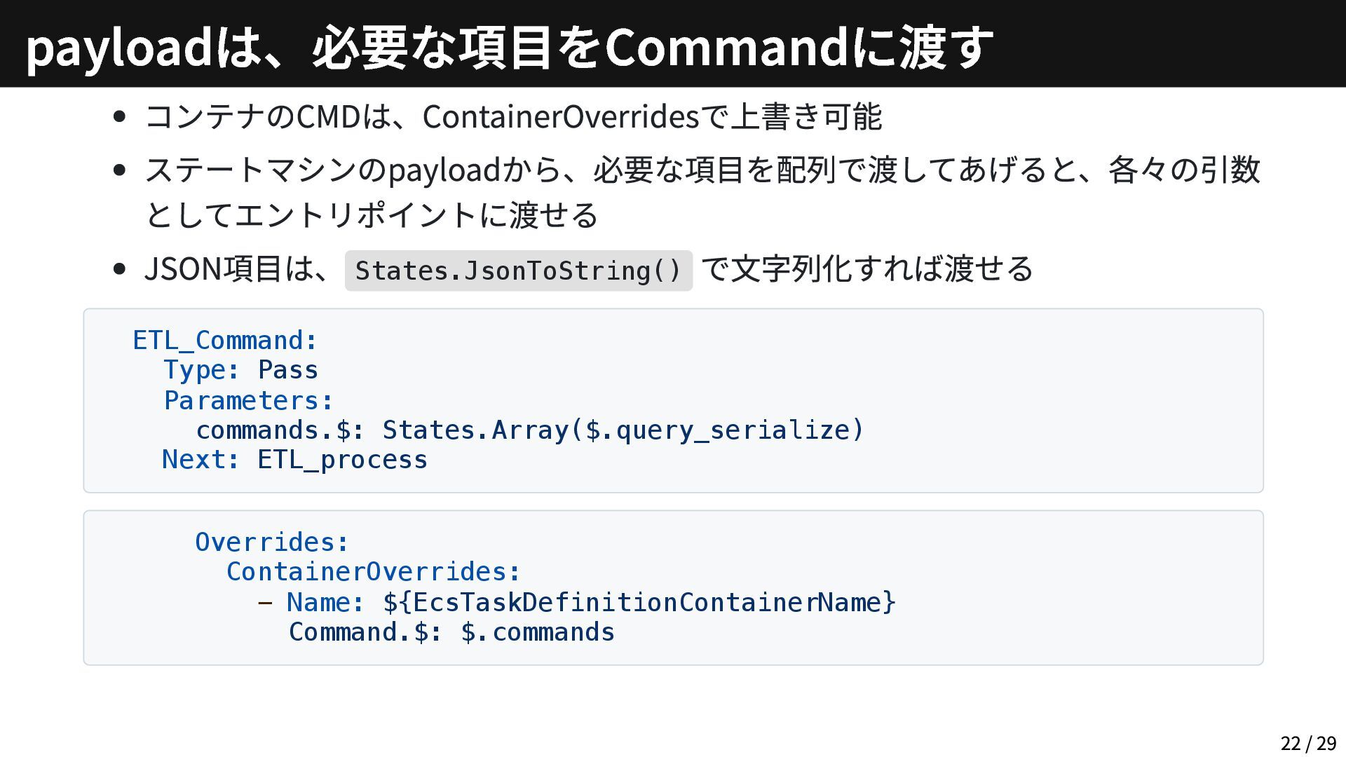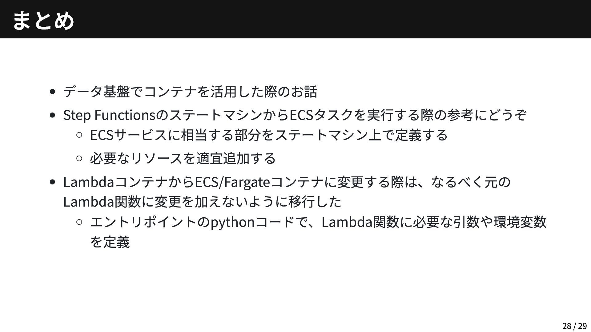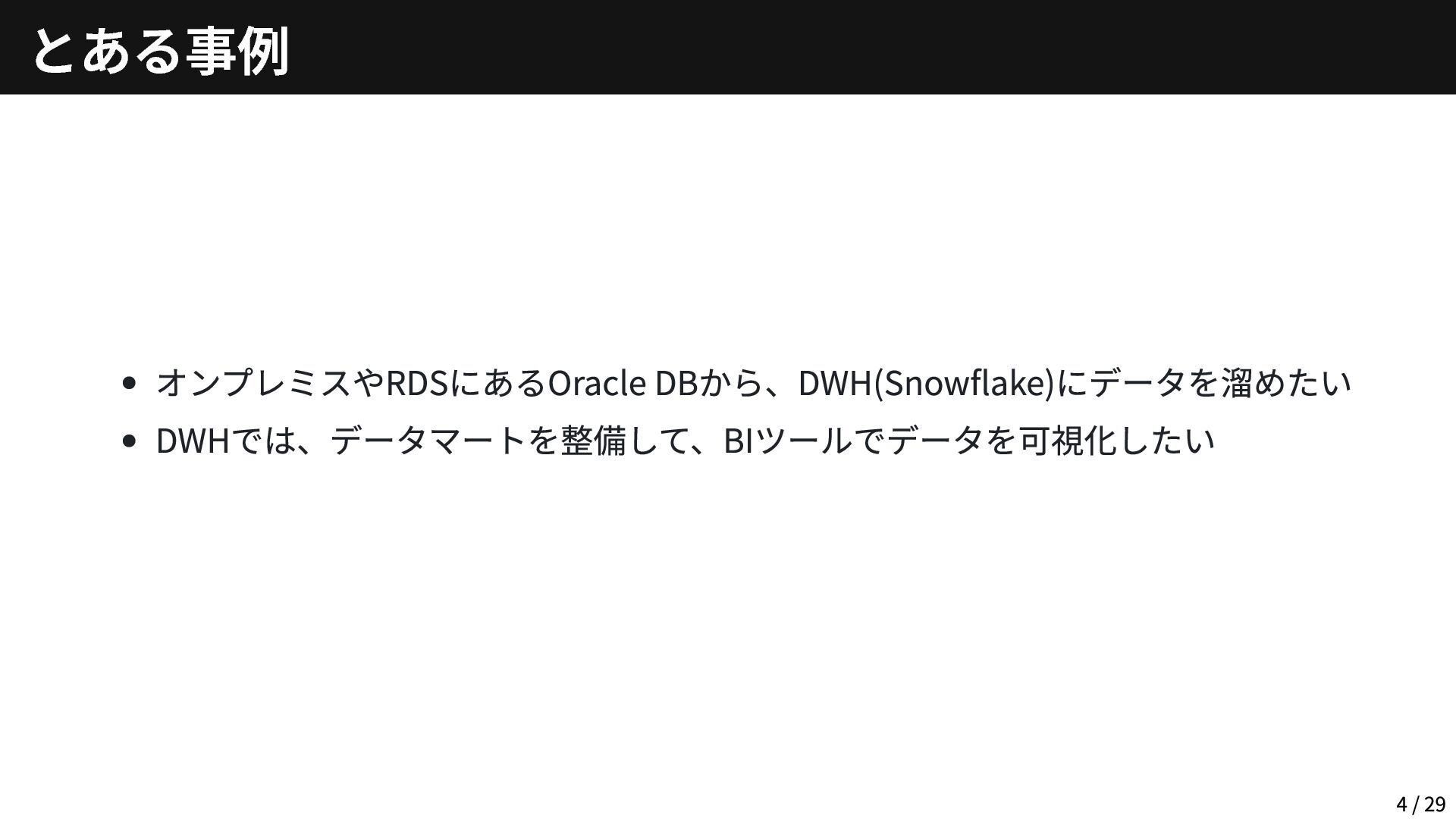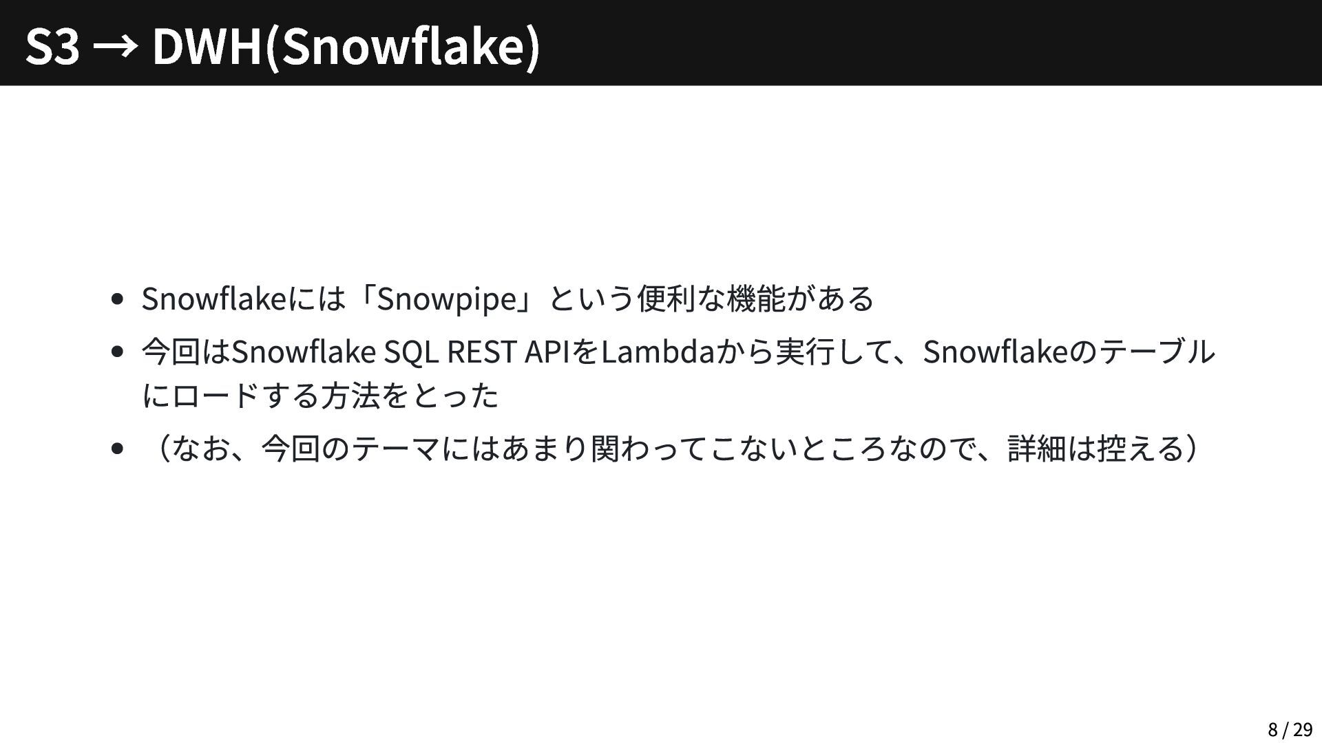 botocore import oracledb import awswrangler as wr import pandas as pd import shutil un = os.environ.get("DB_USERNAME") pw = os.environ.get("DB_PASSWORD") cs = os.environ.get("DB_CONNECTSTRING") query_bucket = os.environ.get("QUERY_S3_BUCKET") query_prefix = os.environ.get("QUERY_S3_PREFIX") target_bucket = os.environ.get("TARGET_BUCKET") target_prefix = os.environ.get("TARGET_PREFIX") ## カーソルから列名を取得する def get_columns(cursor): columns = [] for col in cursor.description: columns.append(col.name) return columns def handler(event, context): queries = event["queries"] s3 = boto3.client("s3") ret = [] ## db connection oracledb.init_oracle_client() with oracledb.connect(user=un, password=pw, dsn=cs) as connection: for query in queries: ## download query file obj_path = os.path.join(query_prefix, query["s3_path"]) tmp_path = os.path.join("/tmp", obj_path) tmp_dir = os.path.dirname(tmp_path) if os.path.exists(tmp_dir): shutil.rmtree(tmp_dir) os.makedirs(tmp_dir) s3.download_file(query_bucket, obj_path, tmp_path) ## load query string with open(tmp_path) as f: sql = f.read() ## db exec query with connection.cursor() as cursor: results = cursor.execute(sql) columns = get_columns(cursor) data = cursor.fetchall() ## upload to s3 df = pd.DataFrame(data, columns=columns, dtype="object") store_path = os.path.join( f"s3://{target_bucket}", target_prefix, f"{query['table']}.csv", ) wr.s3.to_csv( df=df, path=store_path, index=False, ) ret.append({ "sql": sql, "store_path": store_path, }) return ret Lambda関数 11 / 29