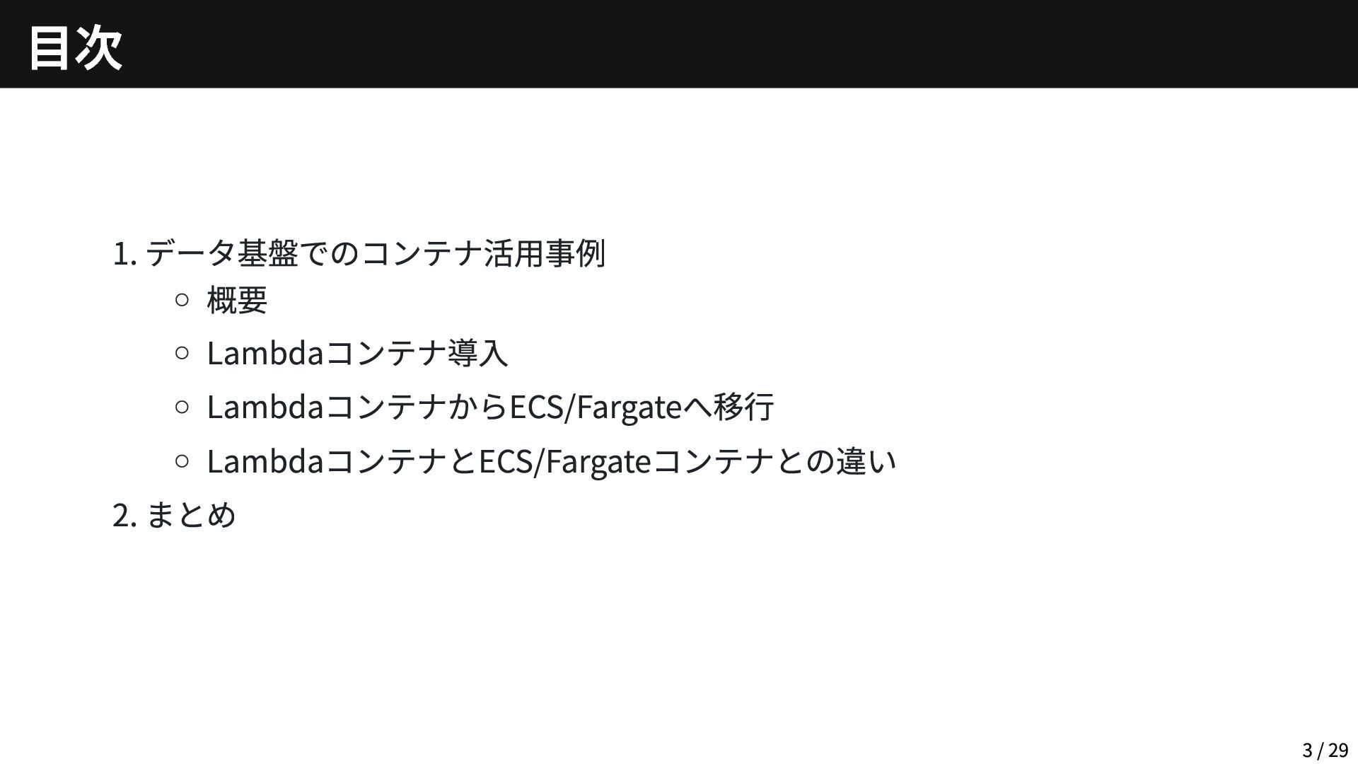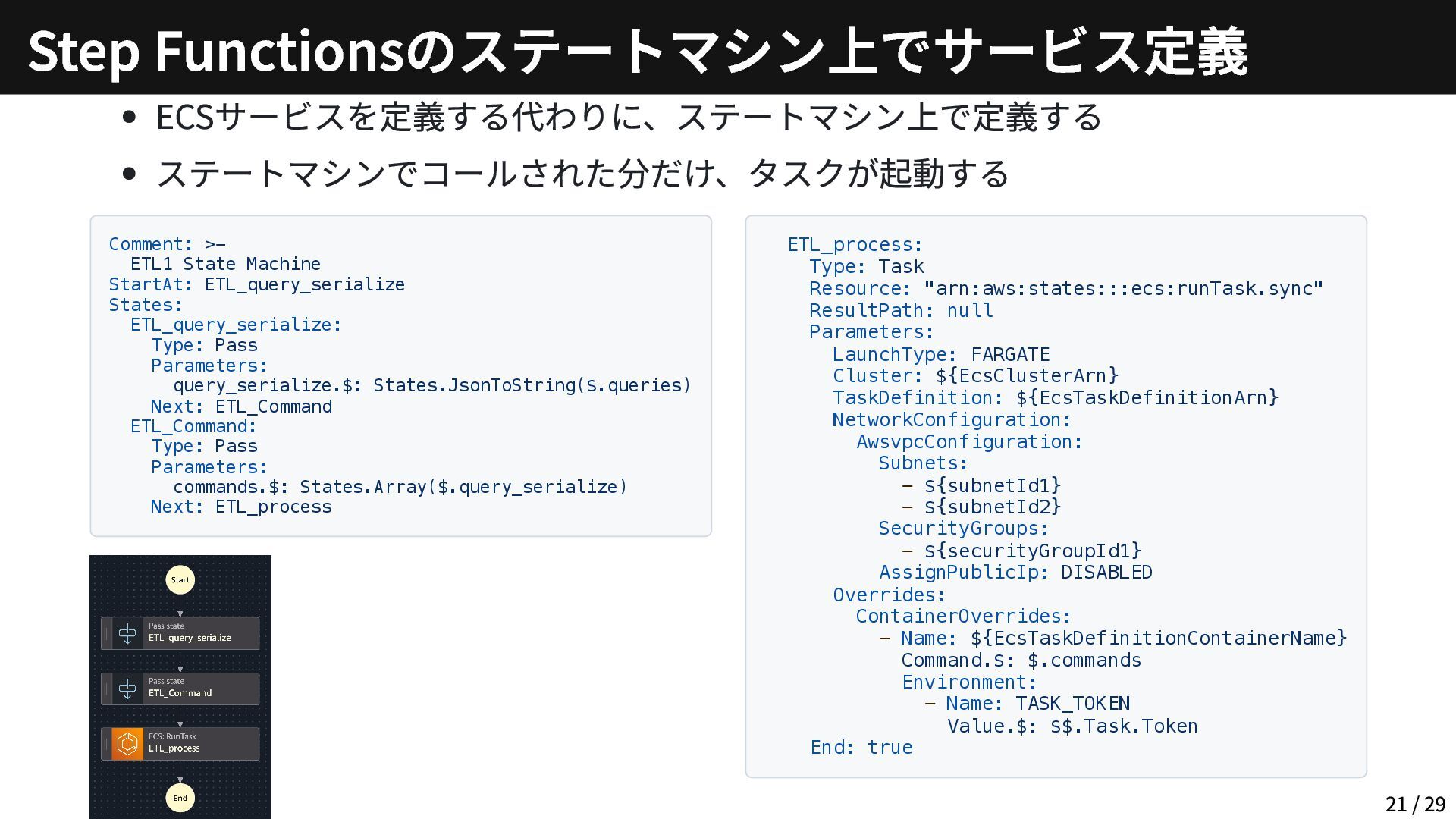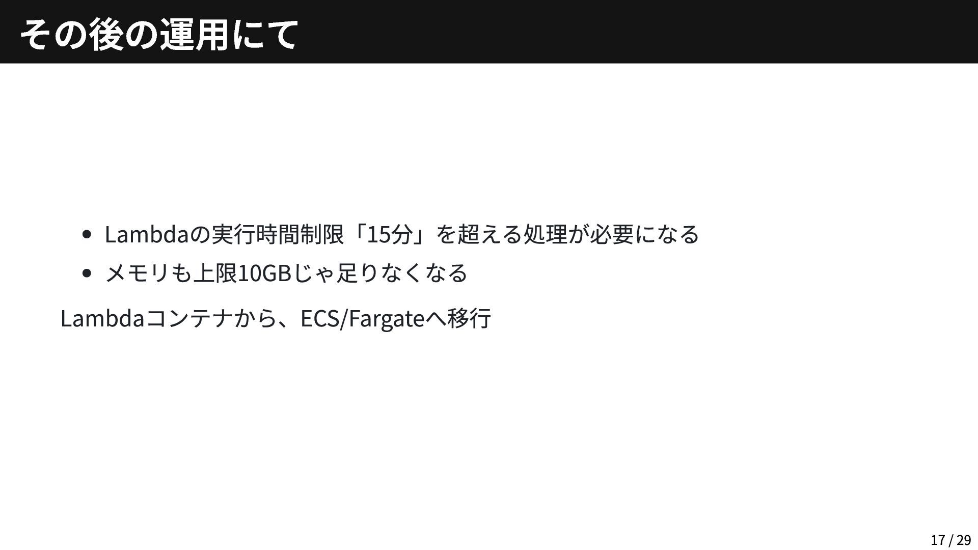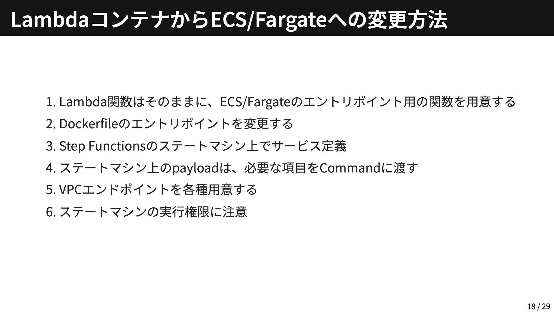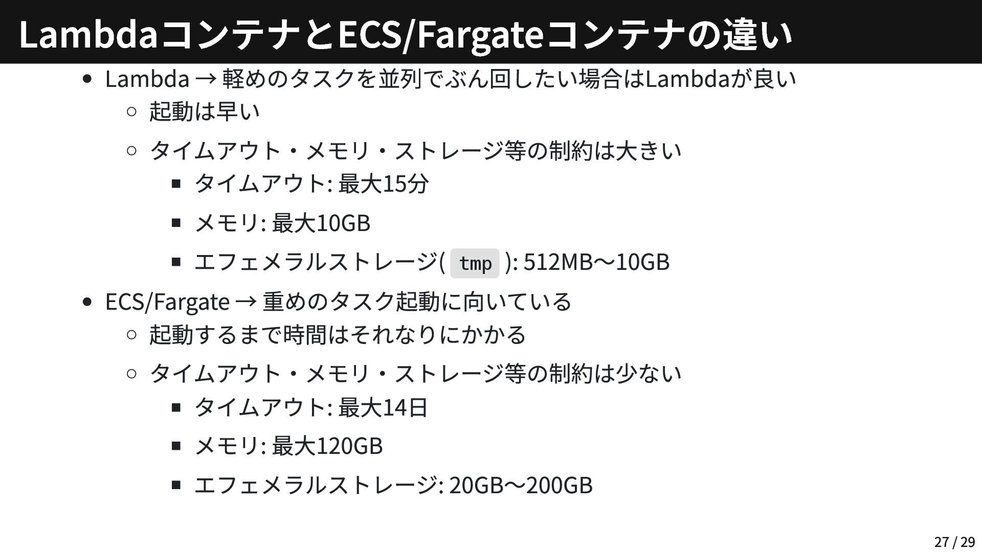 botocore import oracledb import awswrangler as wr import pandas as pd import shutil un = os.environ.get("DB_USERNAME") pw = os.environ.get("DB_PASSWORD") cs = os.environ.get("DB_CONNECTSTRING") query_bucket = os.environ.get("QUERY_S3_BUCKET") query_prefix = os.environ.get("QUERY_S3_PREFIX") target_bucket = os.environ.get("TARGET_BUCKET") target_prefix = os.environ.get("TARGET_PREFIX") ## カーソルから列名を取得する def get_columns(cursor): columns = [] for col in cursor.description: columns.append(col.name) return columns def handler(event, context): queries = event["queries"] s3 = boto3.client("s3") ret = [] ## db connection oracledb.init_oracle_client() with oracledb.connect(user=un, password=pw, dsn=cs) as connection: for query in queries: ## download query file obj_path = os.path.join(query_prefix, query["s3_path"]) tmp_path = os.path.join("/tmp", obj_path) tmp_dir = os.path.dirname(tmp_path) if os.path.exists(tmp_dir): shutil.rmtree(tmp_dir) os.makedirs(tmp_dir) s3.download_file(query_bucket, obj_path, tmp_path) ## load query string with open(tmp_path) as f: sql = f.read() ## db exec query with connection.cursor() as cursor: results = cursor.execute(sql) columns = get_columns(cursor) data = cursor.fetchall() ## upload to s3 df = pd.DataFrame(data, columns=columns, dtype="object") store_path = os.path.join( f"s3://{target_bucket}", target_prefix, f"{query['table']}.csv", ) wr.s3.to_csv( df=df, path=store_path, index=False, ) ret.append({ "sql": sql, "store_path": store_path, }) return ret Lambda関数 11 / 29