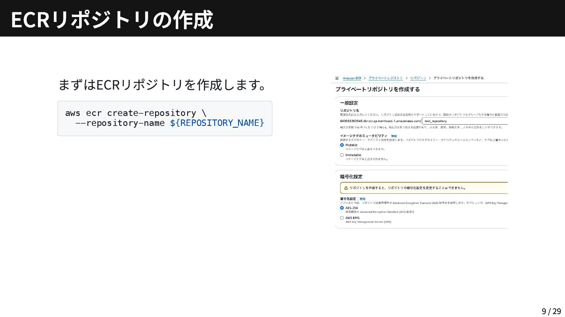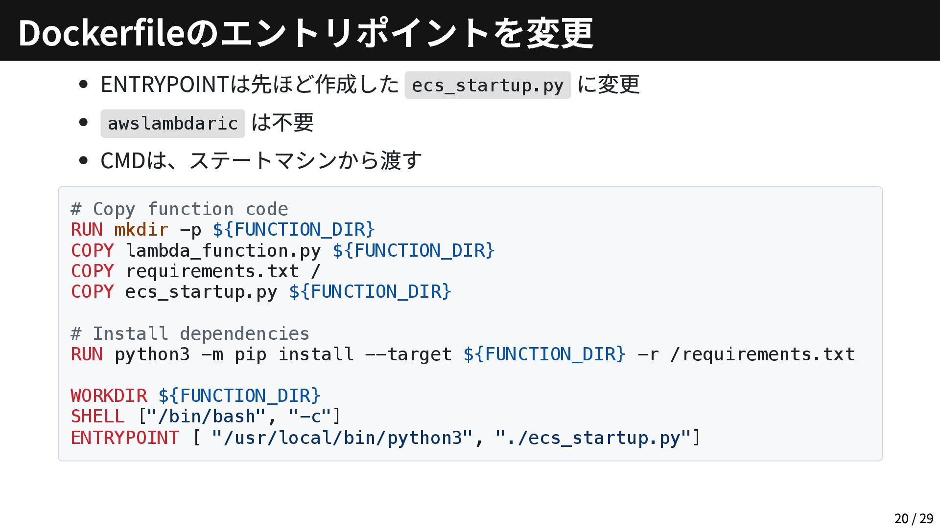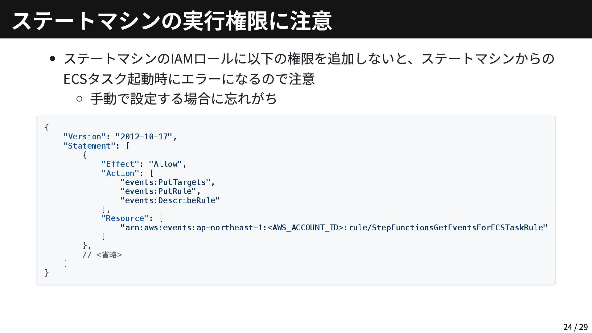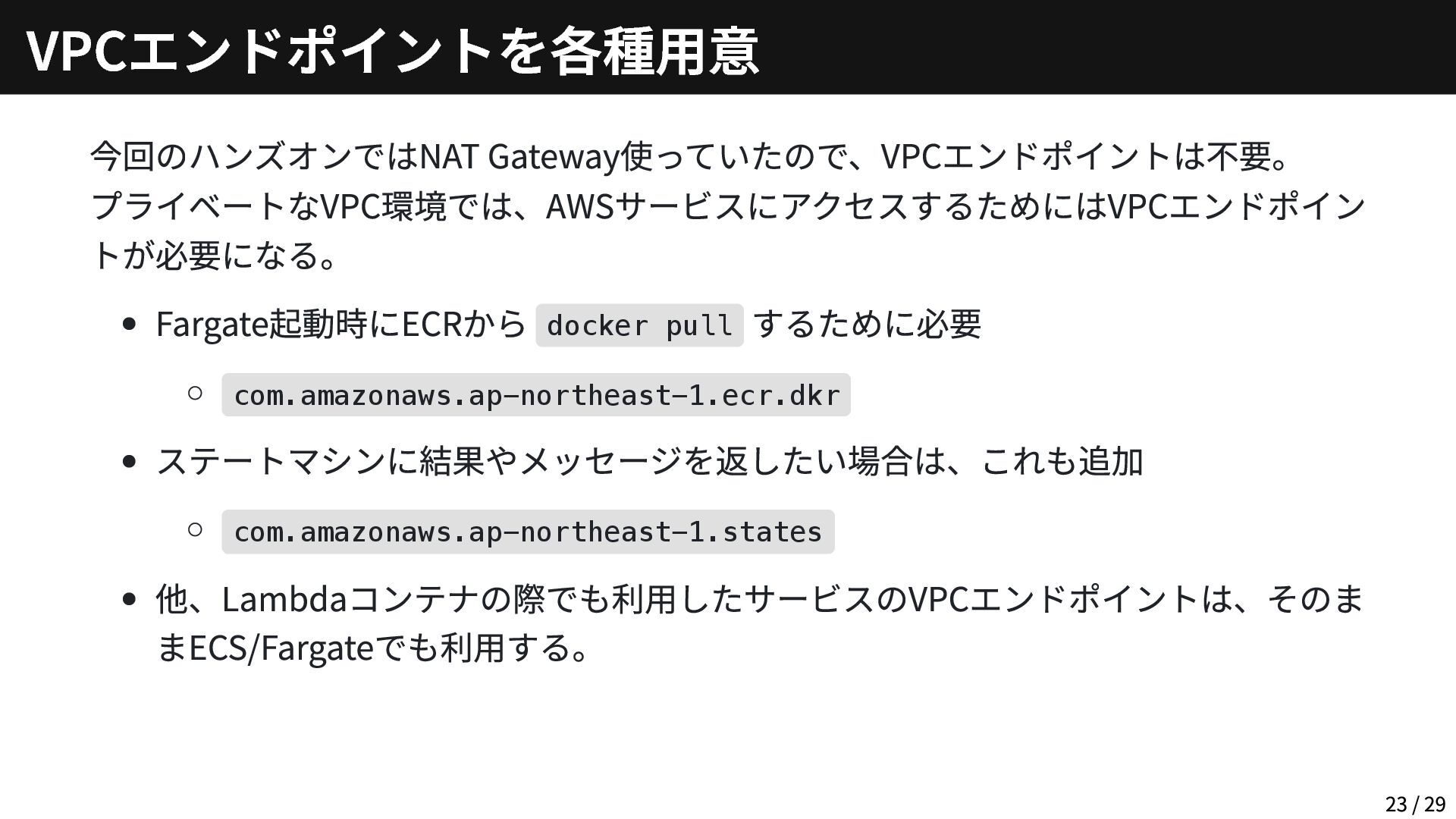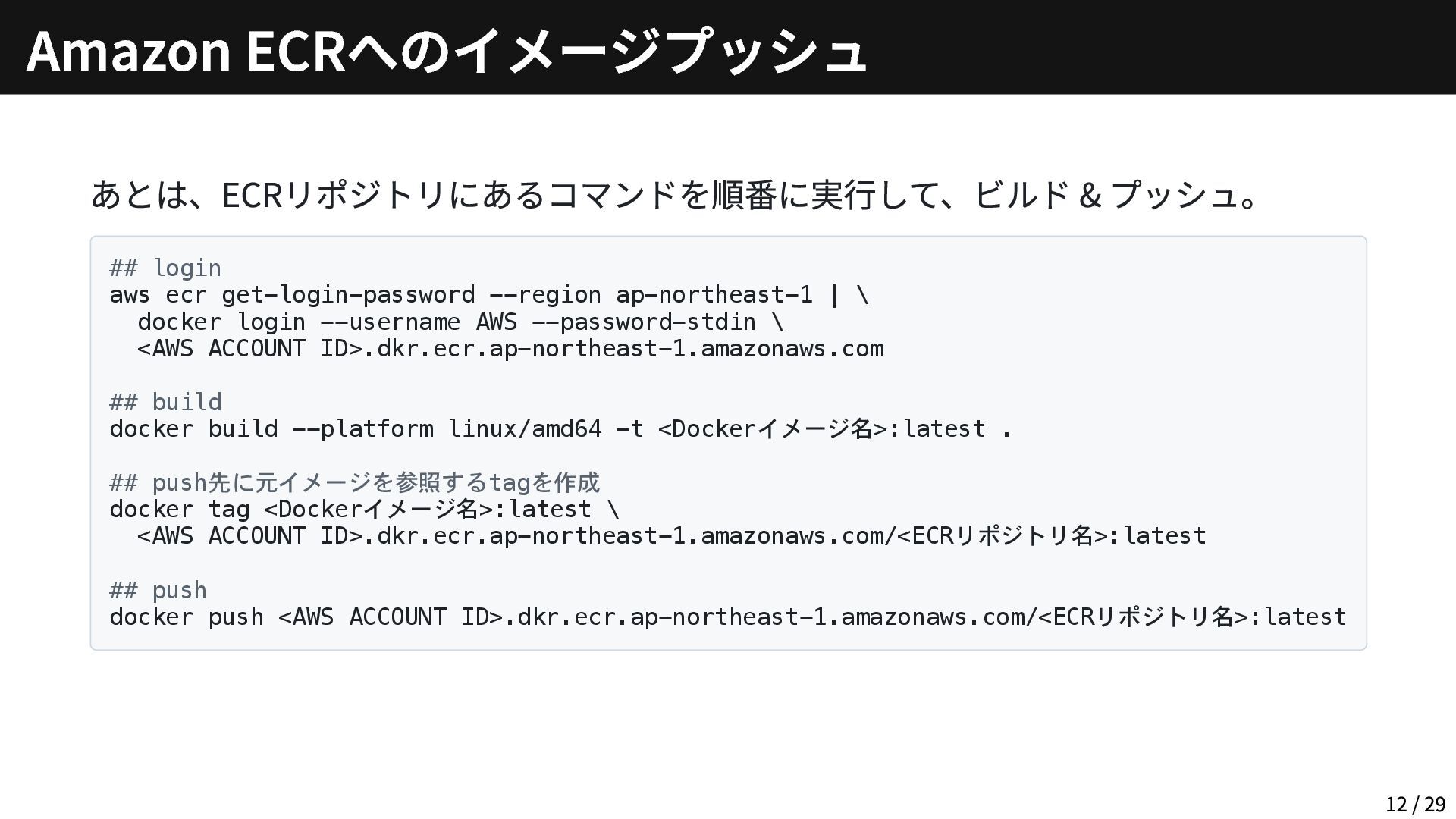 botocore import oracledb import awswrangler as wr import pandas as pd import shutil un = os.environ.get("DB_USERNAME") pw = os.environ.get("DB_PASSWORD") cs = os.environ.get("DB_CONNECTSTRING") query_bucket = os.environ.get("QUERY_S3_BUCKET") query_prefix = os.environ.get("QUERY_S3_PREFIX") target_bucket = os.environ.get("TARGET_BUCKET") target_prefix = os.environ.get("TARGET_PREFIX") ## カーソルから列名を取得する def get_columns(cursor): columns = [] for col in cursor.description: columns.append(col.name) return columns def handler(event, context): queries = event["queries"] s3 = boto3.client("s3") ret = [] ## db connection oracledb.init_oracle_client() with oracledb.connect(user=un, password=pw, dsn=cs) as connection: for query in queries: ## download query file obj_path = os.path.join(query_prefix, query["s3_path"]) tmp_path = os.path.join("/tmp", obj_path) tmp_dir = os.path.dirname(tmp_path) if os.path.exists(tmp_dir): shutil.rmtree(tmp_dir) os.makedirs(tmp_dir) s3.download_file(query_bucket, obj_path, tmp_path) ## load query string with open(tmp_path) as f: sql = f.read() ## db exec query with connection.cursor() as cursor: results = cursor.execute(sql) columns = get_columns(cursor) data = cursor.fetchall() ## upload to s3 df = pd.DataFrame(data, columns=columns, dtype="object") store_path = os.path.join( f"s3://{target_bucket}", target_prefix, f"{query['table']}.csv", ) wr.s3.to_csv( df=df, path=store_path, index=False, ) ret.append({ "sql": sql, "store_path": store_path, }) return ret Lambda関数 11 / 29