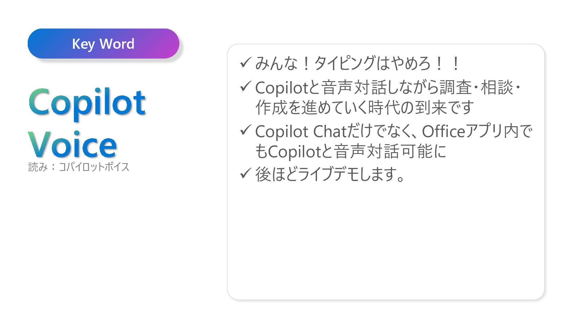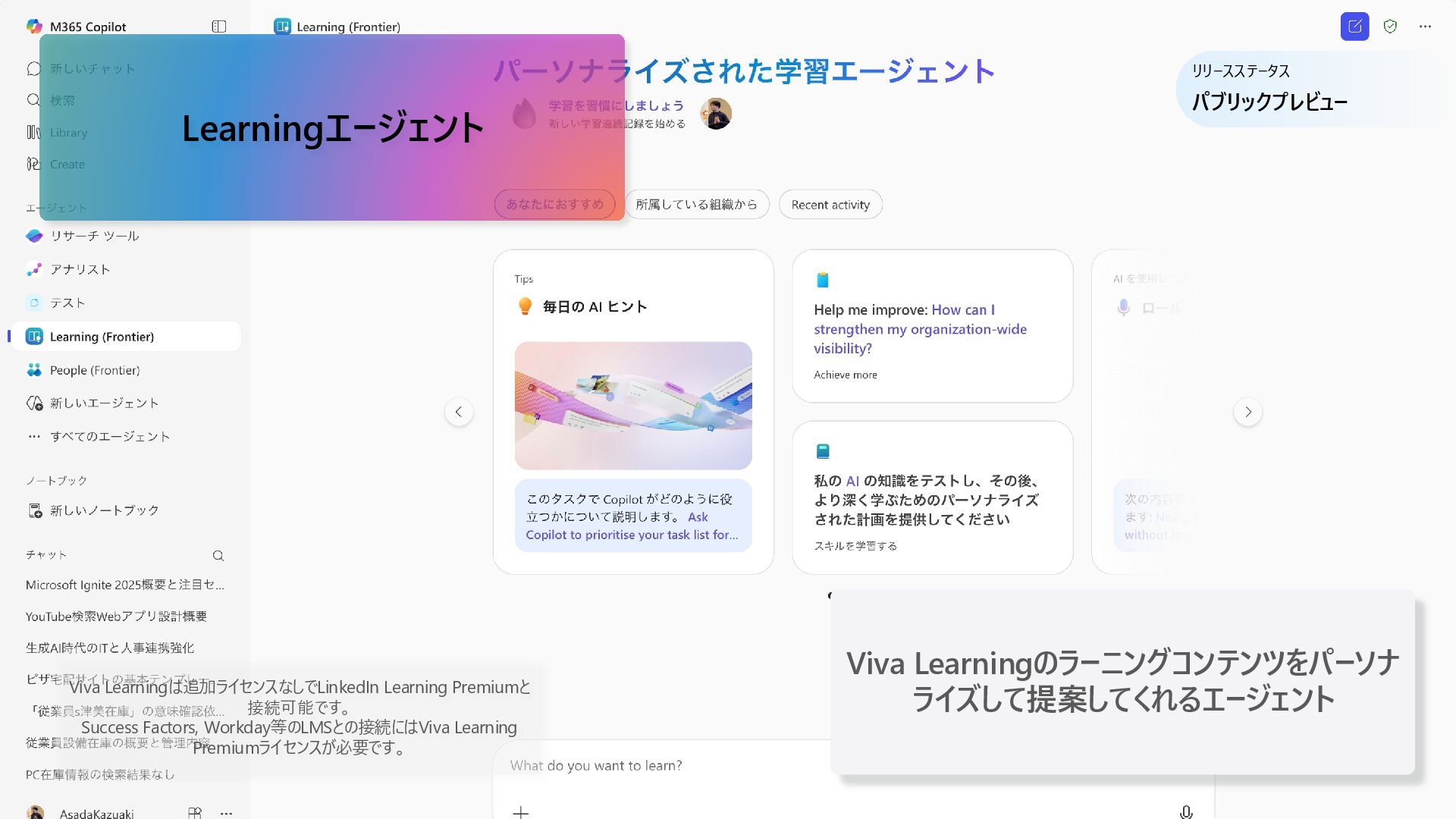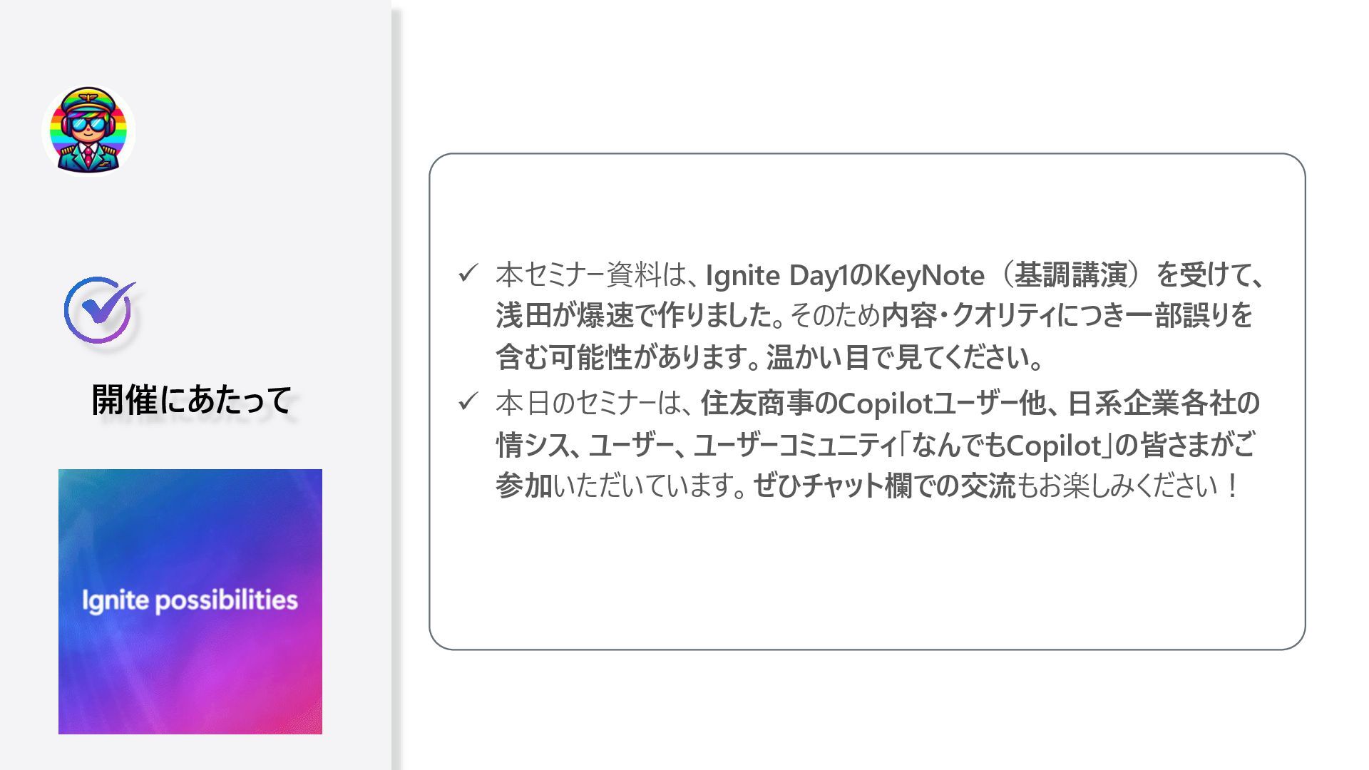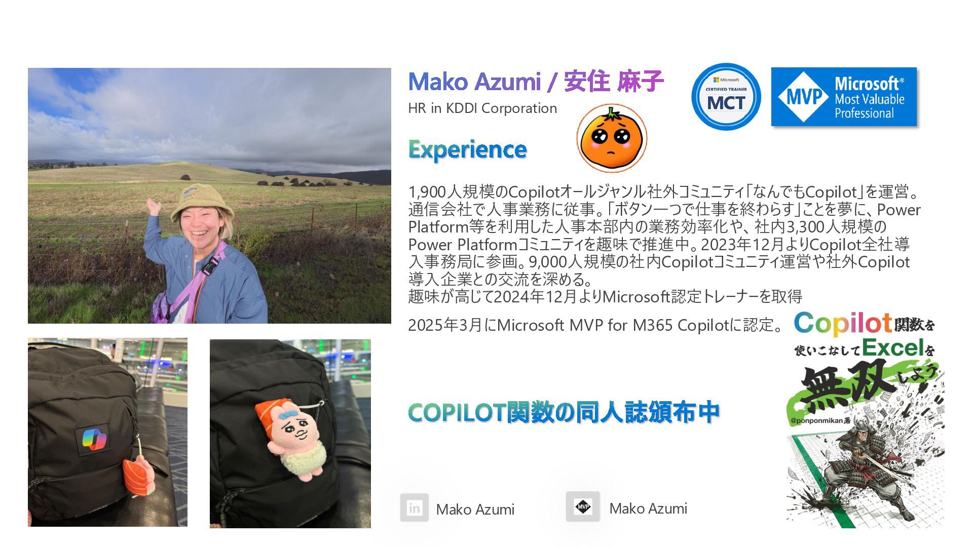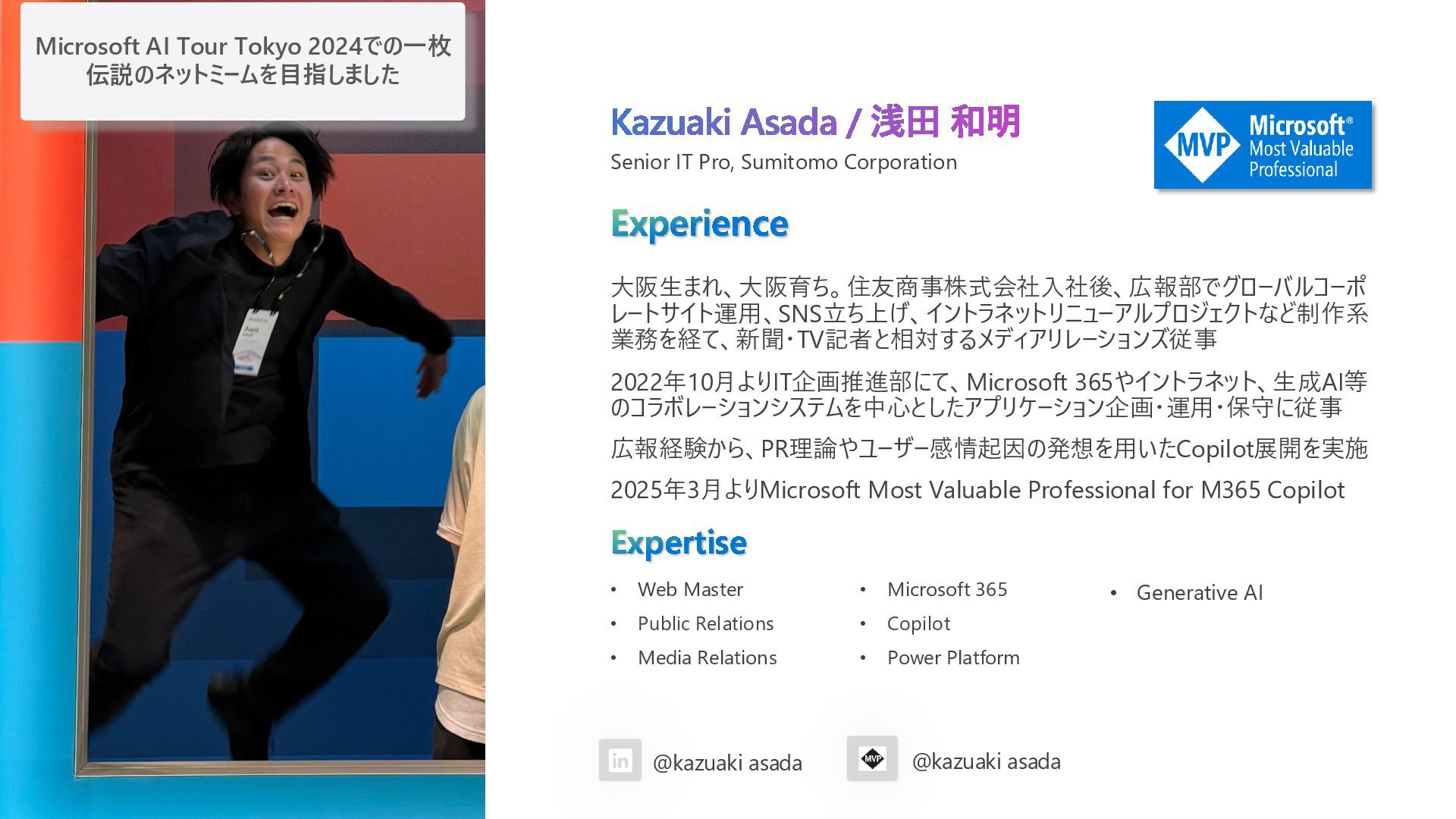 大阪生まれ、大阪育ち。住友商事株式会社入社後、広報部でグローバルコーポ レートサイト運用、SNS立ち上げ、イントラネットリニューアルプロジェクトなど制作系 業務を経て、新聞・TV記者と相対するメディアリレーションズ従事 2022年10月よりIT企画推進部にて、Microsoft 365やイントラネット、生成AI等 のコラボレーションシステムを中心としたアプリケーション企画・運用・保守に従事 広報経験から、PR理論やユーザー感情起因の発想を用いたCopilot展開を実施 2025年3月よりMicrosoft Most Valuable Professional for M365 Copilot Experience Expertise • Web Master • Public Relations • Media Relations • Microsoft 365 • Copilot • Power Platform • Generative AI @kazuaki asada @kazuaki asada Microsoft AI Tour Tokyo 2024での一枚 伝説のネットミームを目指しました