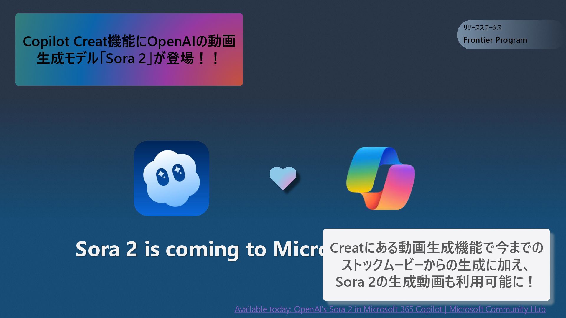 生成モデル「Sora 2」が登場!! Creatにある動画生成機能で今までの ストックムービーからの生成に加え、 Sora 2の生成動画も利用可能に! リリースステータス Frontier Program Available today: OpenAI's Sora 2 in Microsoft 365 Copilot | Microsoft Community Hub