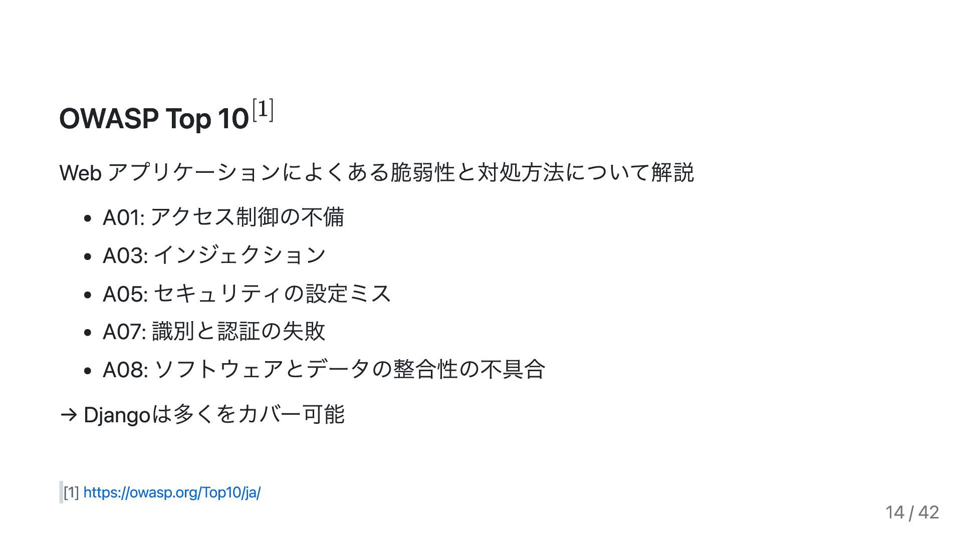 セキュリティの設定ミス A07: 識別と認証の失敗 A08: ソフトウェアとデータの整合性の不具合 → Djangoは多くをカバー可能 [1] https://owasp.org/Top10/ja/ 14 / 42