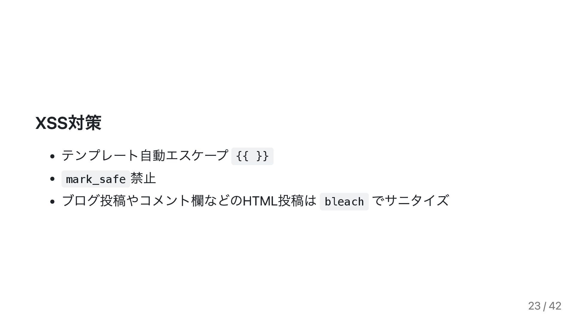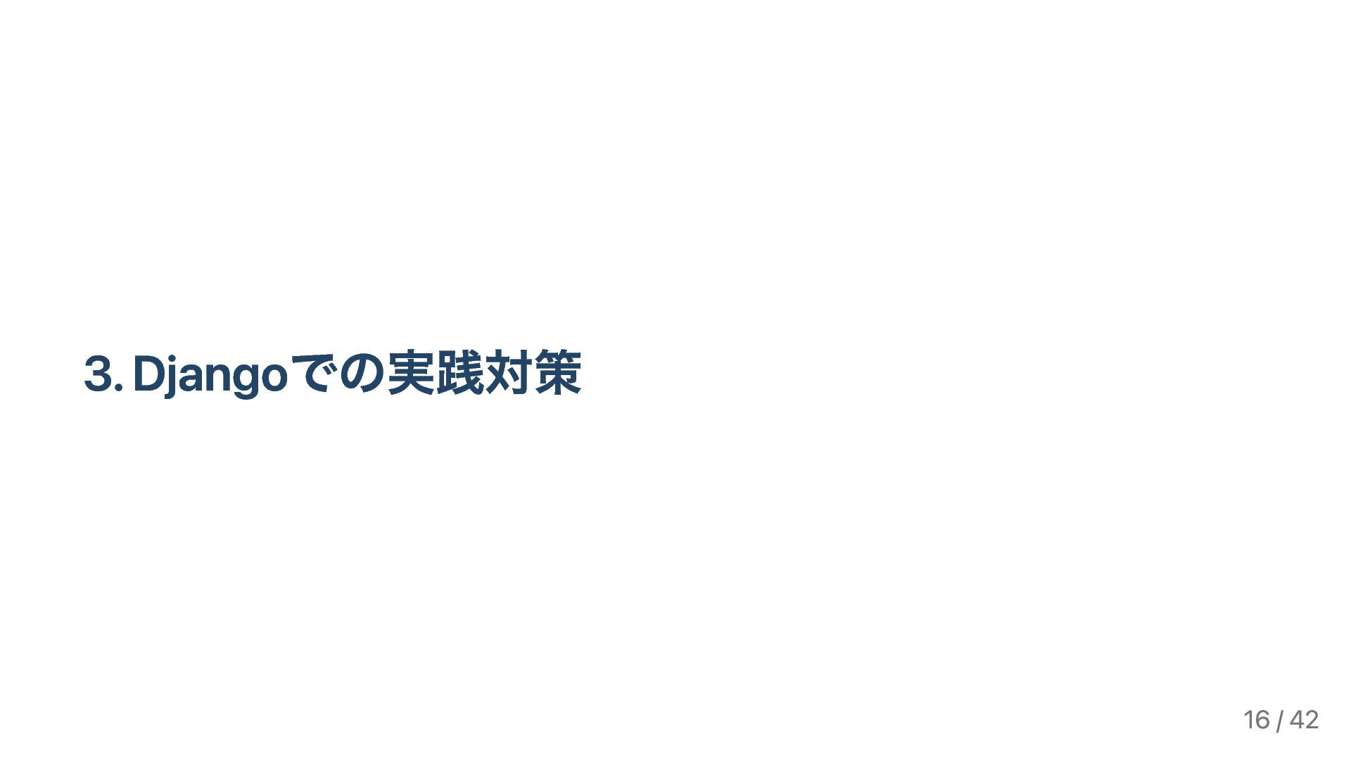 ["'self'", "js.cdn.com/example/"] django-csp を活用し report-only 運用から始める 次第により厳格なCSPである nonce- もしくは hash- ベース にしていく Django 6.0(2025年12月予定)で標準対応予定 [1] https://pypi.org/project/django-csp/ 22 / 42