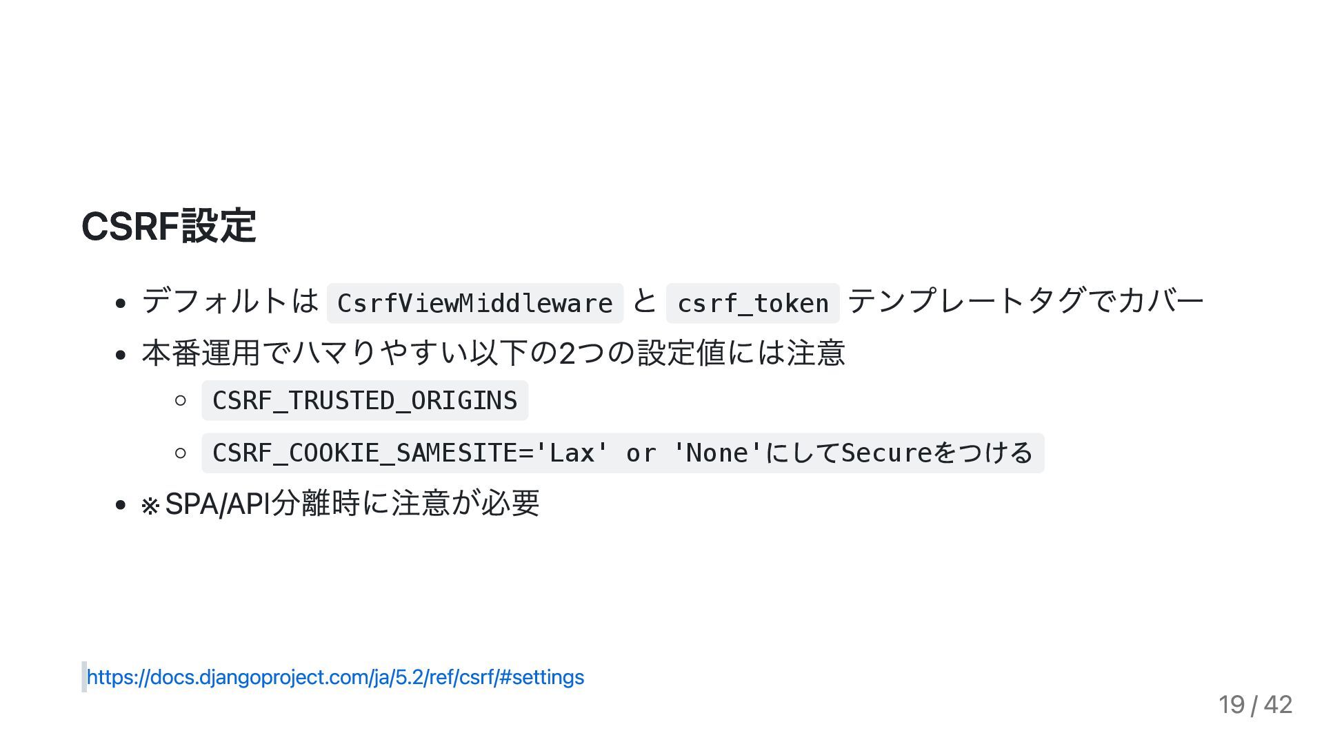 True SECURE_HSTS_SECONDS = 31536000 # 1年 → HTTPS, Cookie保護, HSTS 17 / 42