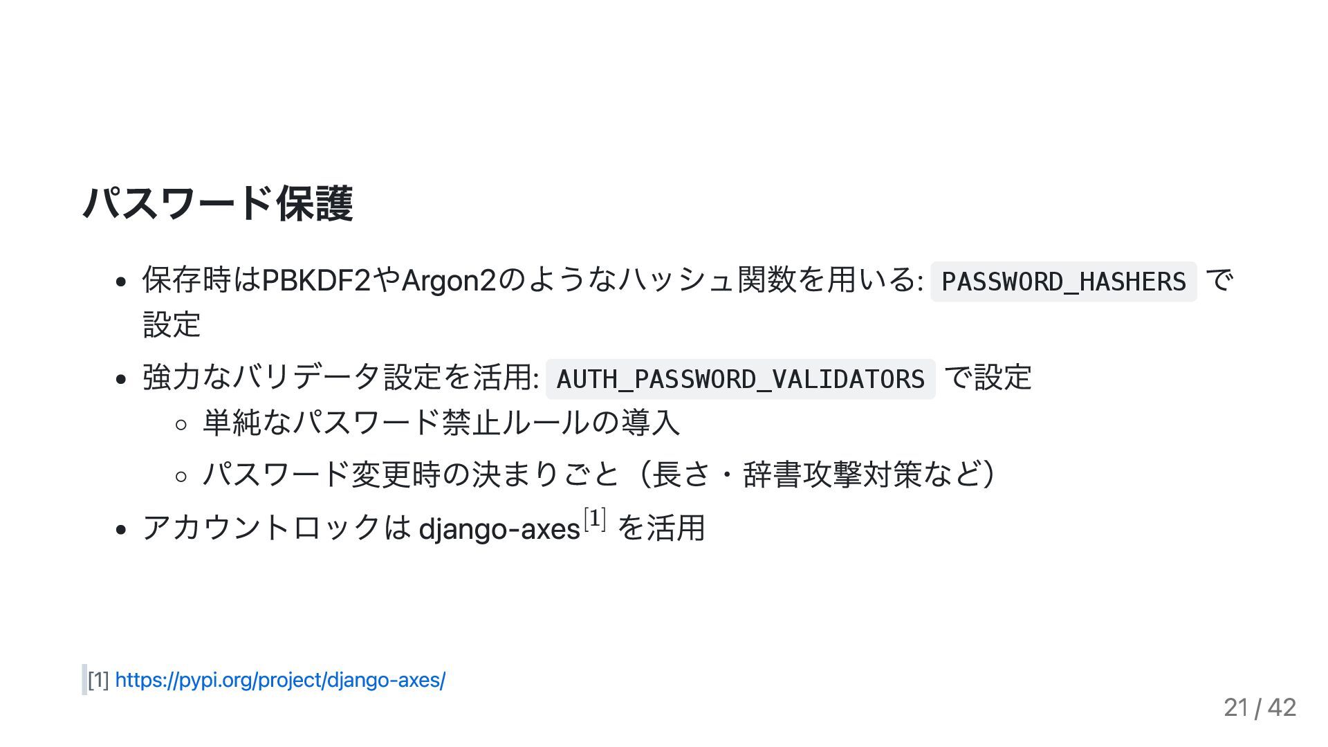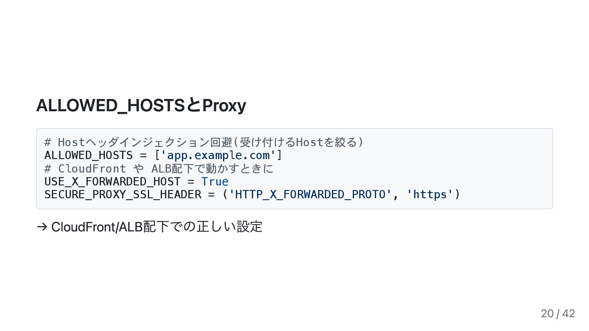 USE_X_FORWARDED_HOST = True SECURE_PROXY_SSL_HEADER = ('HTTP_X_FORWARDED_PROTO', 'https') → CloudFront/ALB配下での正しい設定 20 / 42