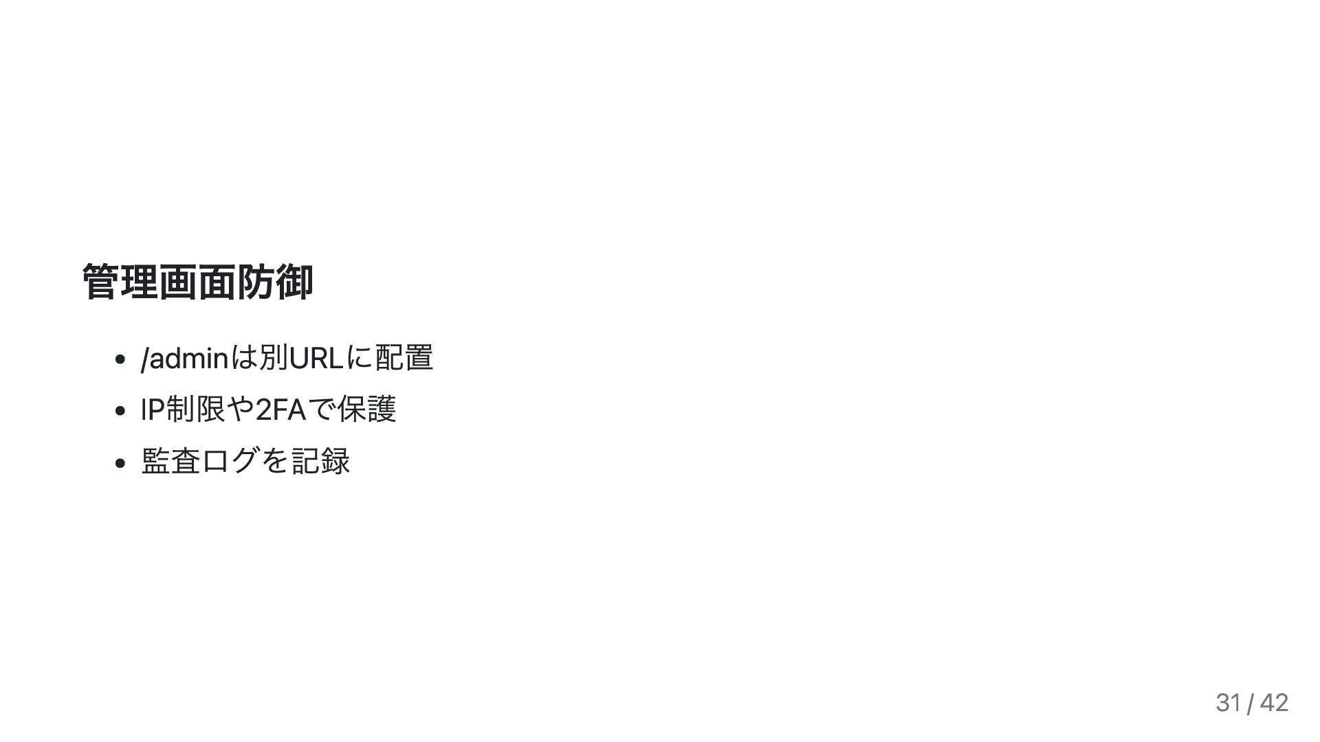 が自動で実施 Django Adminから指定するなど特殊ケースでは session.flush() キャッシュ禁止ヘッダ @never_cache デコレータを活用して no-store を付与 30 / 42