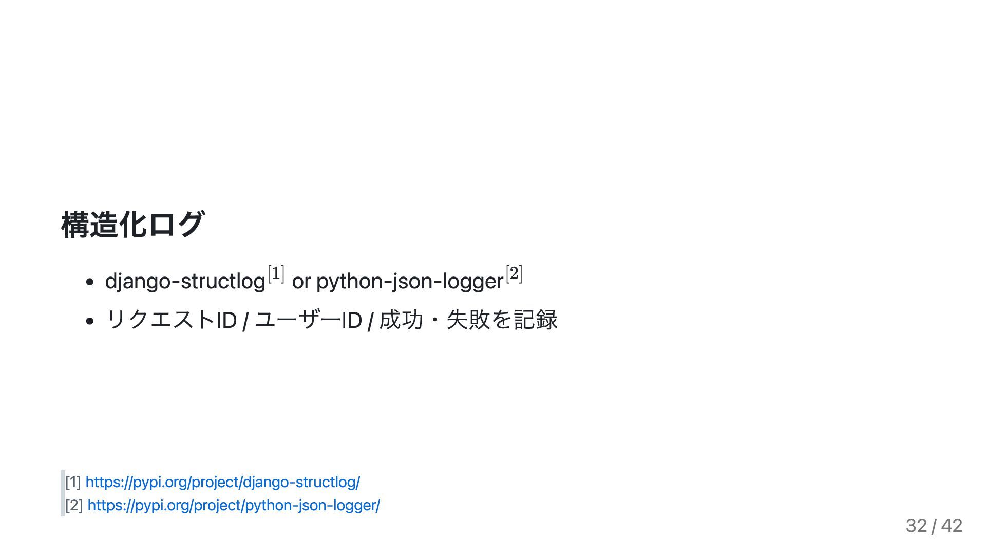 https://pypi.org/project/django-structlog/ [2] https://pypi.org/project/python-json-logger/ 32 / 42