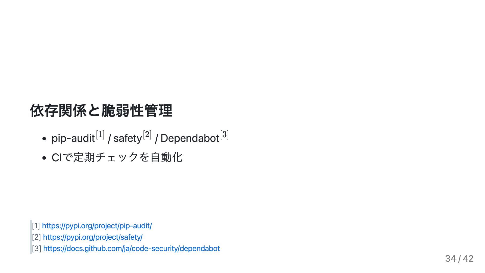 https://pypi.org/project/safety/ [3] https://docs.github.com/ja/code-security/dependabot 34 / 42
