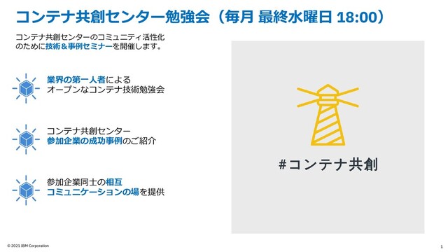 © 2021 IBM Corporation 1 コンテナ共創センター勉強会(毎月 最終水曜日 18:00) コンテナ共創センターのコミュニティ活性化 のために技術&事例セミナーを開催します。
