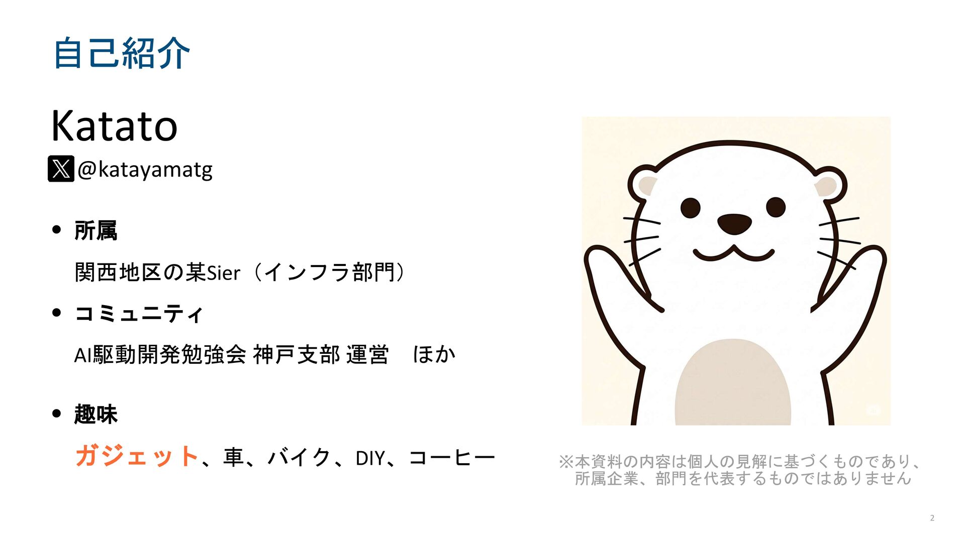 Katato • 所属 関西地区の某Sier(インフラ部門) • コミュニティ AI駆動開発勉強会 神戸支部 運営 ほか