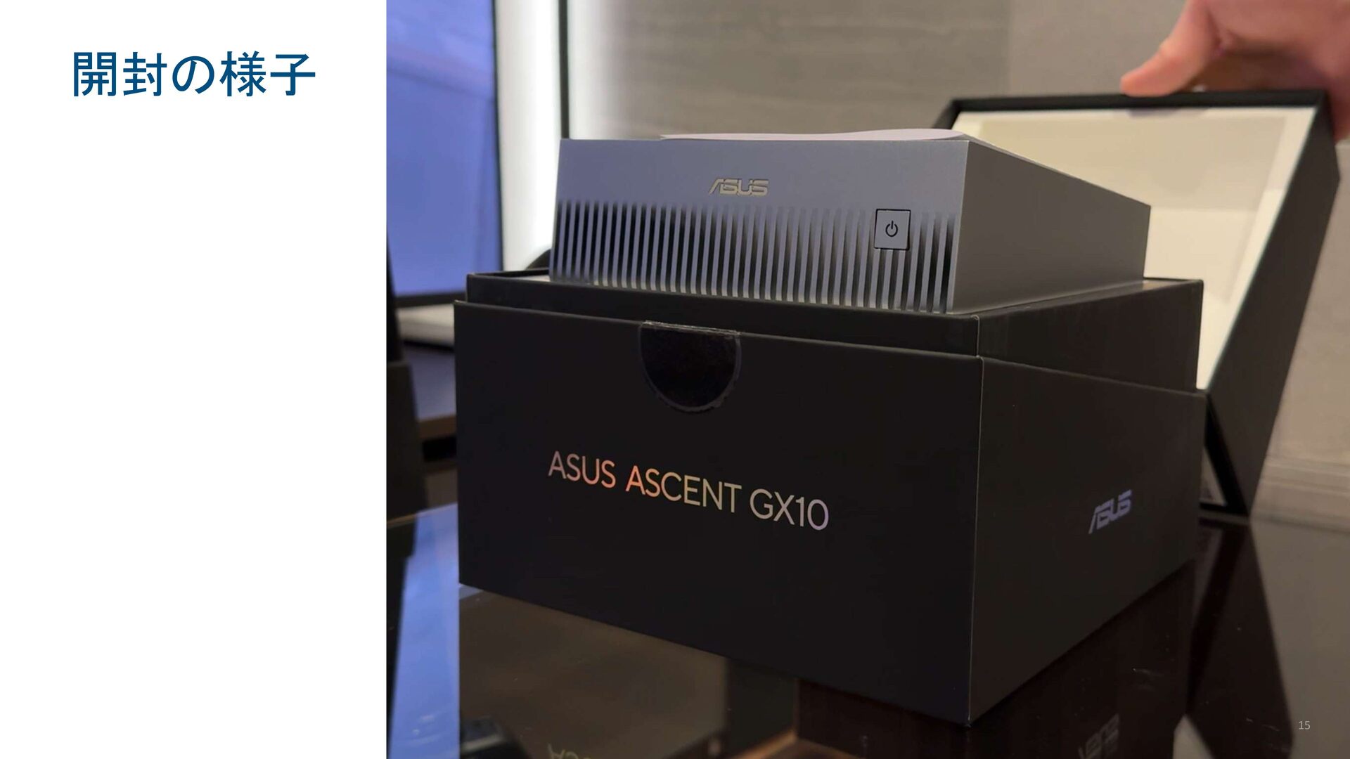 本日の内容 • 衝動買いしたASUS Ascent GX10の紹介 • 開封の様子・基本機能のご紹介 実際に使ってみて ✓ メモリ128GBの恩恵は大きい