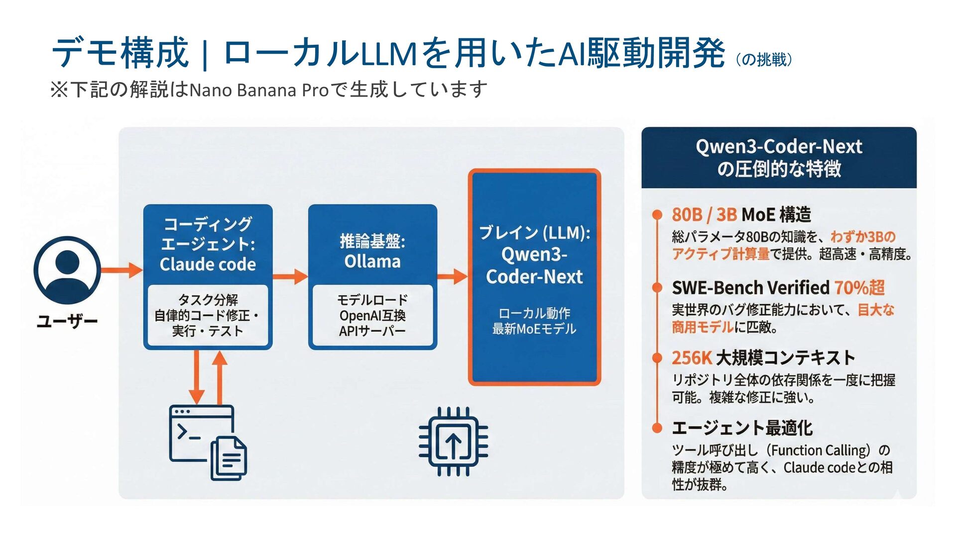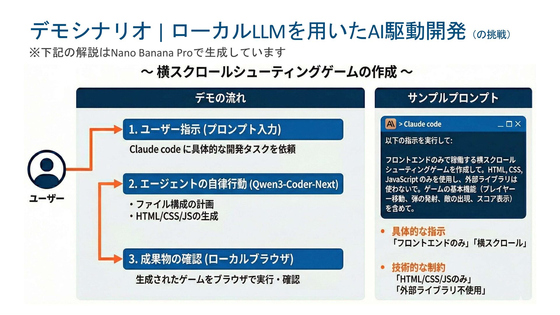 デモシナリオ | ローカルLLMを用いたAI駆動開発(の挑戦) ※下記の解説はNano Banana Proで生成しています