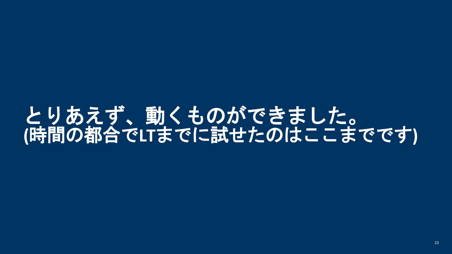 とりあえず、動くものができました。 (時間の都合でLTまでに試せたのはここまでです) 23