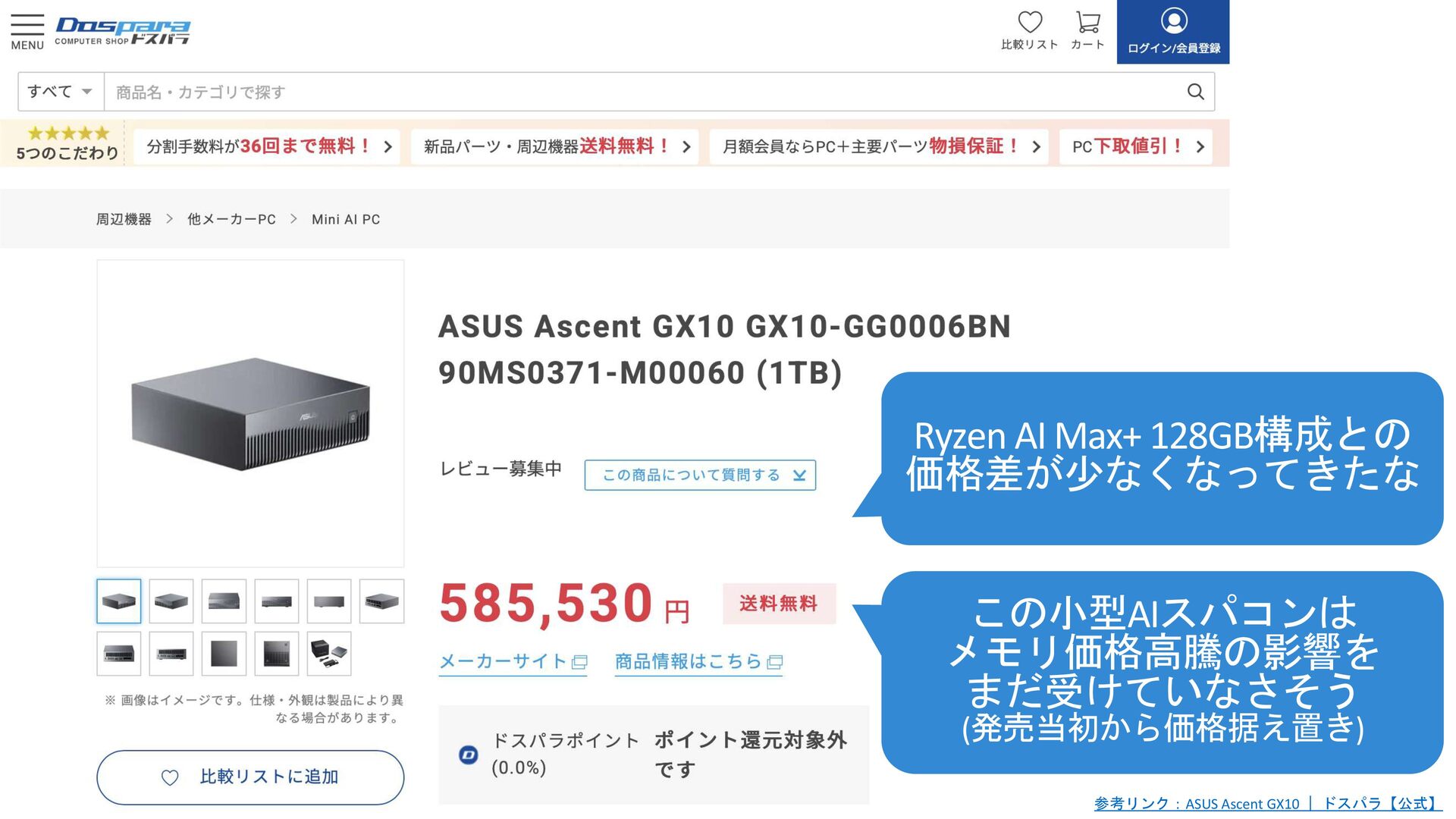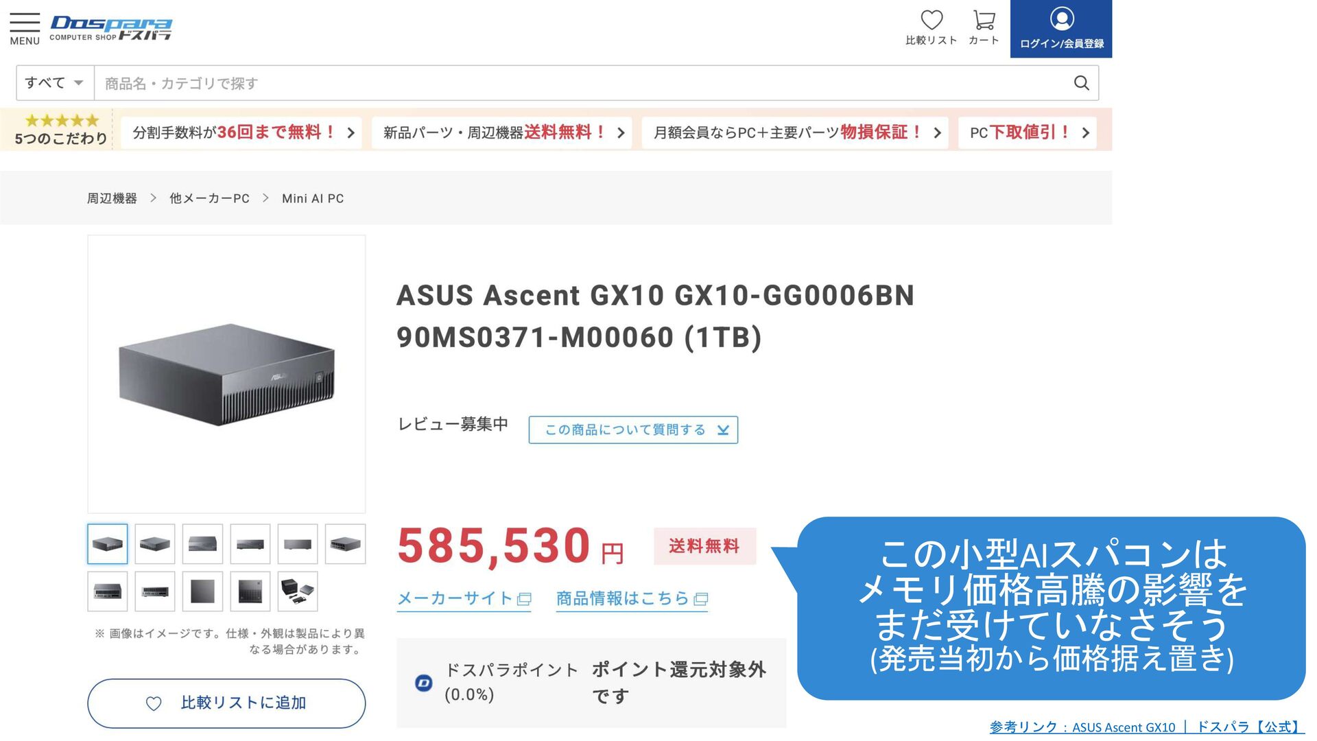 5 この小型AIスパコンは メモリ価格高騰の影響を まだ受けていなさそう (発売当初から価格据え置き) 参考リンク:ASUS Ascent GX10 | ドスパラ【公式】
