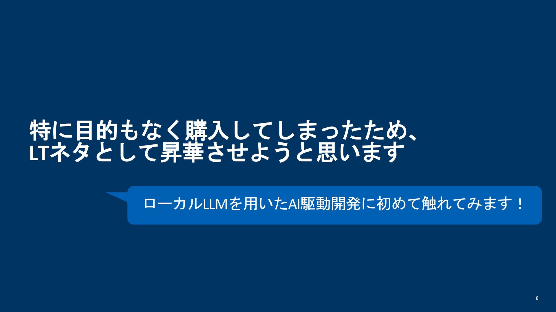 特に目的もなく購入してしまったため、 LTネタとして昇華させようと思います 8 ローカルLLMを用いたAI駆動開発に初めて触れてみます!