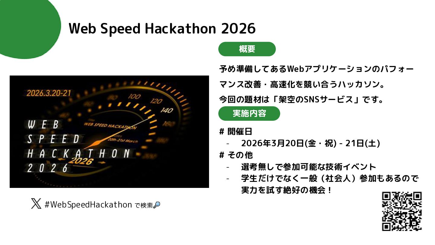 2026年3月20日(金・祝) - 21日(土) # その他 - 選考無しで参加可能な技術イベント - 学生だけでなく一般(社会人)参加もあるので 実力を試す絶好の機会! 概要 実施内容 #WebSpeedHackathon で検索