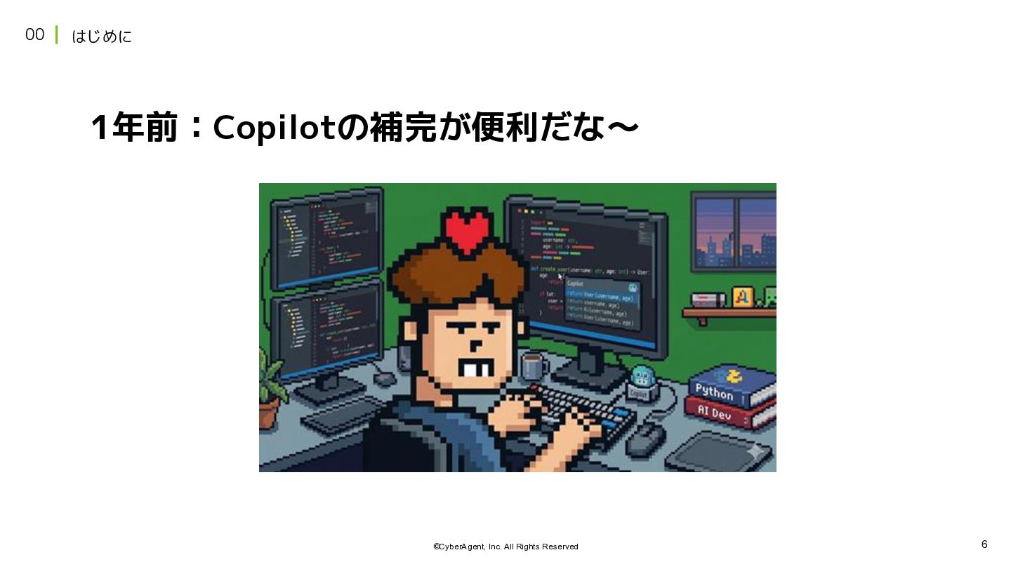 6 ©CyberAgent, Inc. All Rights Reserved 00 はじめに 1年前:Copilotの補完が便利だな〜