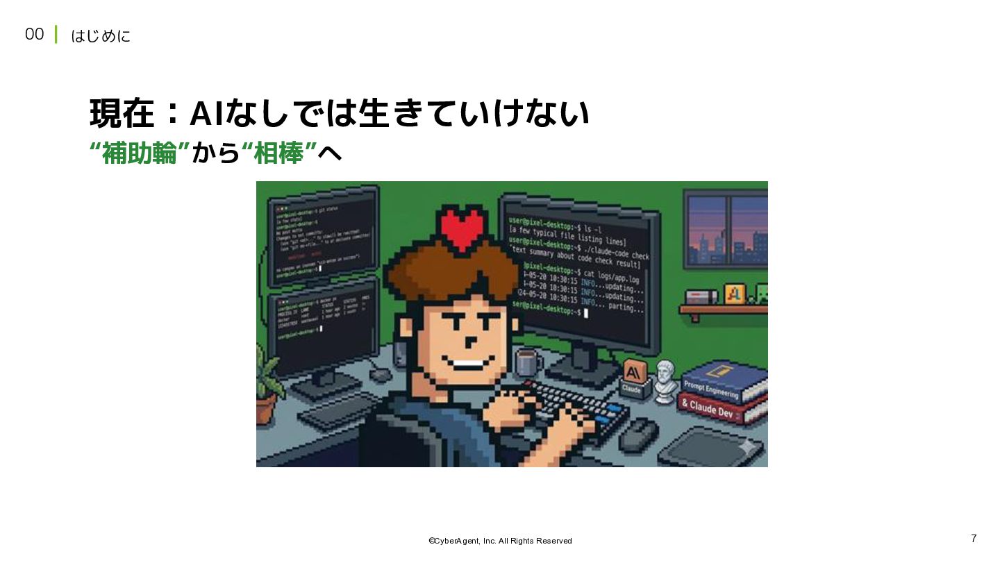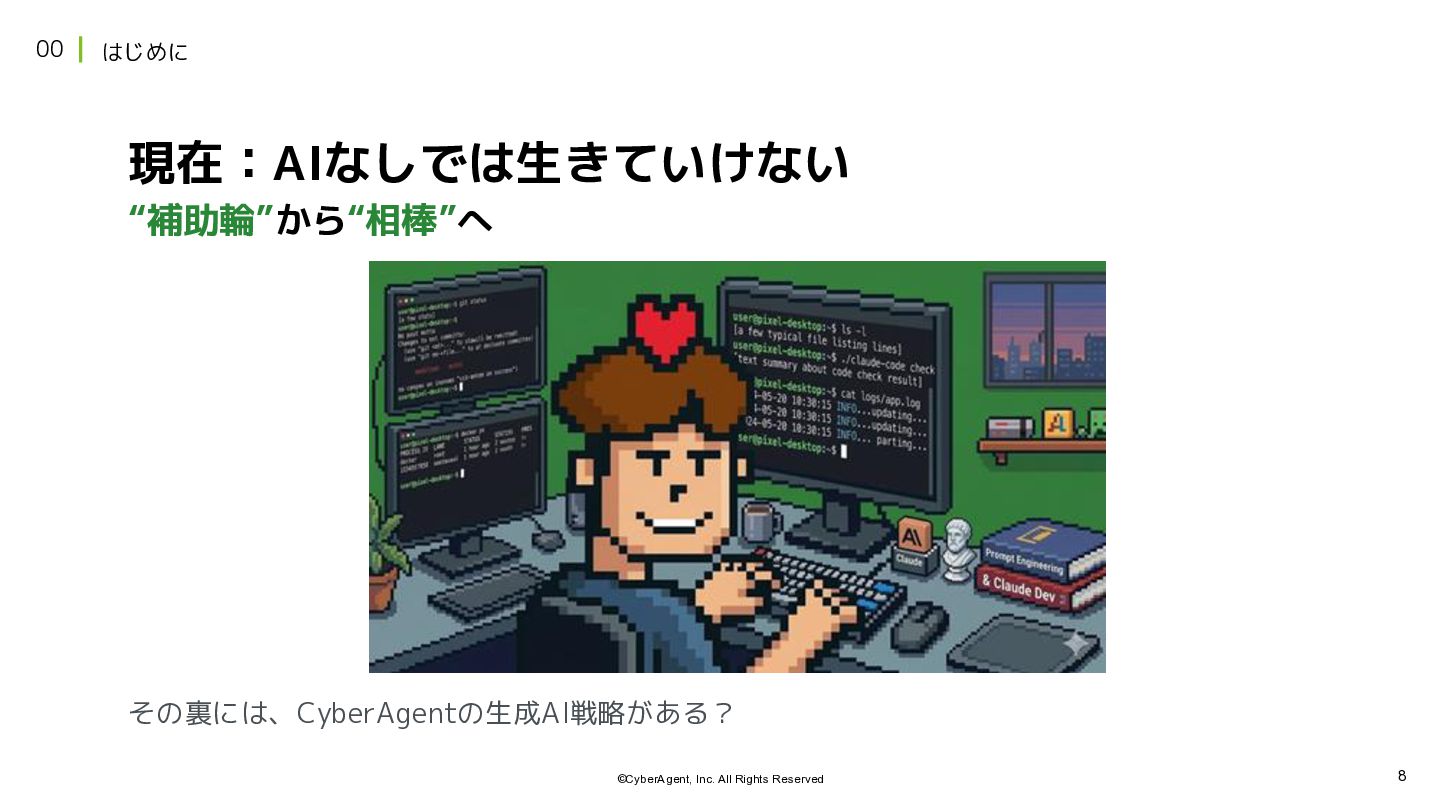 7 ©CyberAgent, Inc. All Rights Reserved 00 はじめに 現在:AIなしでは生きていけない “補助輪”から“相棒”へ