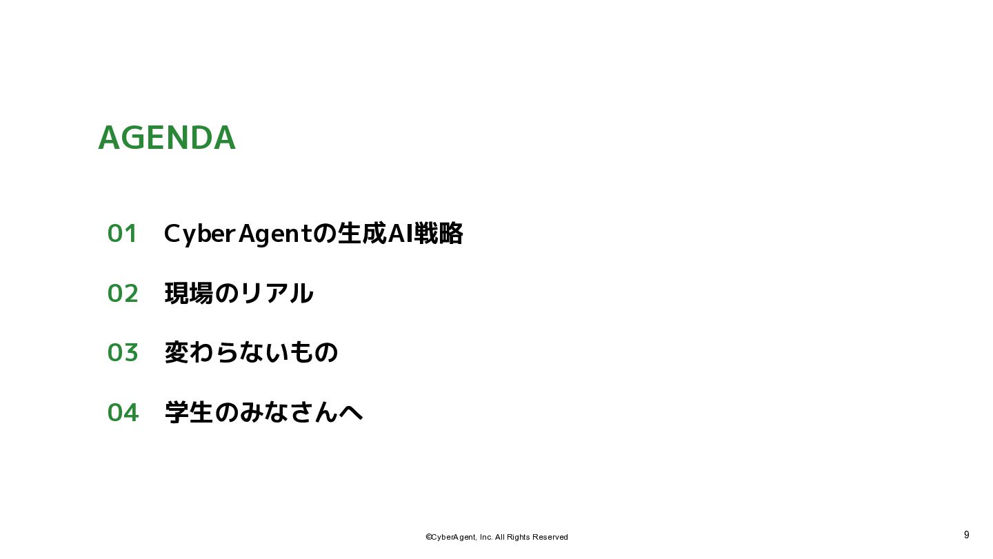 9 ©CyberAgent, Inc. All Rights Reserved AGENDA 01 CyberAgentの生成AI戦略 02