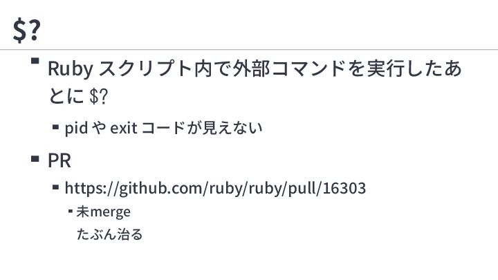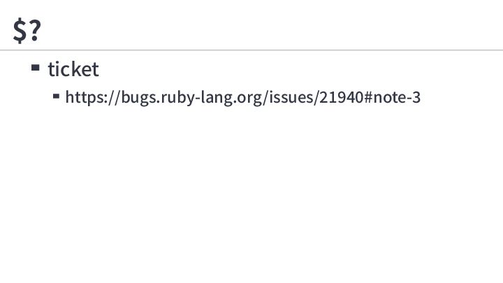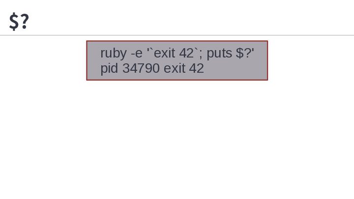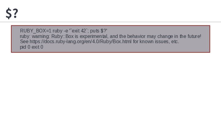 2. $? RUBY_BOX=1 ruby -e '`exit 42`; puts $?' ruby: warning: