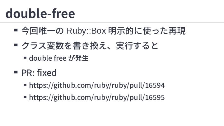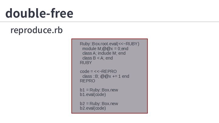 3. double-free reproduce.rb Ruby::Box.root.eval(<<~RUBY) module M;@@x = 0;end class A; include