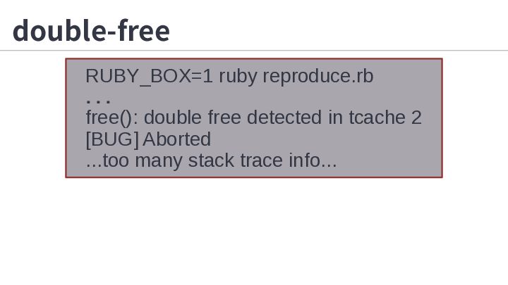 4. double-free RUBY_BOX=1 ruby reproduce.rb ... free(): double free detected in