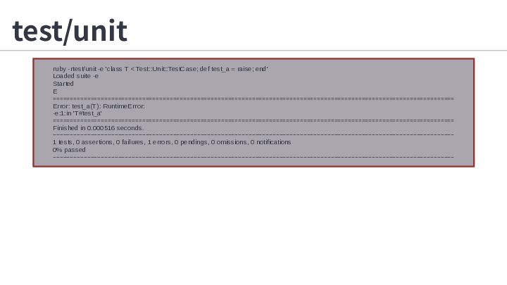 5. test/unit ruby -rtest/unit -e 'class T < Test::Unit::TestCase; def test_a