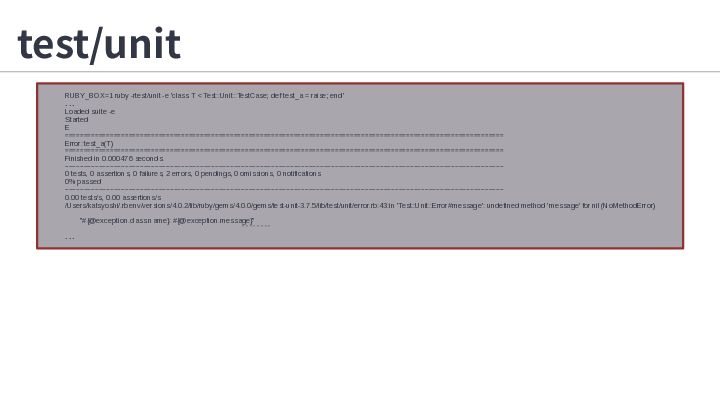 6. test/unit RUBY_BOX=1 ruby -rtest/unit -e 'class T < Test::Unit::TestCase; def
